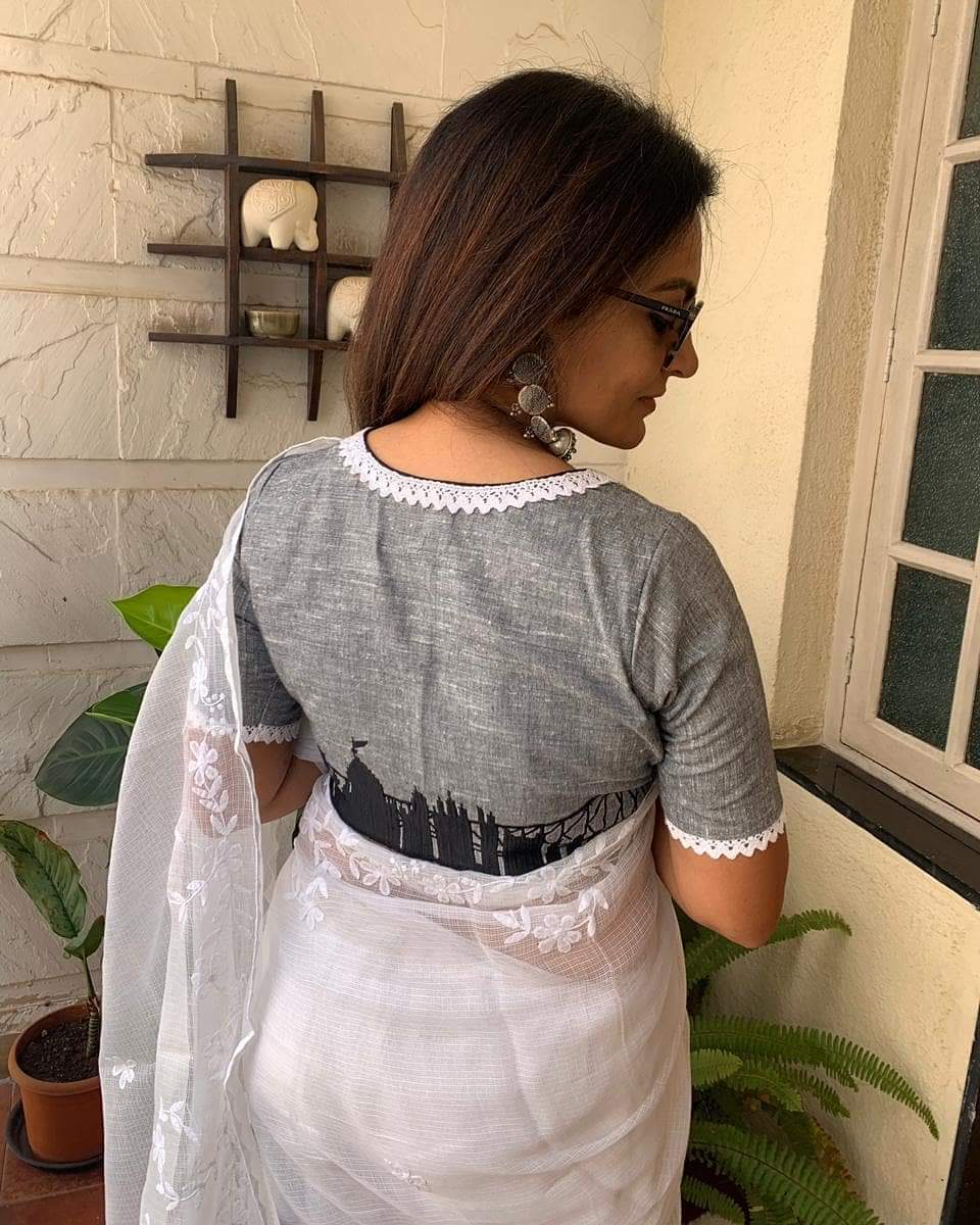 Our quintessential Calcutta skyline silhoutte is embroidered on the back of a blouse.