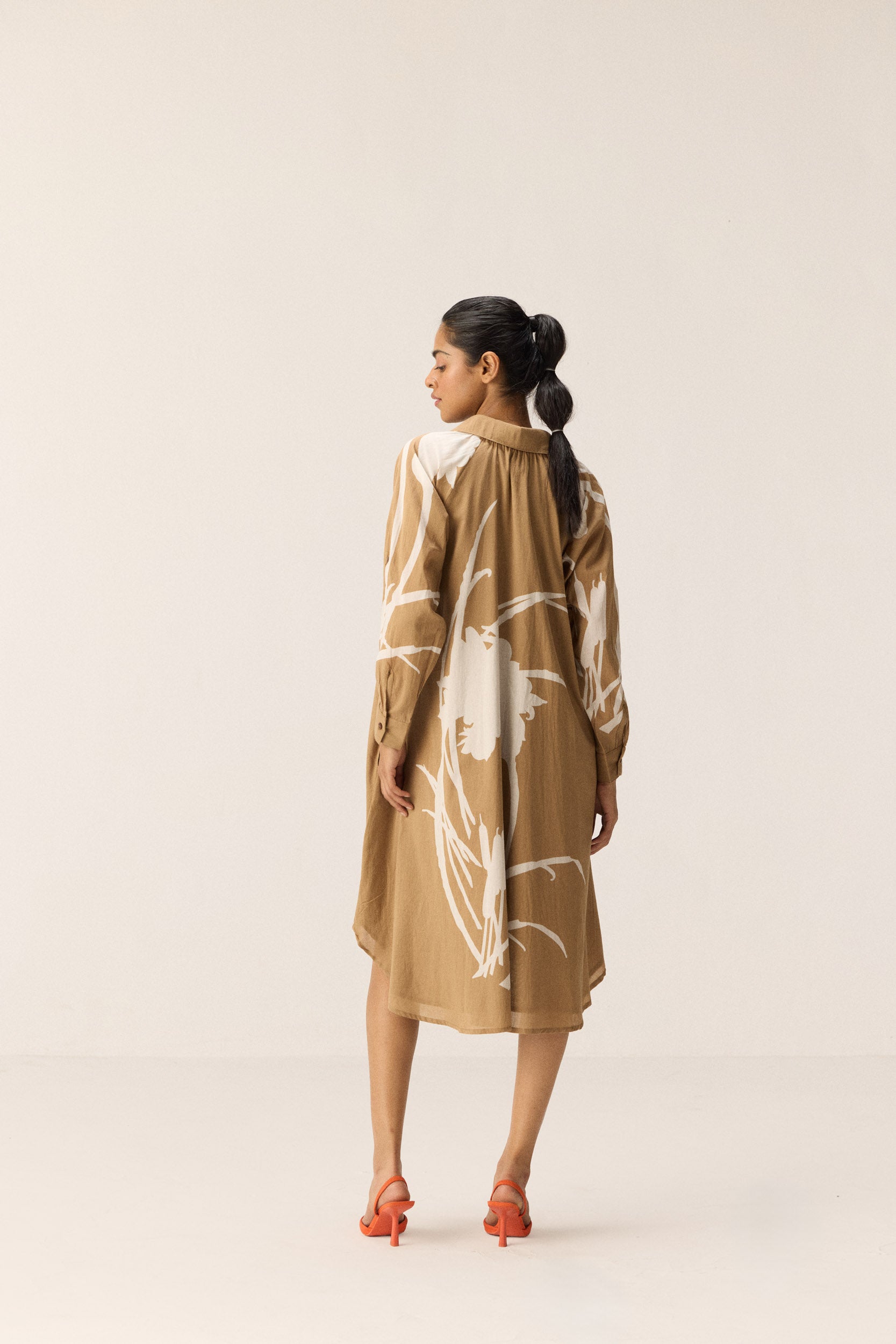 A versatile camel brown shirt dress featuring an abstract white print on the front. With classic collars and practical pockets, it’s designed for effortless style and comfort—perfect for relaxed day outings.