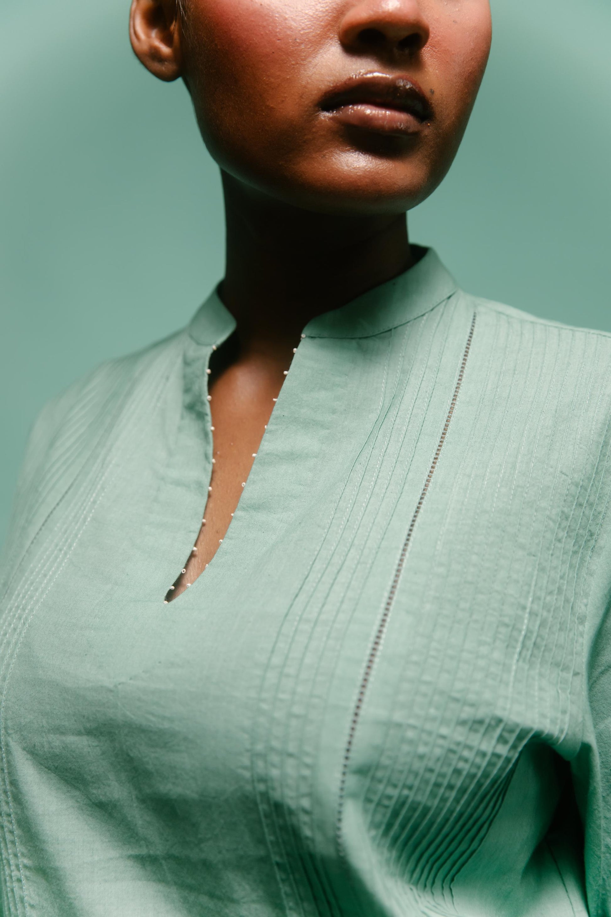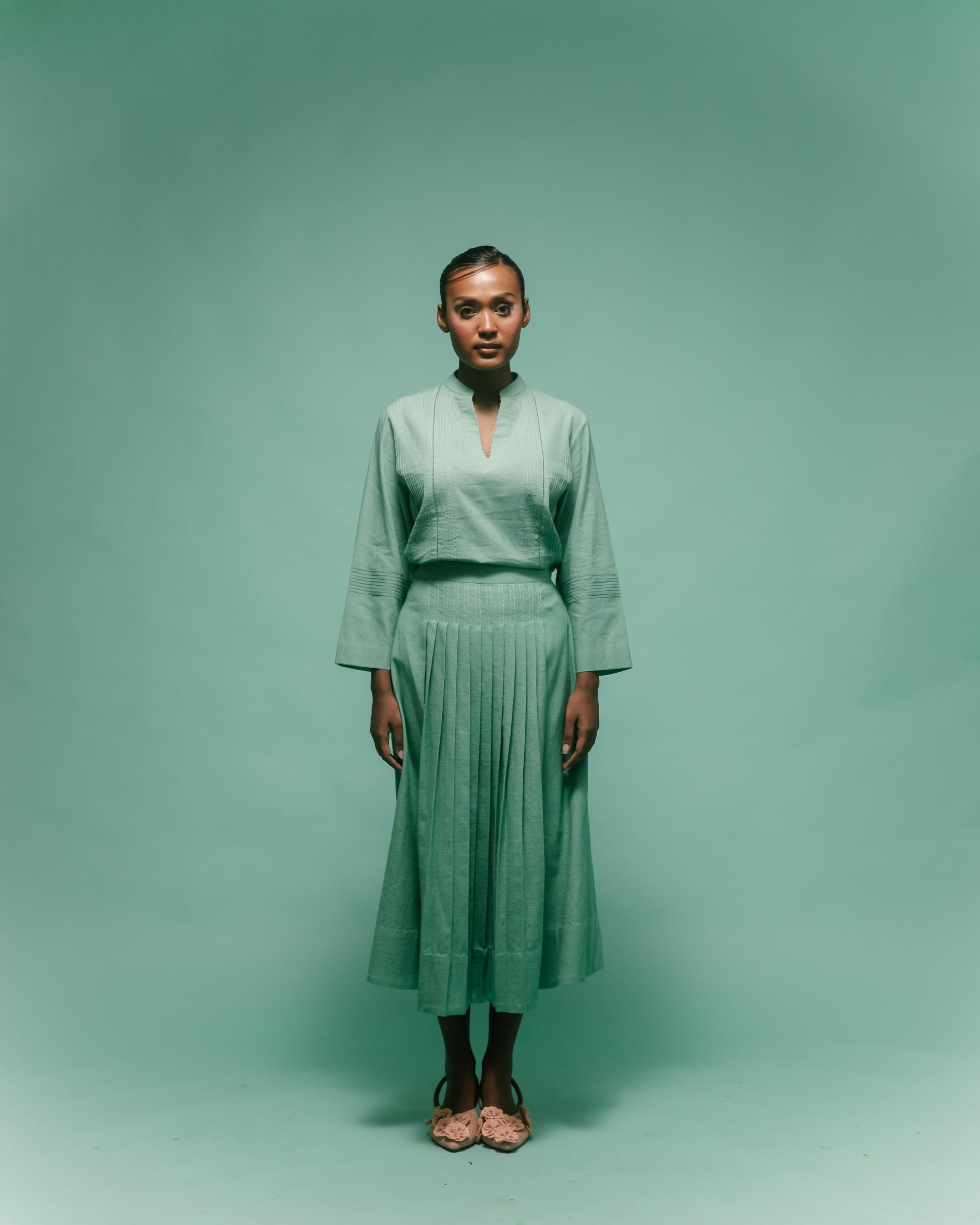 Pin tuck muslin blouse with pleated skirt