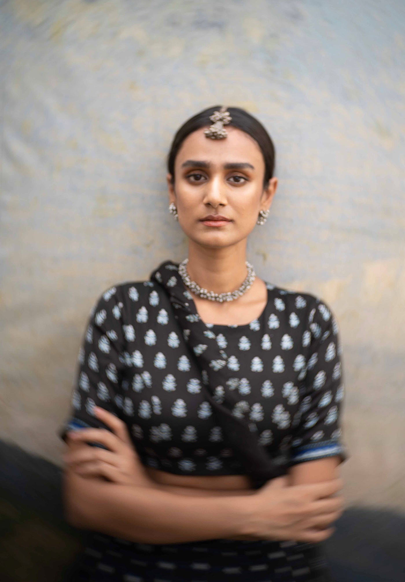 The Chand Lehenga displays the striking hues of blue against black, featuring  hand block printed mughal motifs of flora and leaves . the lehenga is paired with a handblock printed  silk organza dupatta finished with a satin piping.