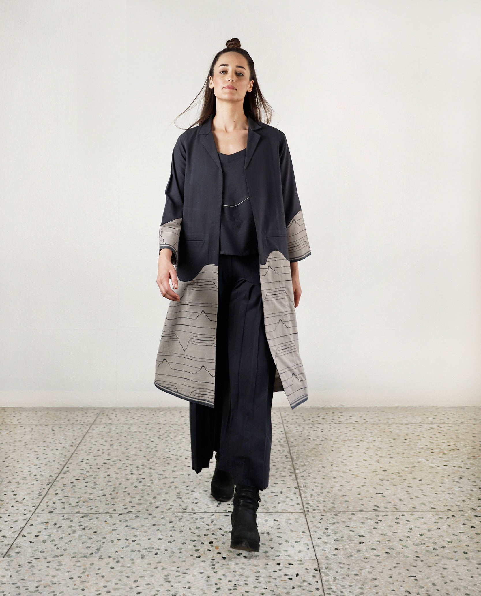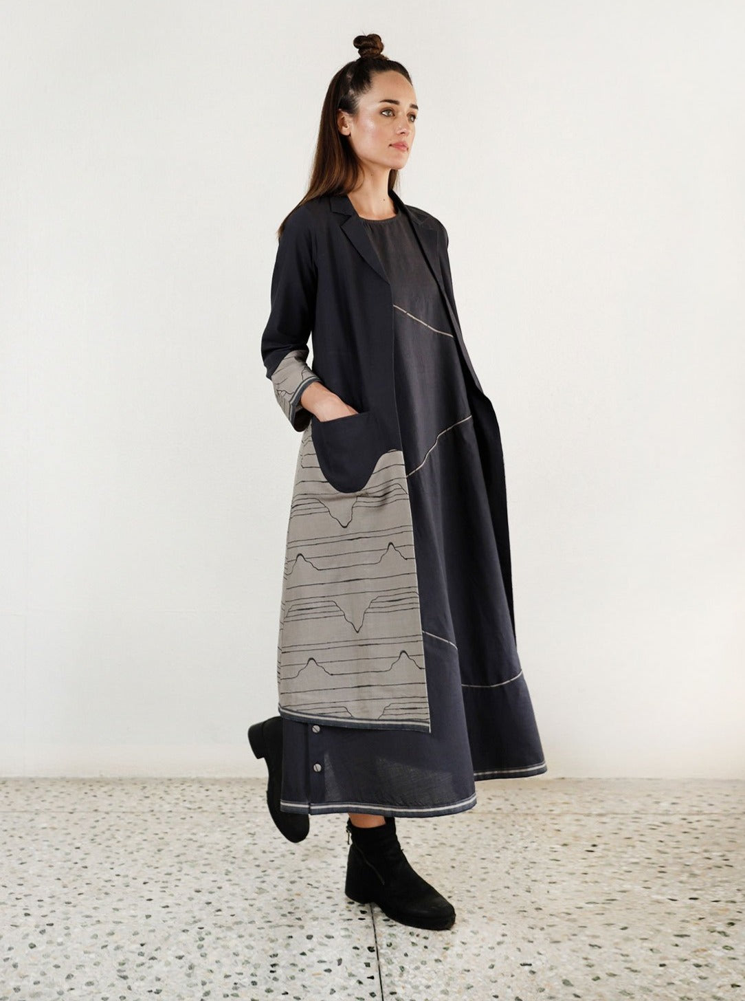 Our favourite ,Collared overlay featuring long sleeves with unevenly seamed two beautiful fabric creating a wave of art . Cut and stitched unevenly Made out of indigenous fine cotton with hand block print. .