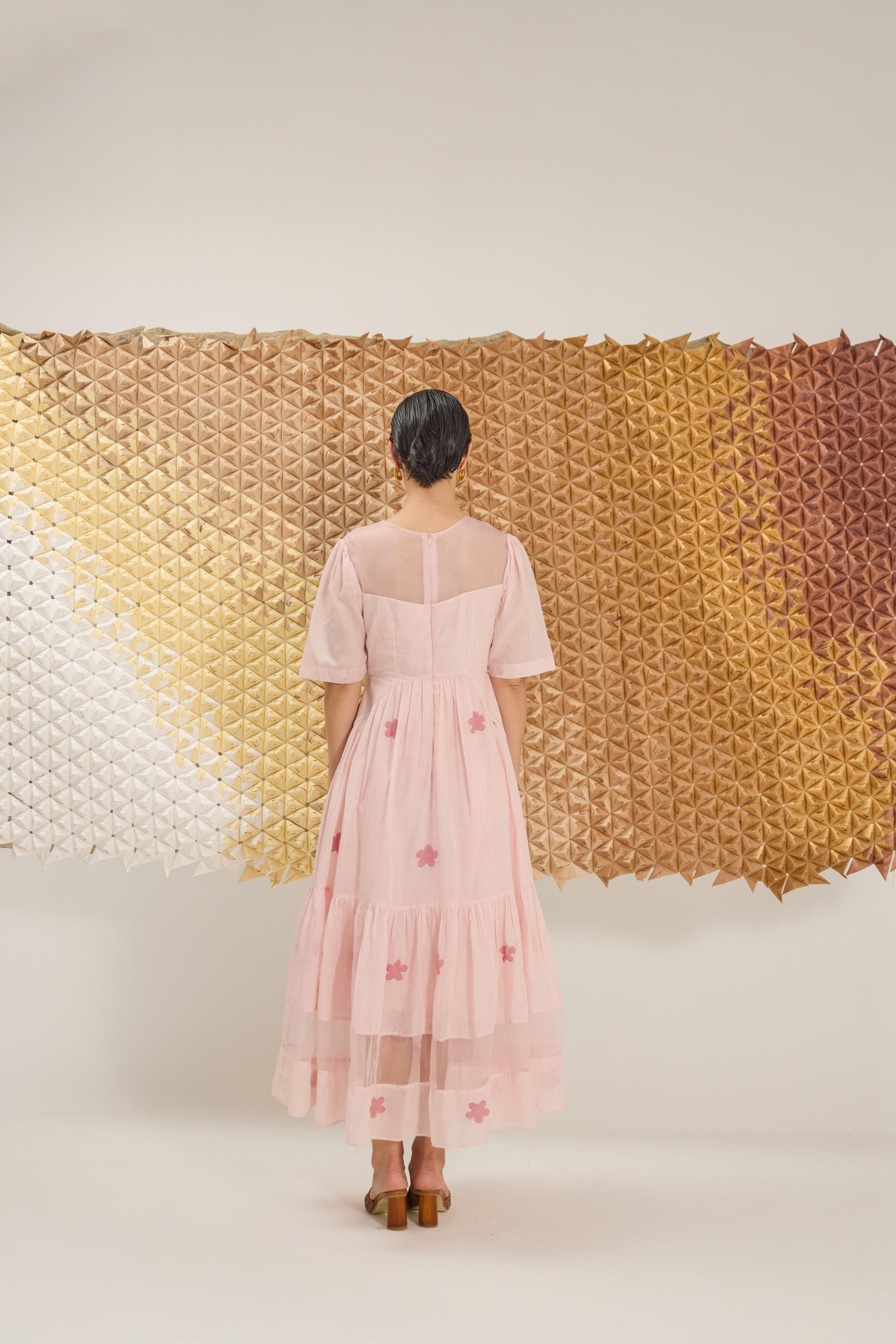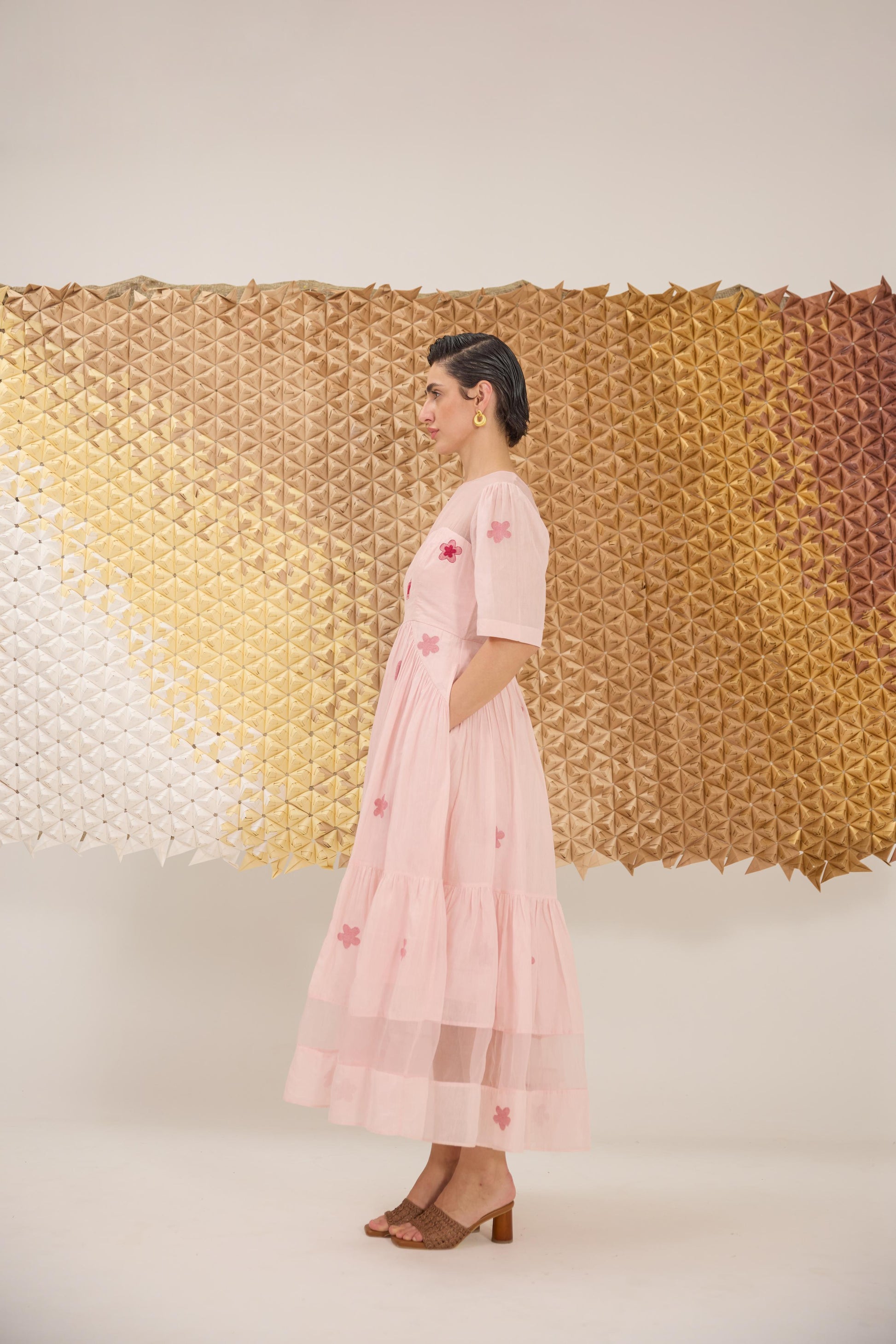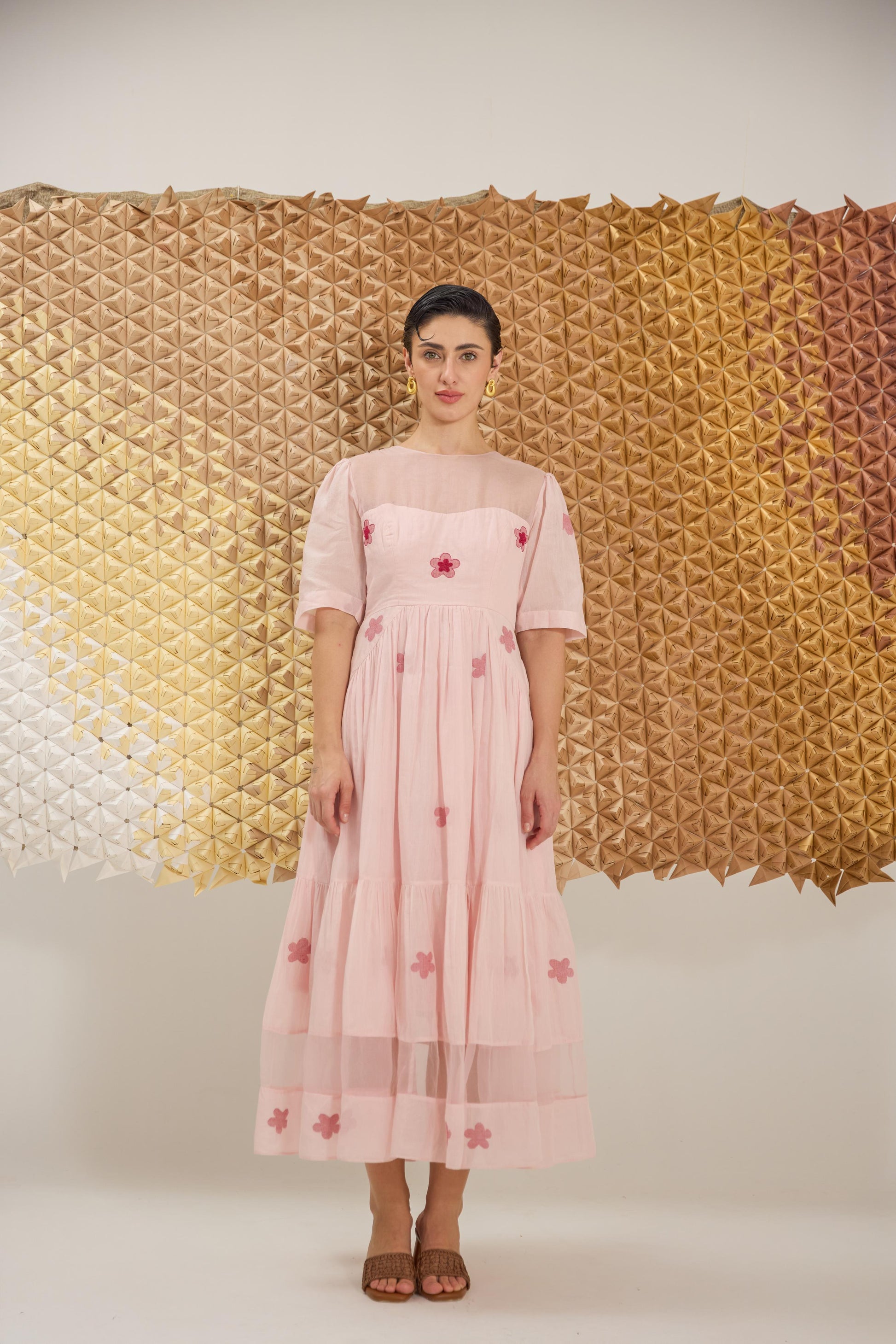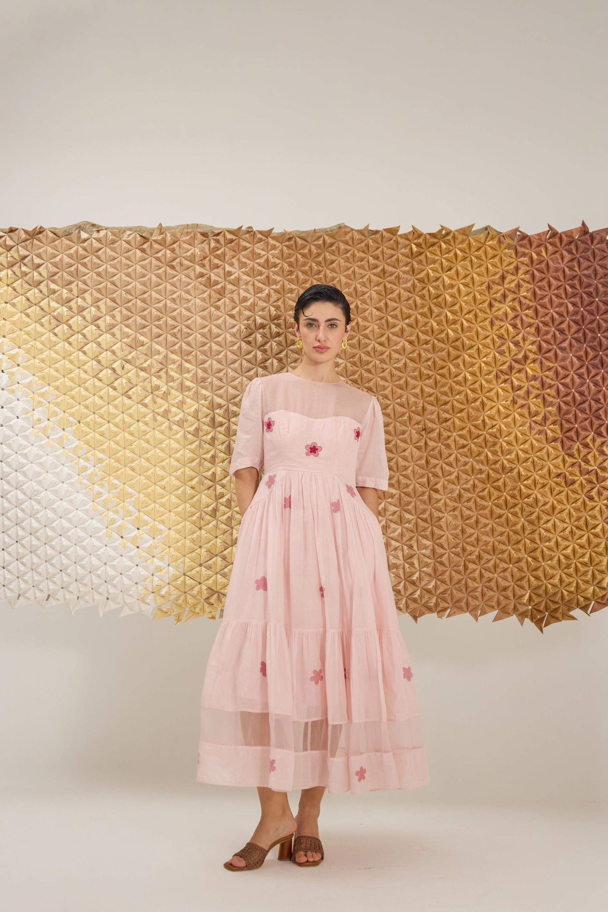 A delicate A-line dress with fluttering sleeves, reminiscent of cherry blossom petals gently falling. Crafted in a soft pink hue from handwoven cotton silk in floral Jamdani weave technique and the strategic use of Organza give the dress an airy, springtime feel, embellished with hand embroidery.