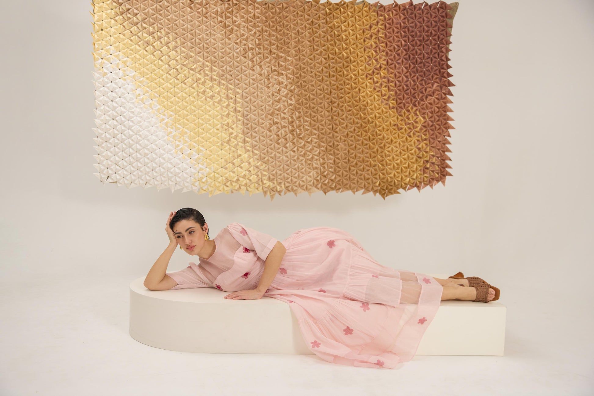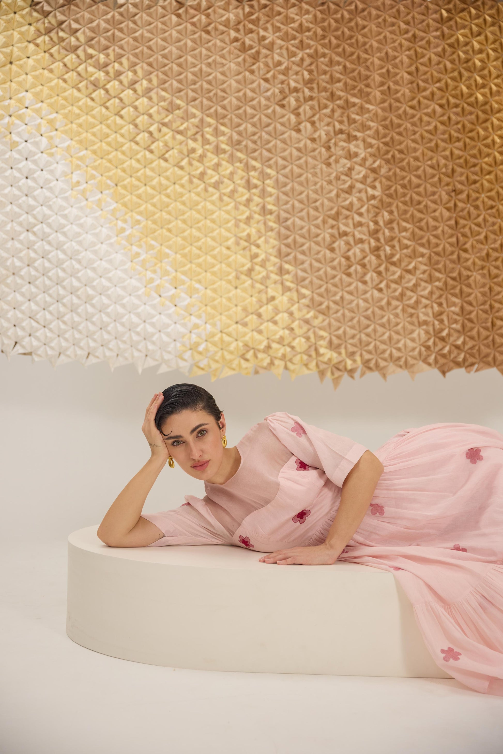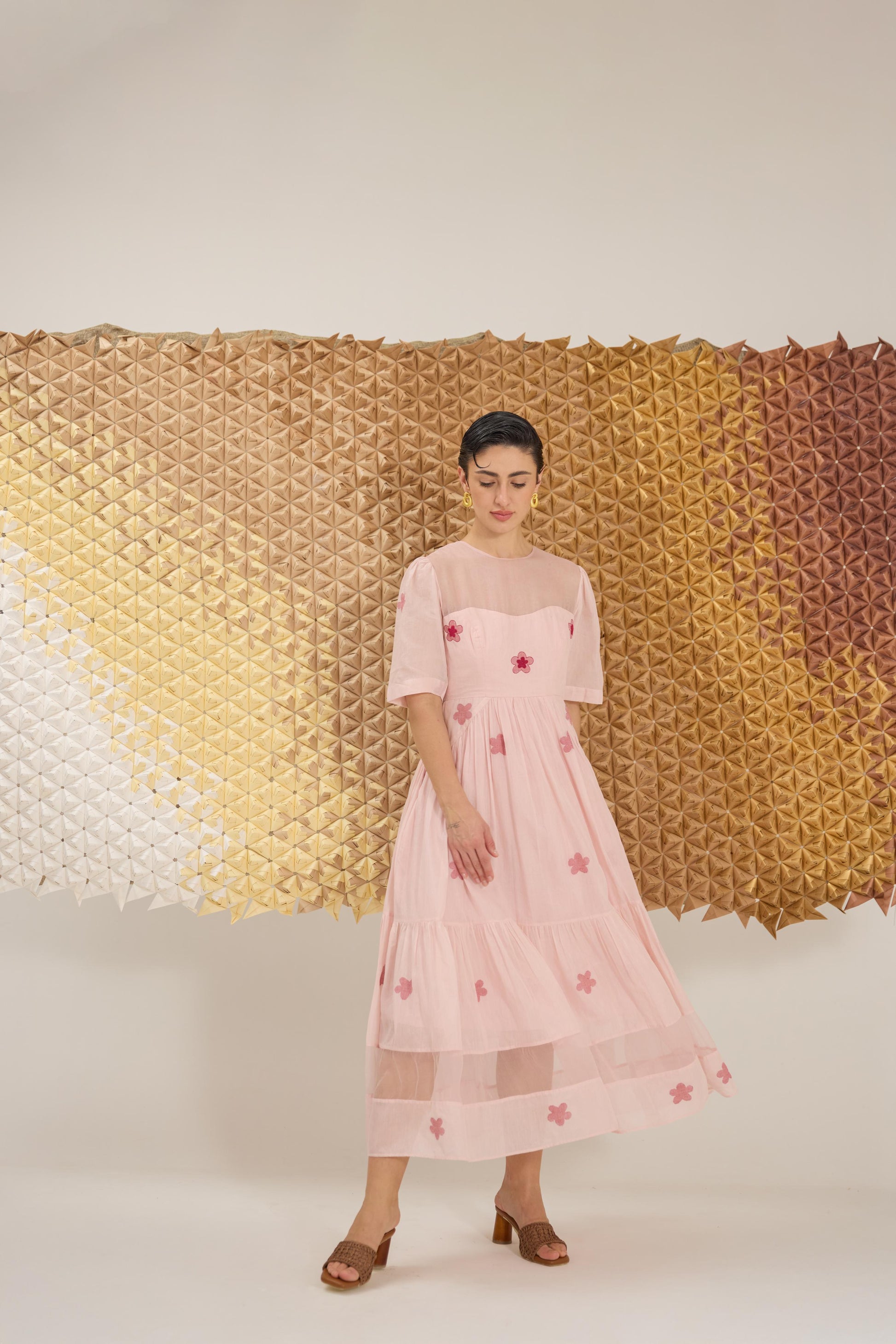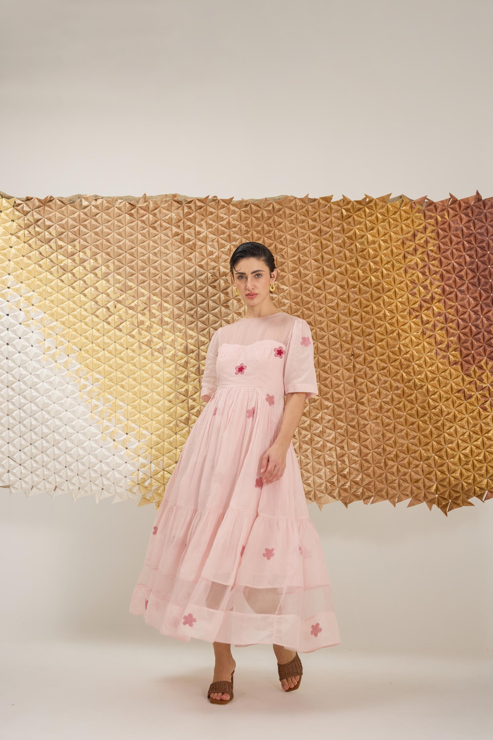 A delicate A-line dress with fluttering sleeves, reminiscent of cherry blossom petals gently falling. Crafted in a soft pink hue from handwoven cotton silk in floral Jamdani weave technique and the strategic use of Organza give the dress an airy, springtime feel, embellished with hand embroidery.