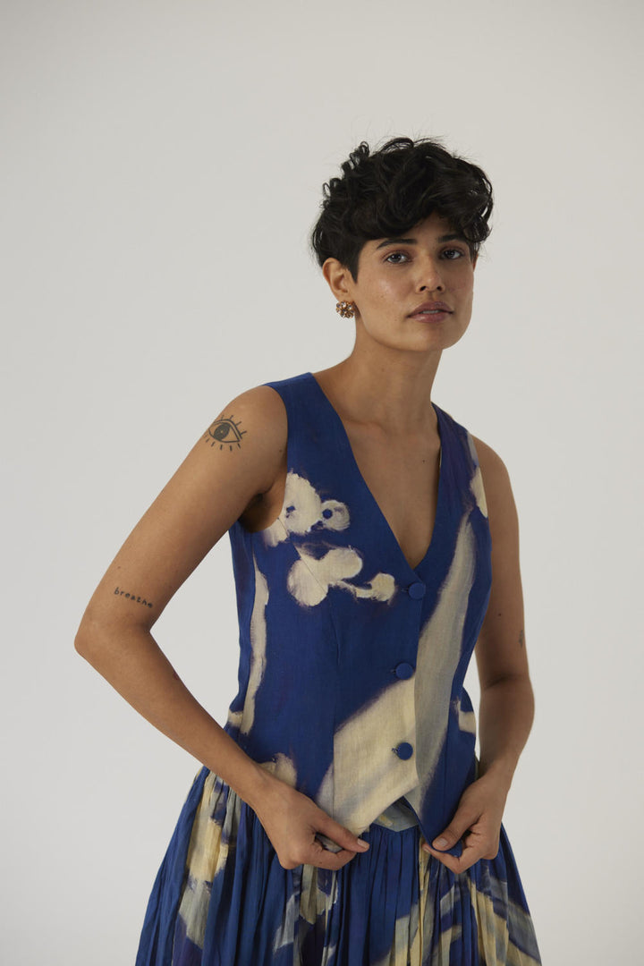 The print features a striking royal blue color features massive hand-painted leaves of distinct shapes and designs. This dress is crafted in the Chicory print carefully printed on Cotton Satin.