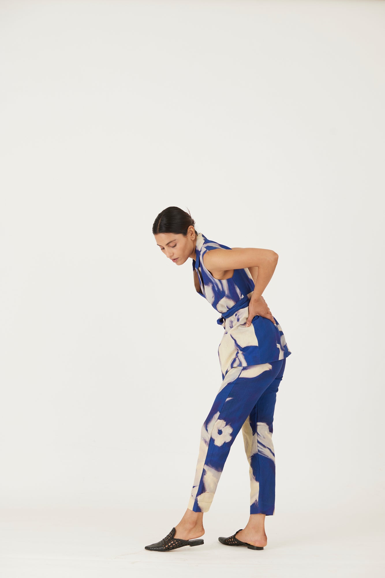 The print features a striking royal blue color features massive handpainted leaves of distinct shapes and designs.
