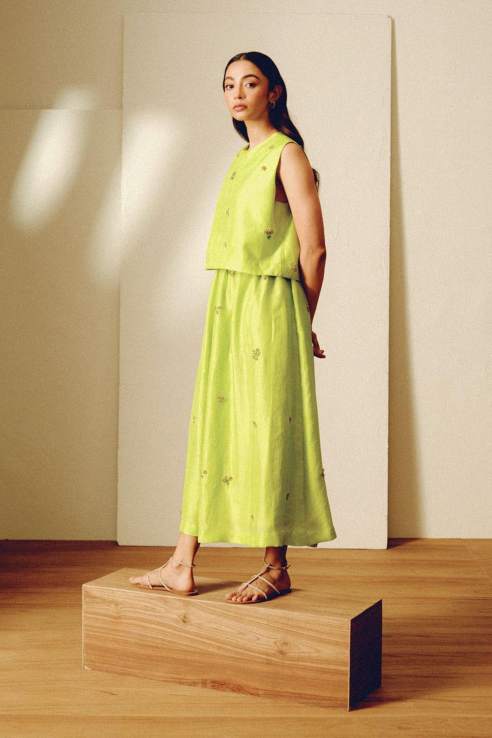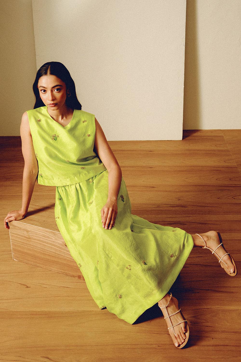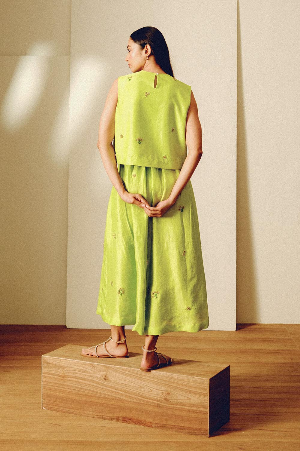 Handwoven mulberry silk sleeveless top with hand embroidered bead motifs. The top is paired with a solid matching embroidered midi skirt.
