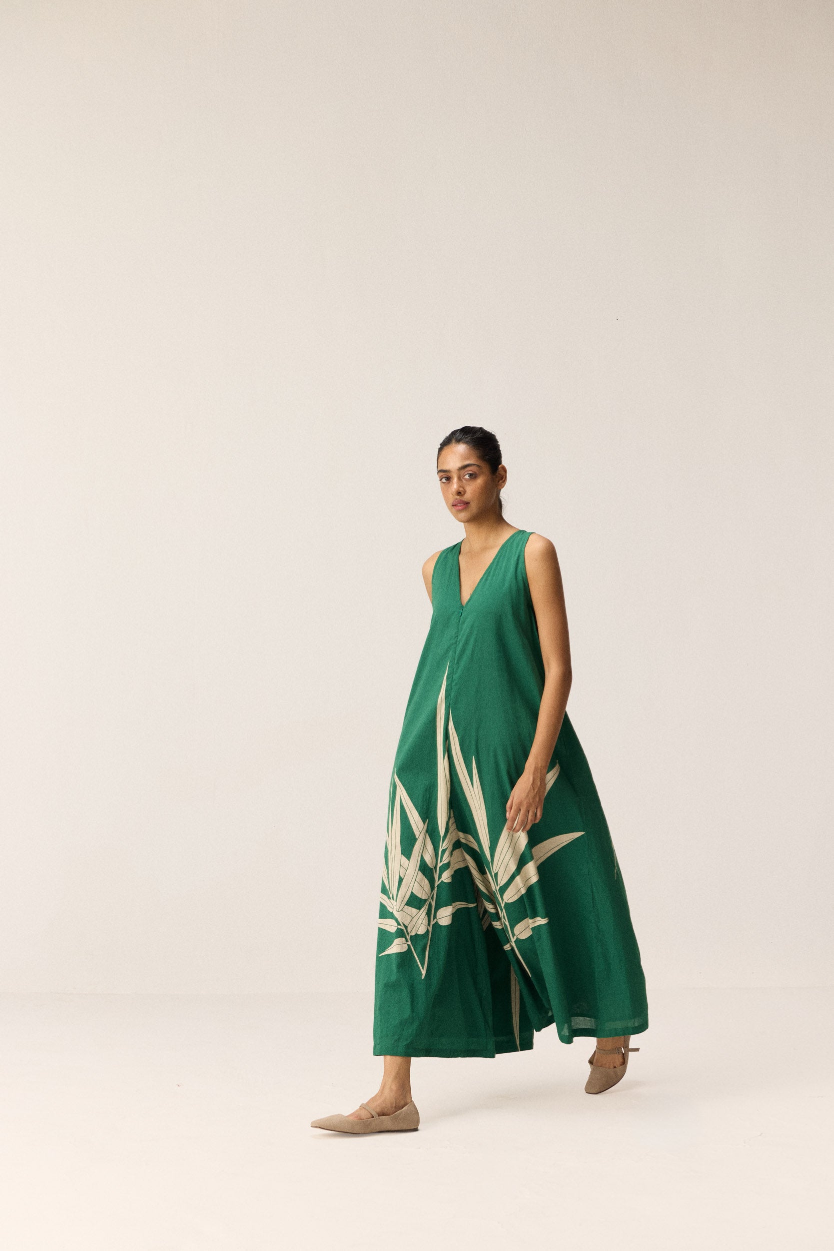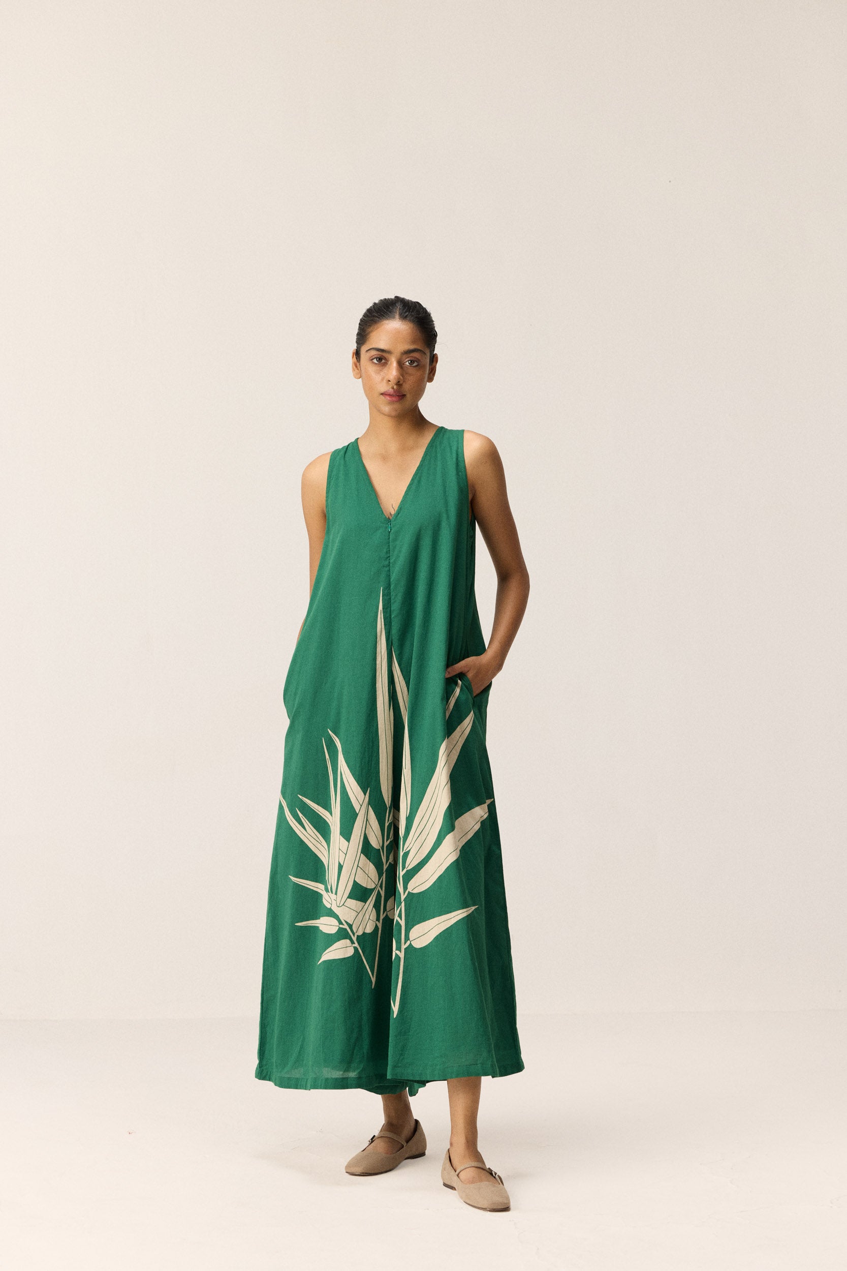 A classic Khara Kapas silhouette in a rich green hue, this cotton mul jumpsuit features a front zipper and a relaxed fit. It has a white fern print on the front. Designed with a clean structure, it combines comfort with effortless style — a versatile piece for day-to-evening wear.