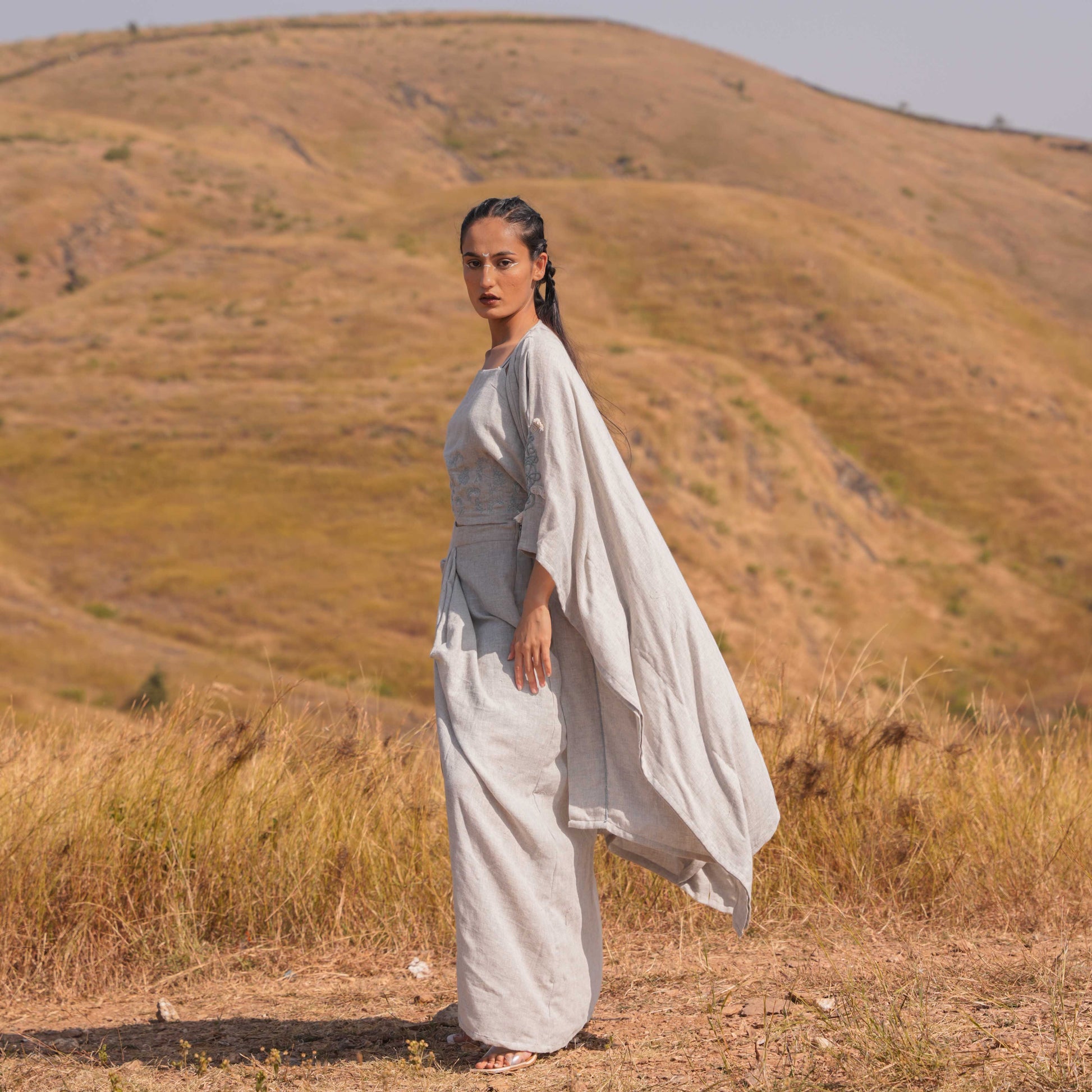A celebration of artistry and elegance, skillfully blending printed Chanderi and cotton fabrics to create a sophisticated and timeless look. The neckline is adorned with printed pleats and Katha details, adding intricate charm and texture to the ensemble.
