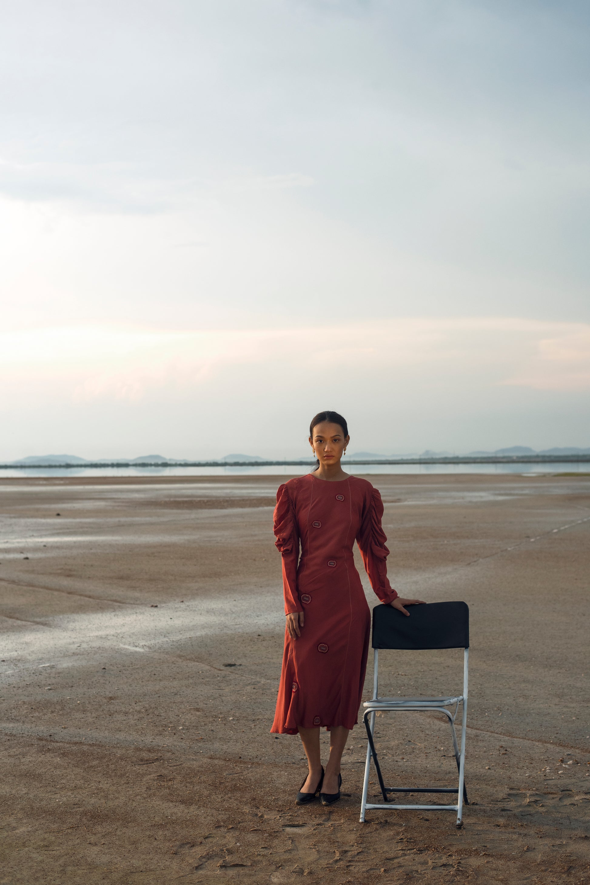 This is a crisp & edgy silhouette dress made in pure handwoven cotton silk in Prairie Sand color. This is a three panel bias cut dress with lego mutton panel sleeves with abstract coral motifs hand embroidered on the centre panel. This collection is an assorted range of textiles & handspun fabrics sourced from Banaras, Islampur, Murshidabad & quaint villages of India. The inspiration for the embellishments & embroideries has been derived from the artist Huguette Caland and her work over the years. Intricate crafts like sujani & kantha are the key embroidery techniques been used.