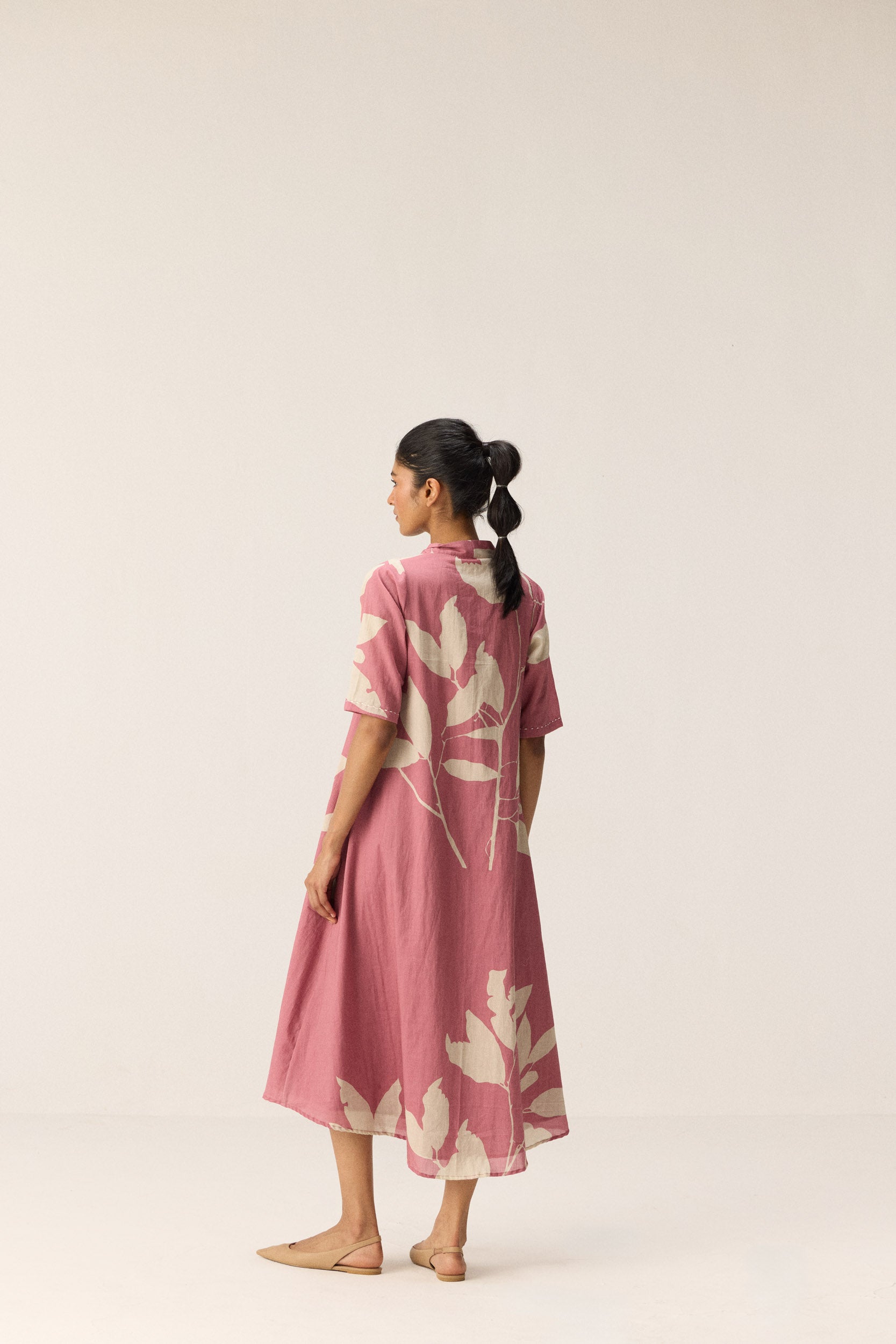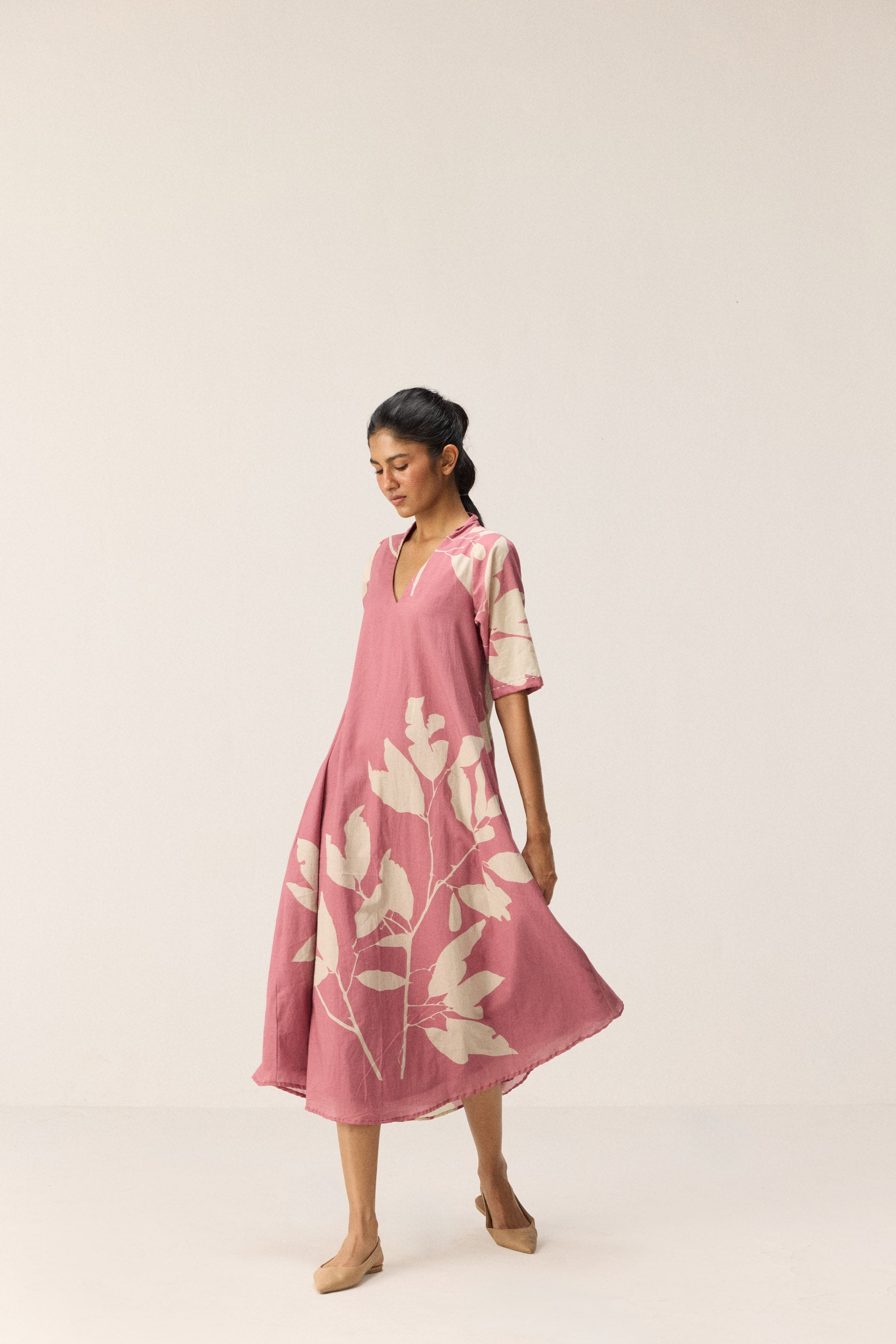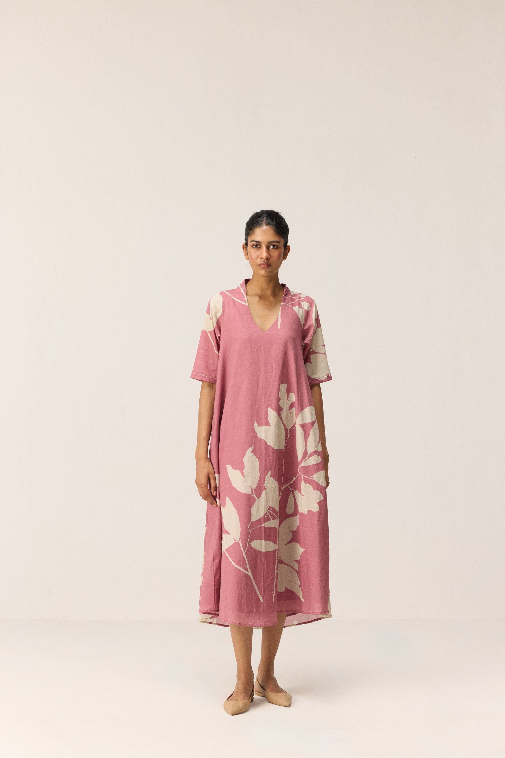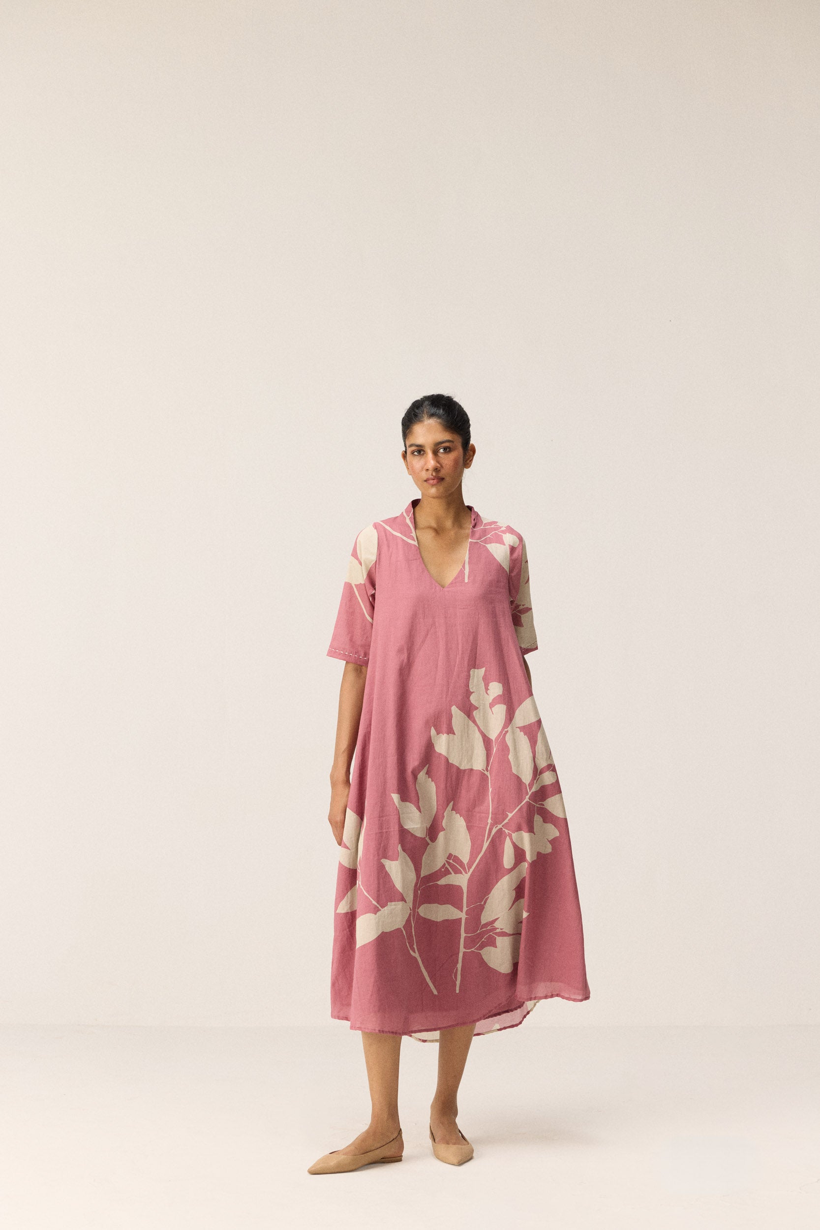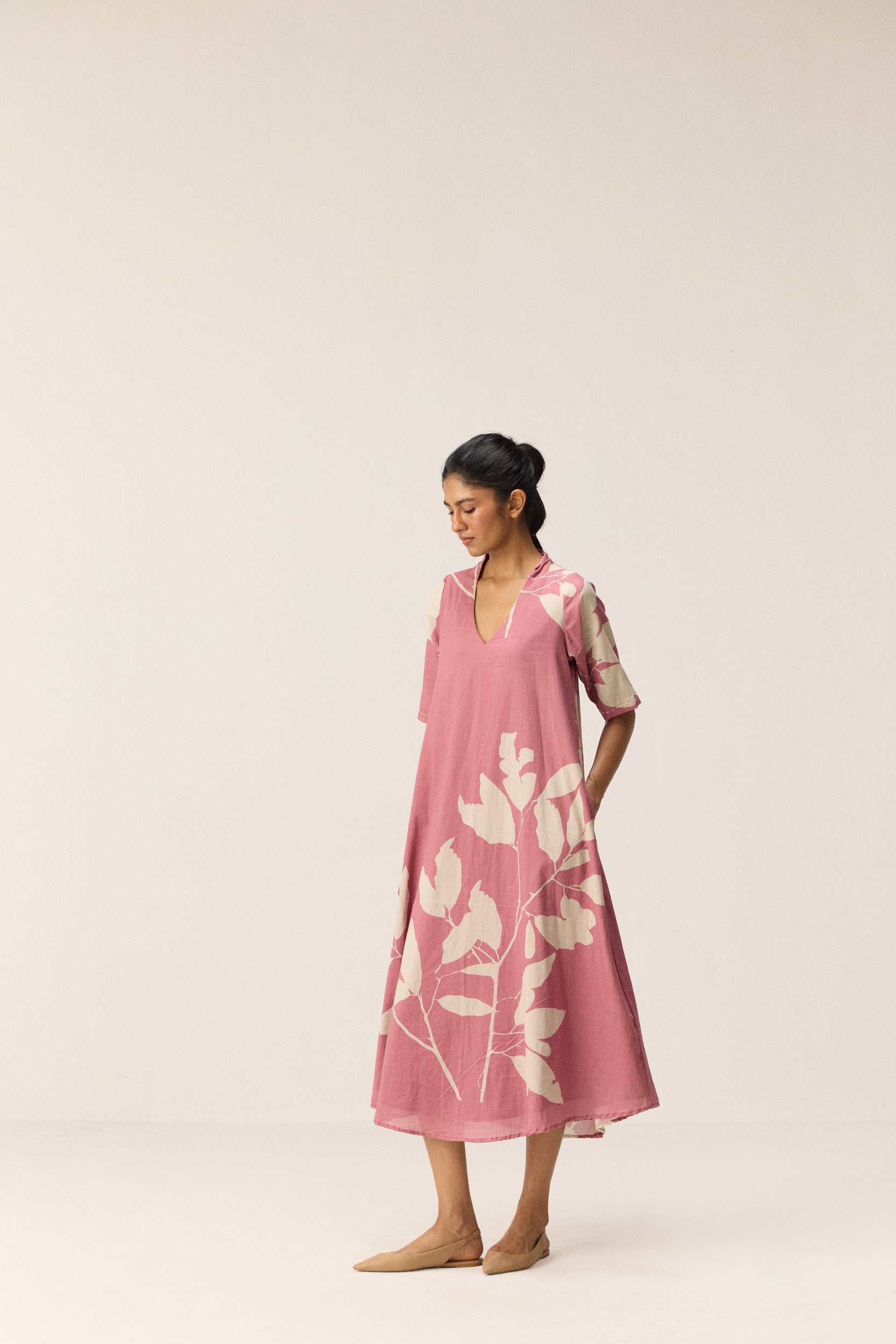 A floral pink maxi dress featuring a relaxed V neckline, crafted in breathable cotton mul for everyday ease and comfort. The delicate running stitch detail on the sleeves adds a subtle touch of texture. Designed with side seam pockets for added functionality.
