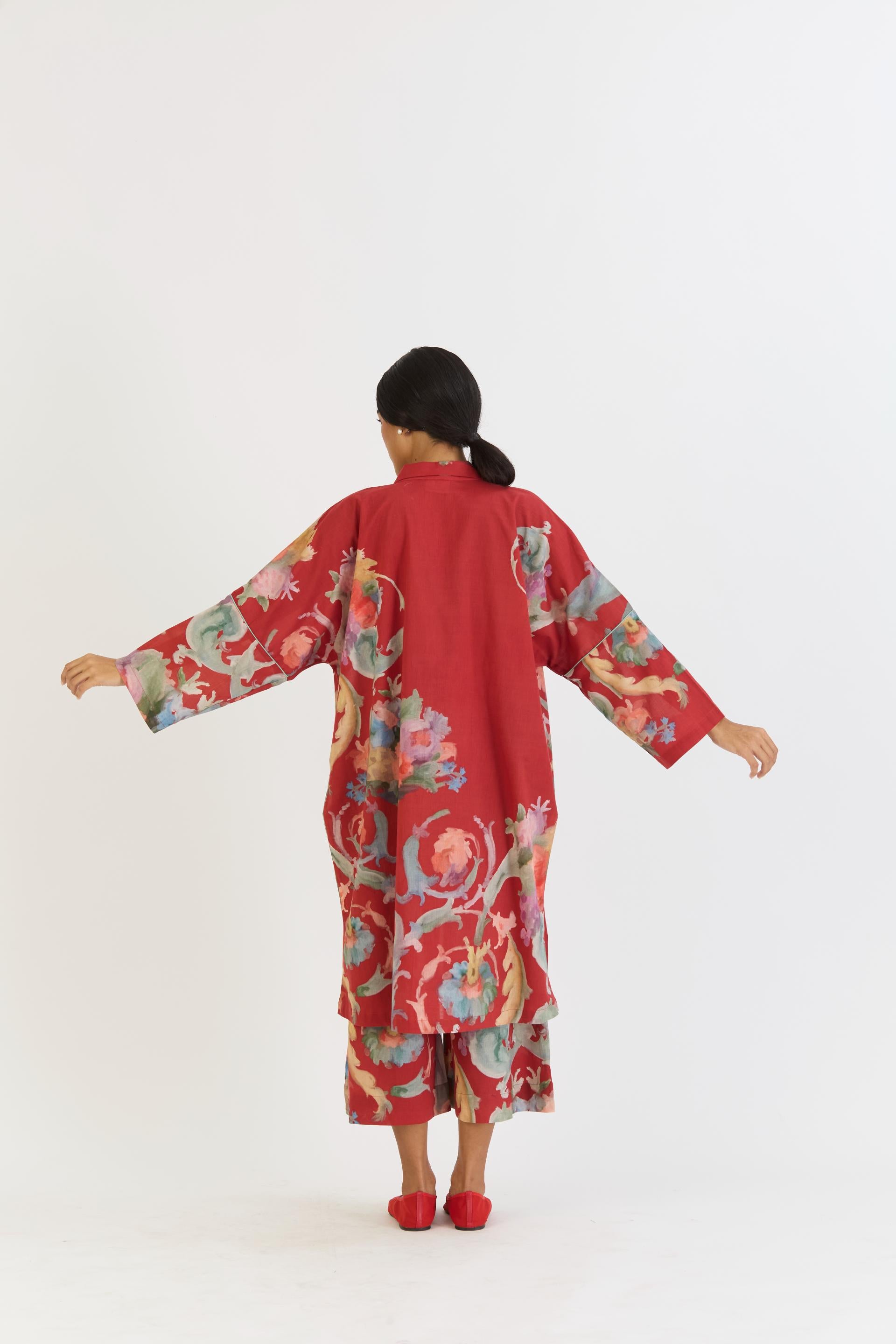 The set is adorned with a charming floral basket print on a vibrant red base, making it a perfect blend of style and comfort.