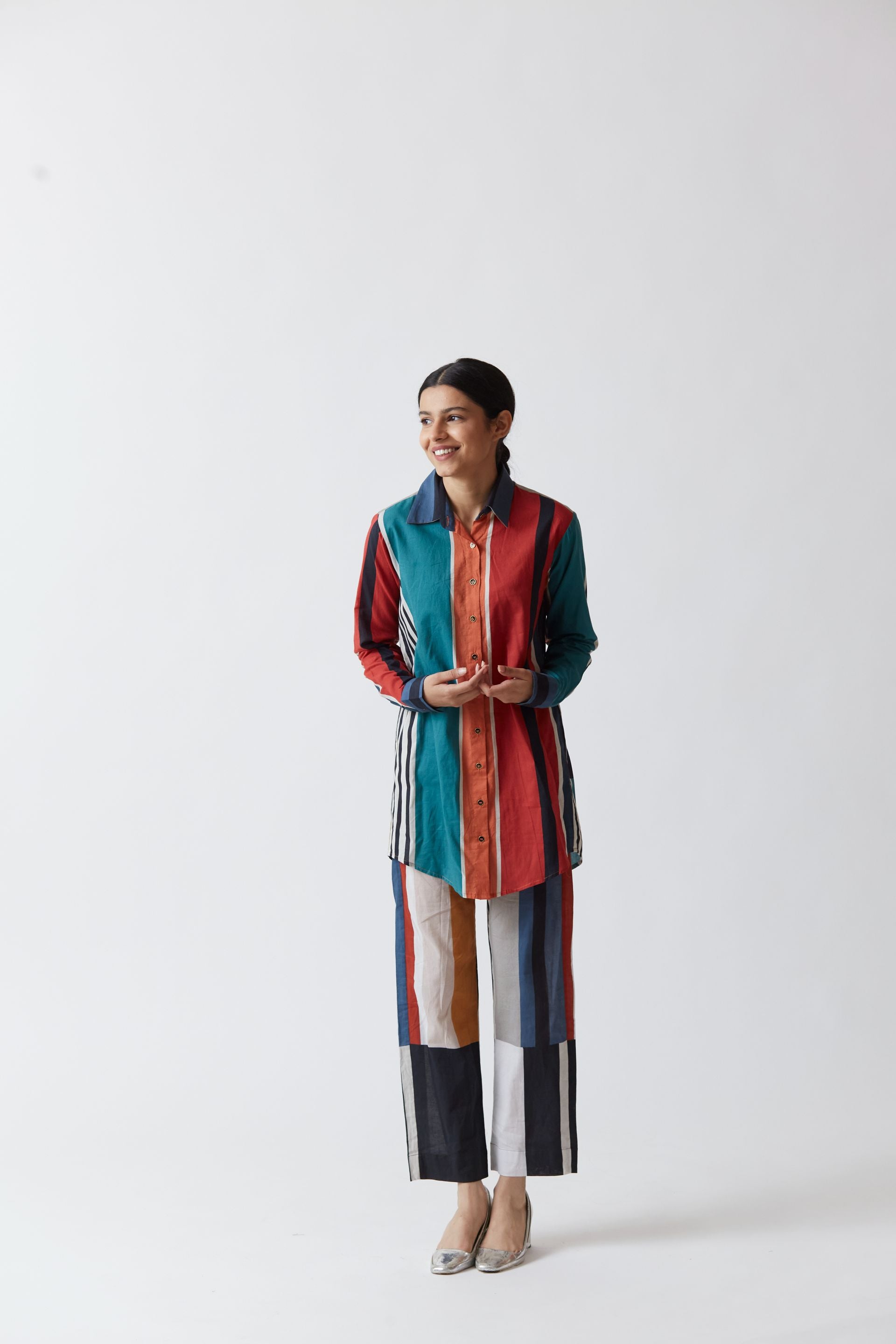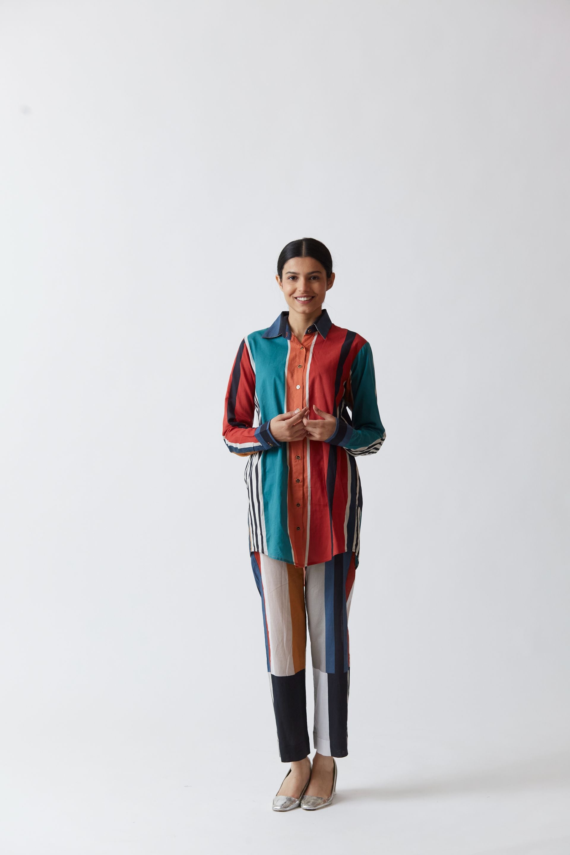 Cotton printed shirt and pant set in bold stripes with straight full sleeves and cuff.