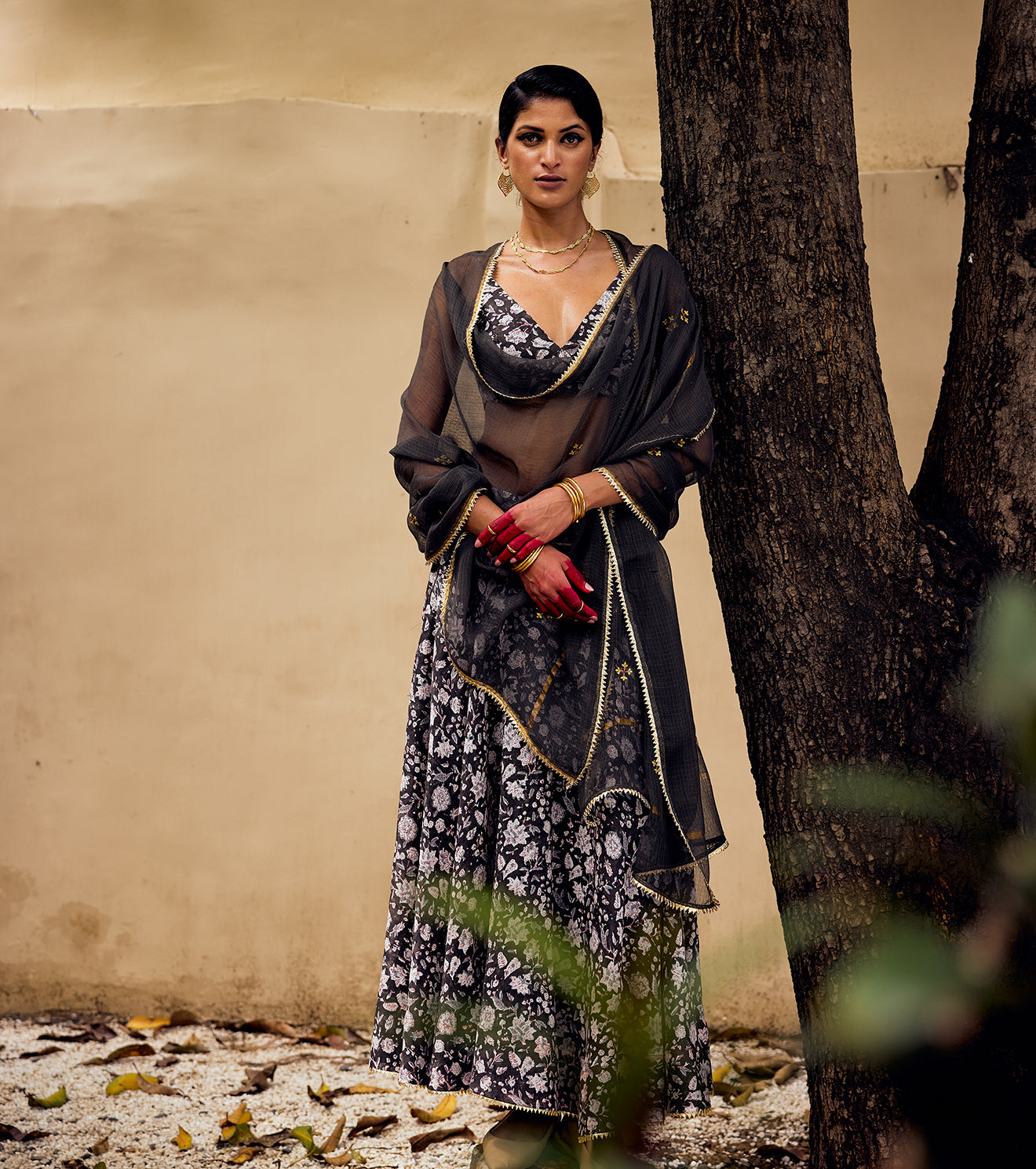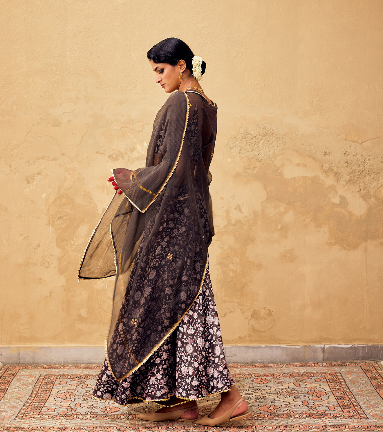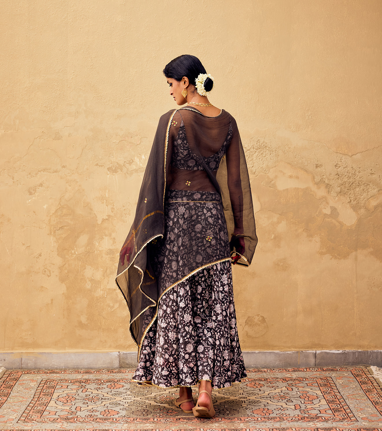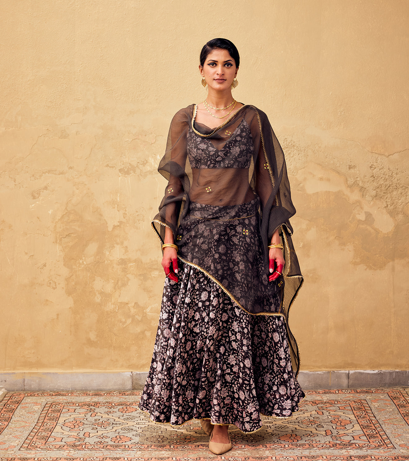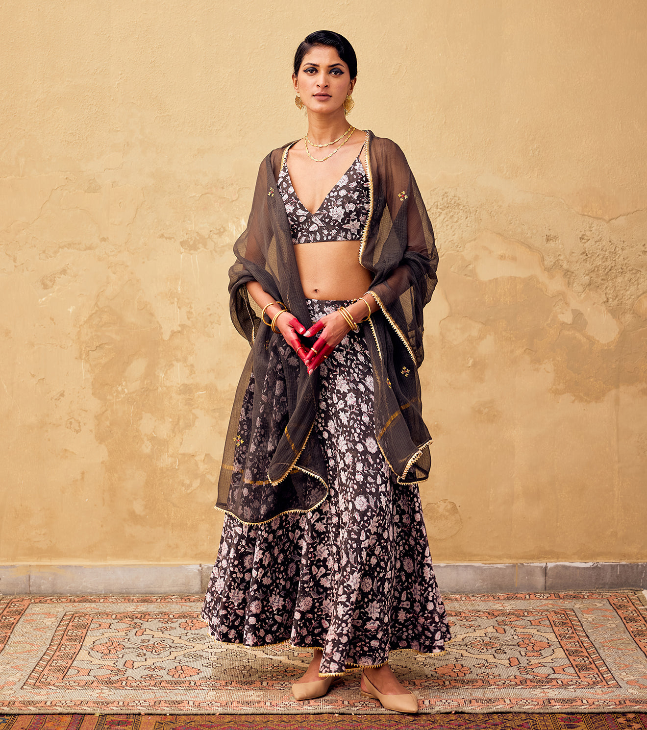 A block printed charcoal ghagra with side zipper opening and button fastening featuring bijiya gota lace at hemline crafted in chanderi, paired with a slip blouse featuring a deep v neck and hook & eye fastening at the back. Includes an embroidered Kota doriya Dupatta composed in cotton with bijiya gota at the hem.