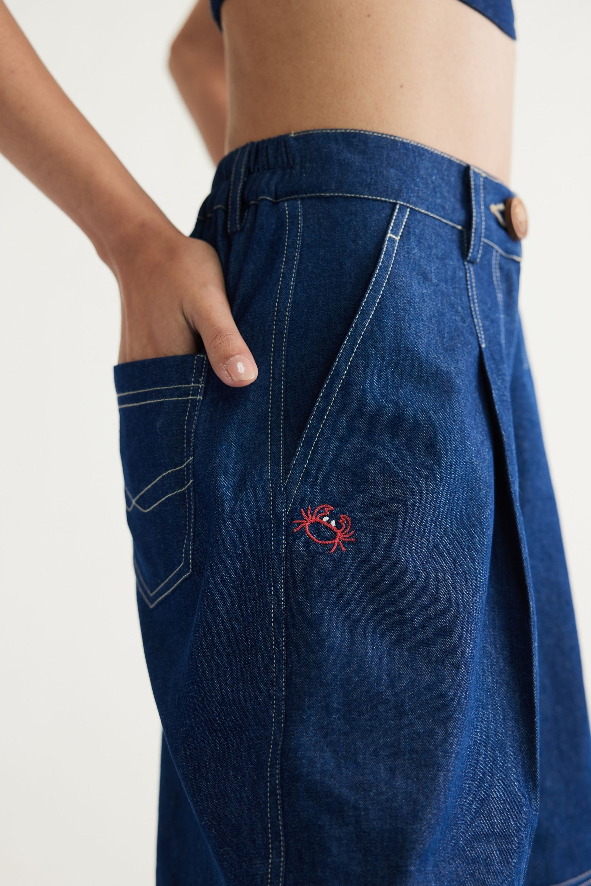 Regular fit, wide-leg shorts that buttons at the waist, crafted in indigo dyed cotton denim fabric created with a blend of cotton and recycled cotton fibres, crocheted and hand embroidered with a crab and starfish motif.
