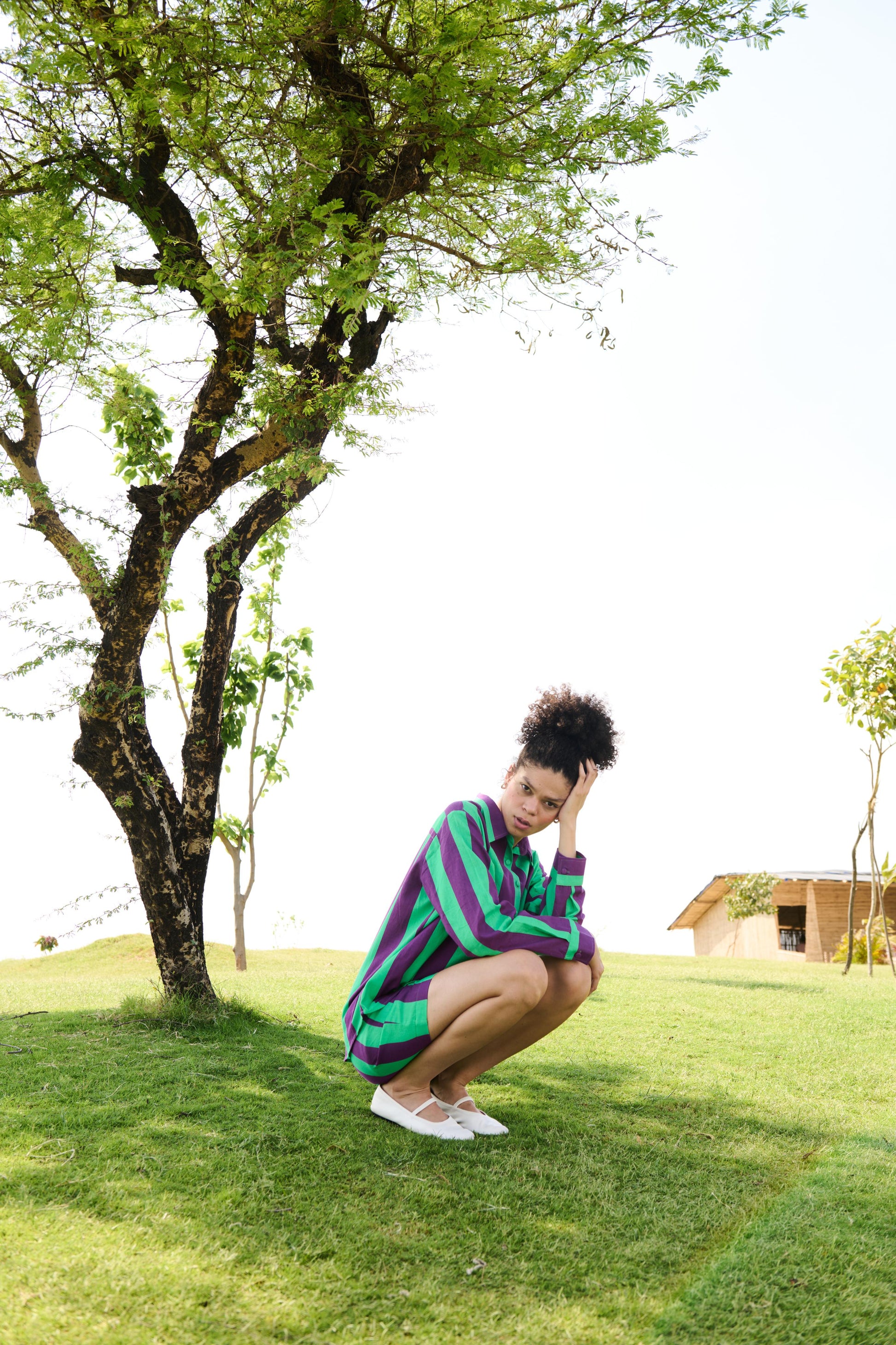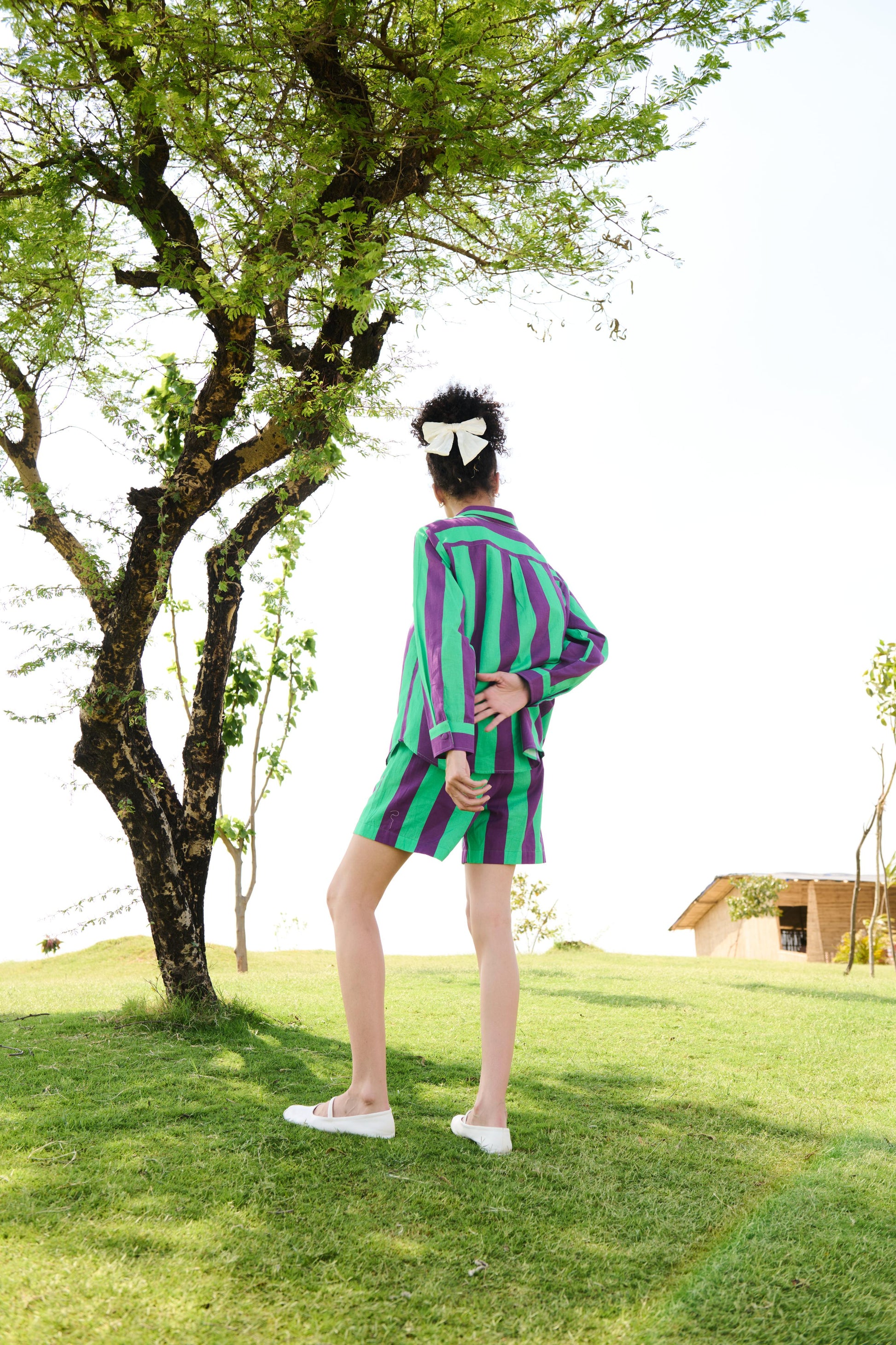 The Diana coord set is crafted from our linen cotton Shirt in our Purple & Green Stripes print paired with our leisure shorts.