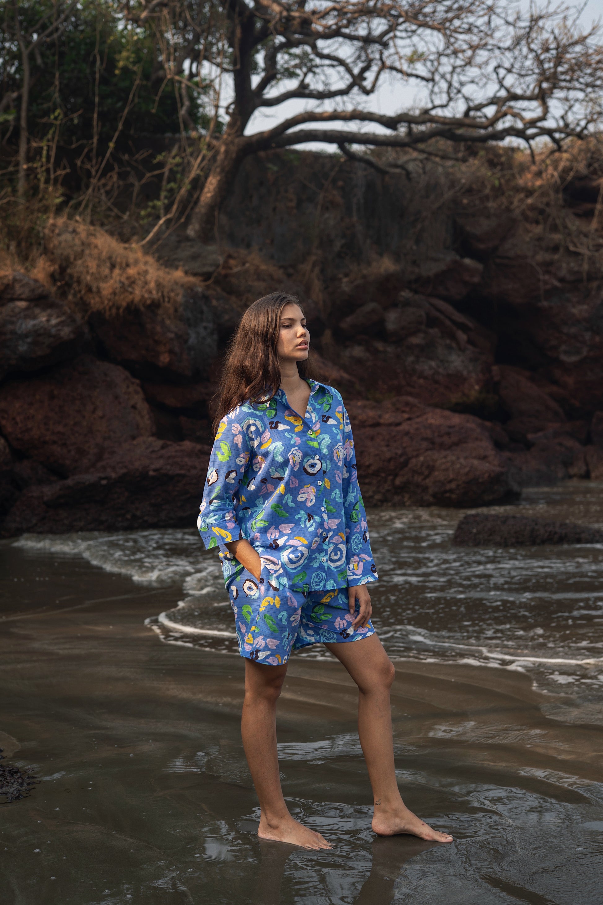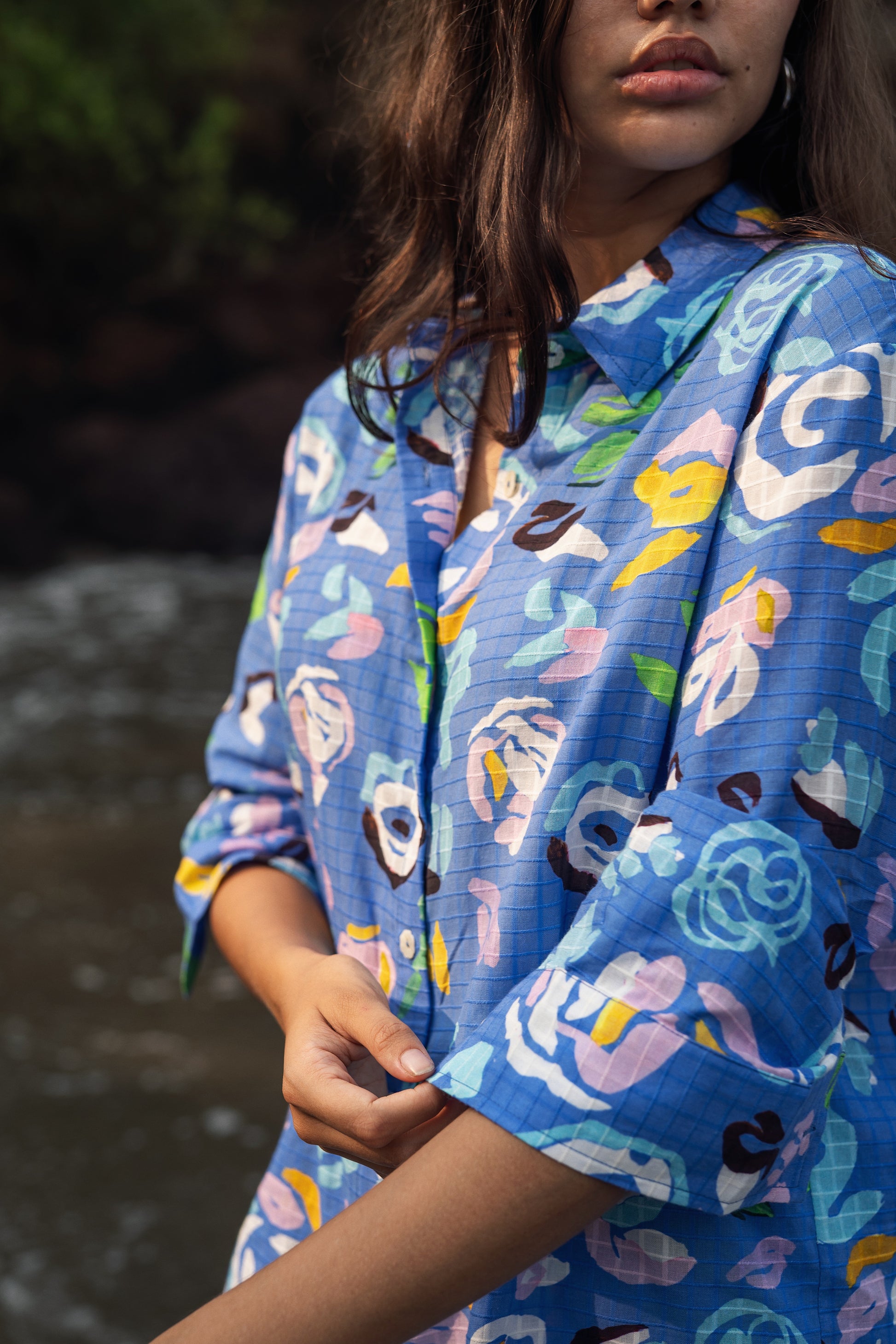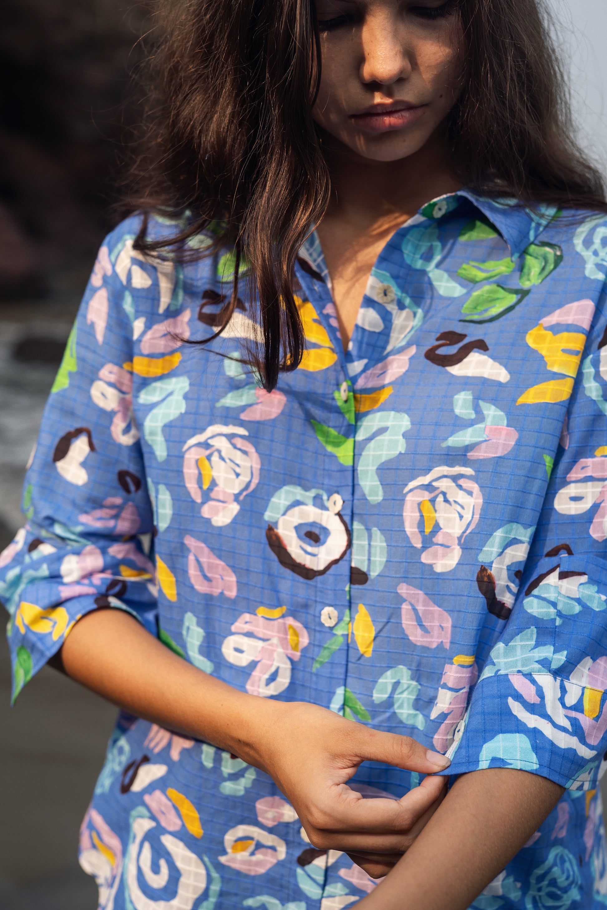 Diana set is made from our cotton chequard fabric made from hand painted print. It has a relaxed fit shirt and shorts for a beach vacation.
