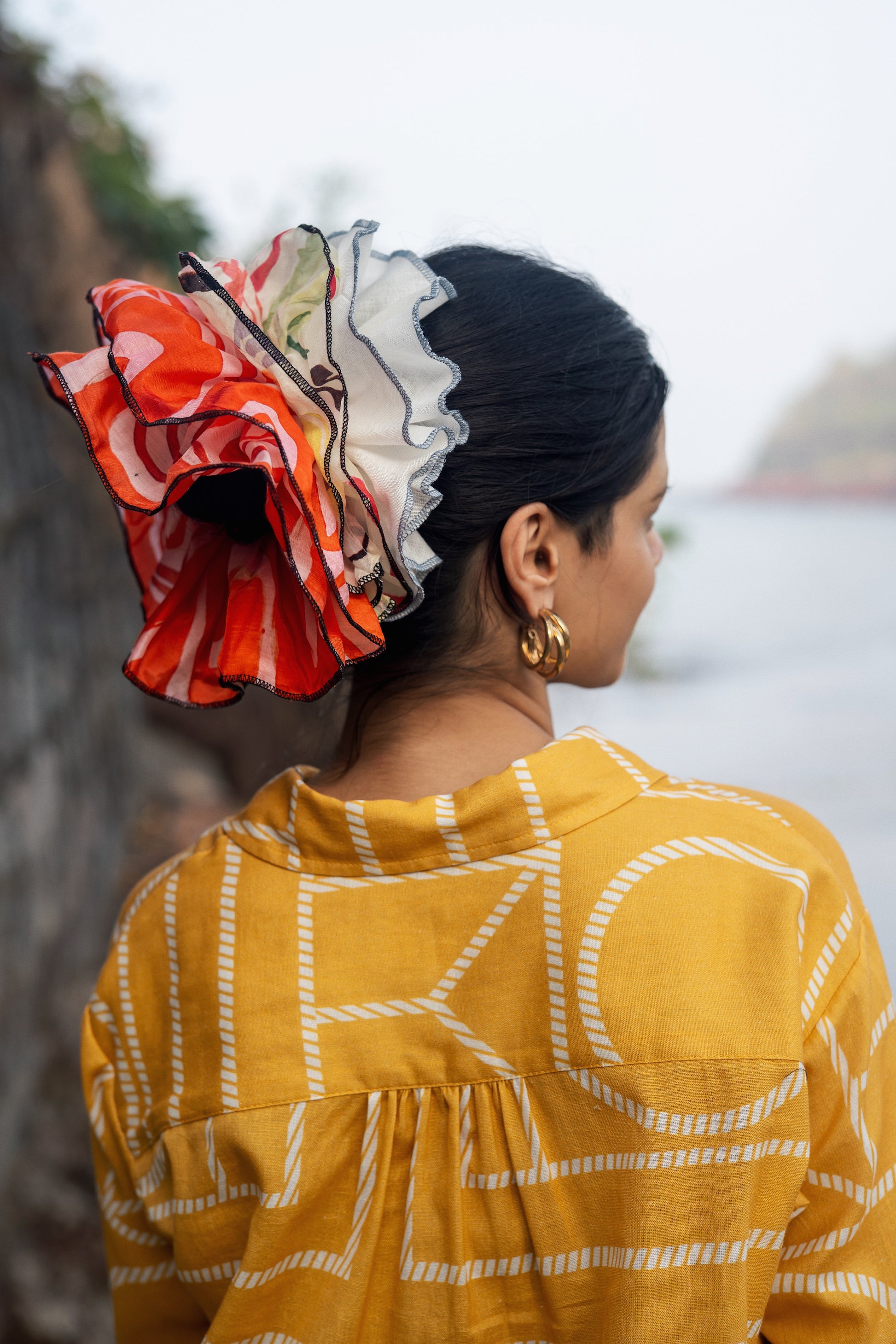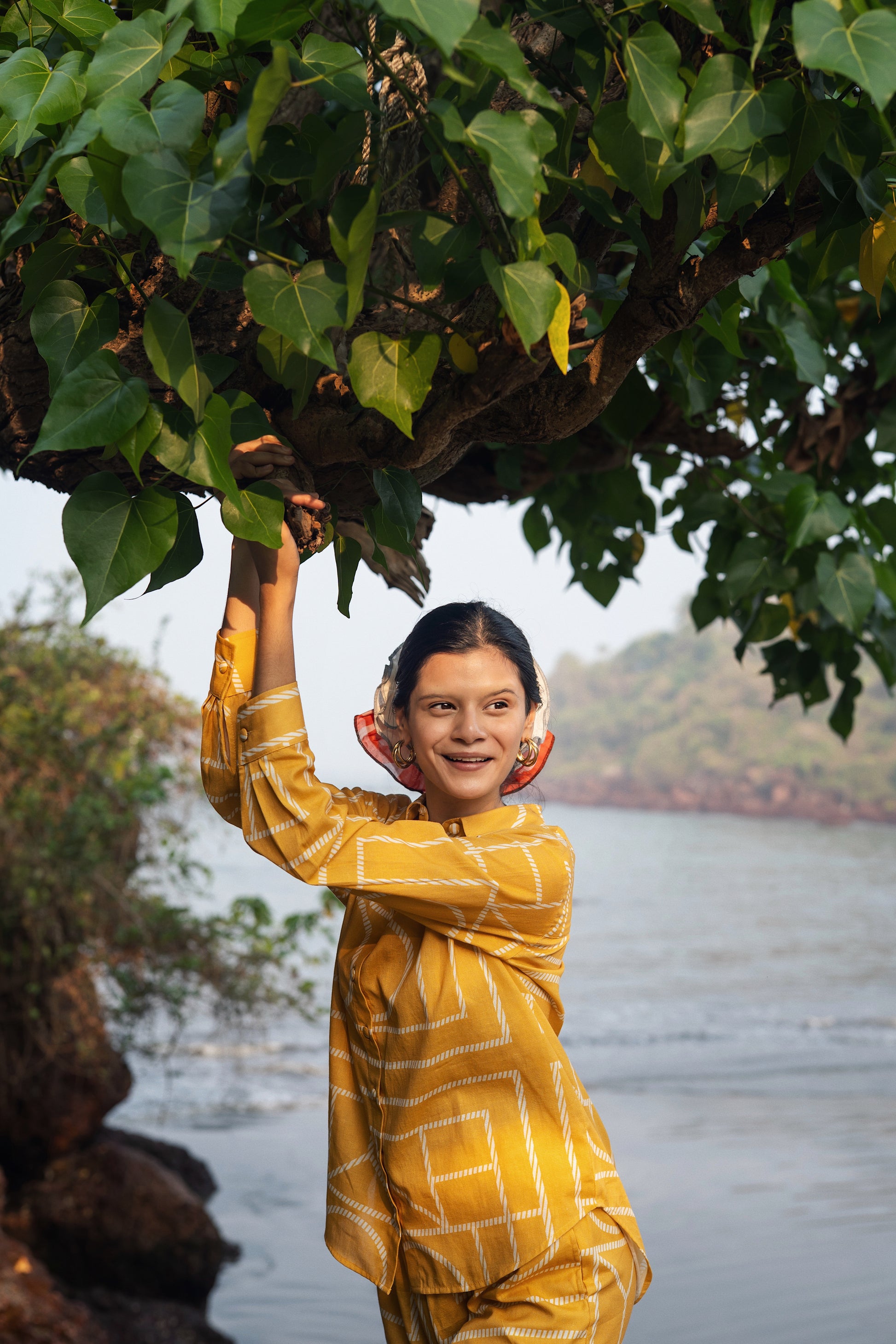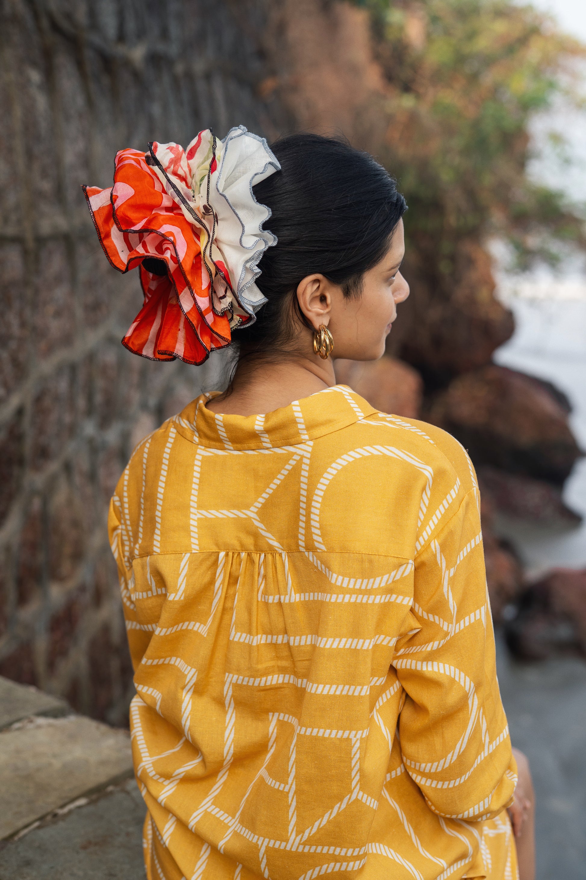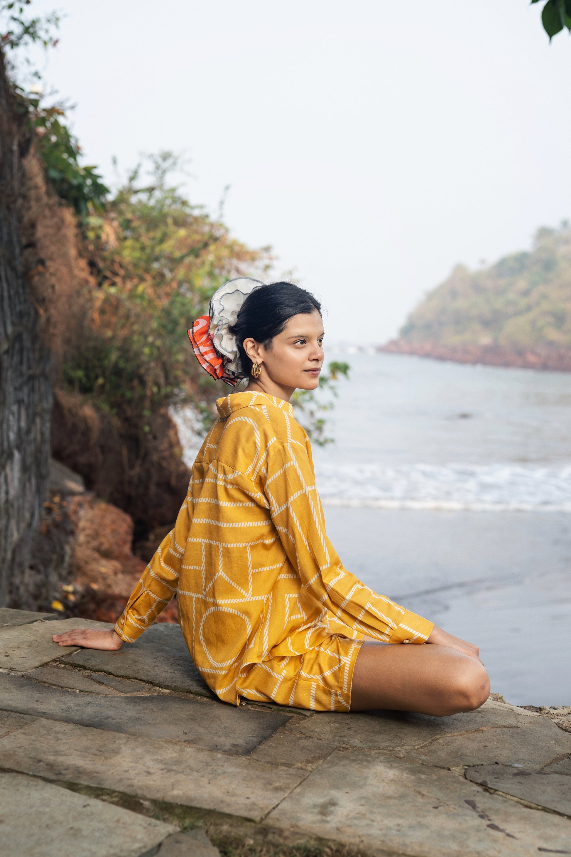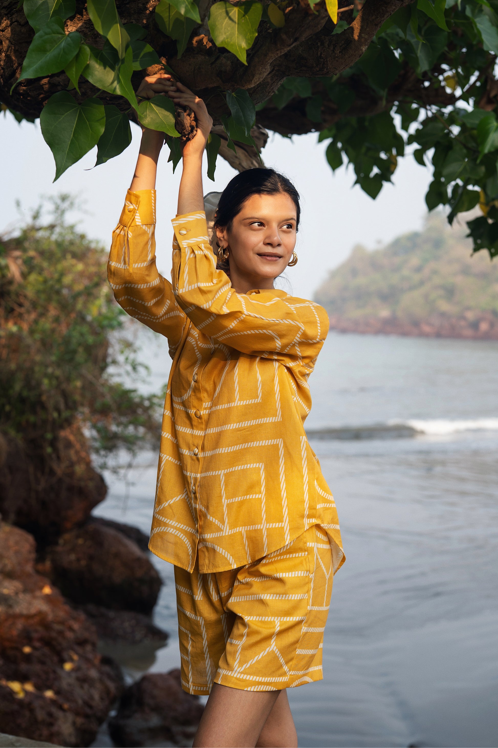 Diana set is made from our cotton linen fabrication in geometric print. It has a relaxed fit shirt paired with shorts.