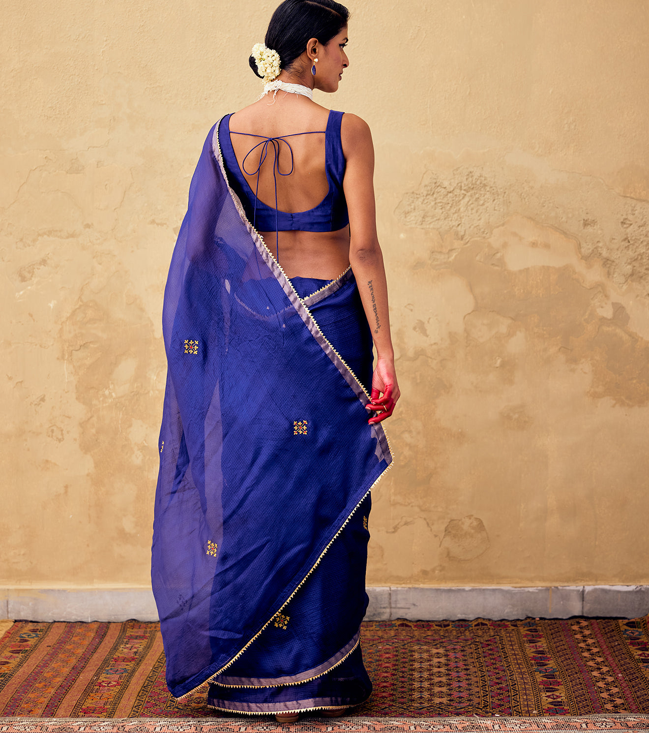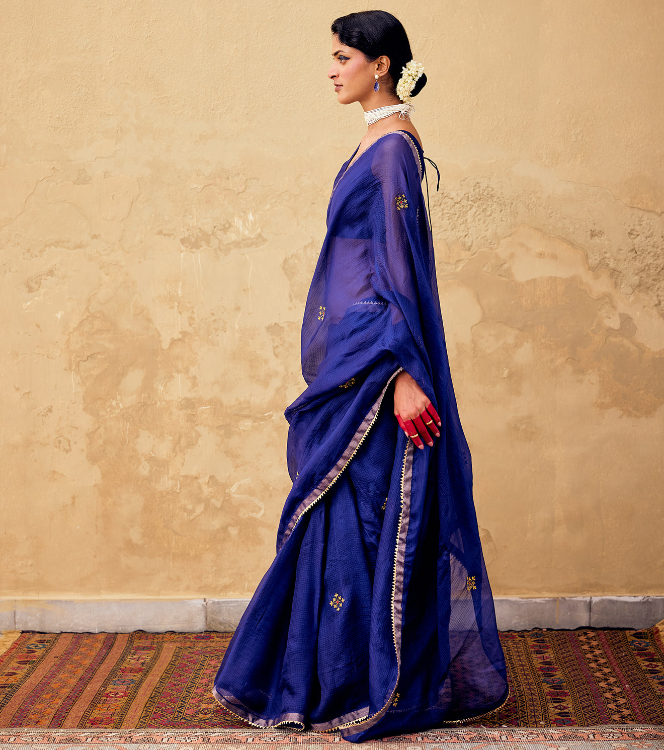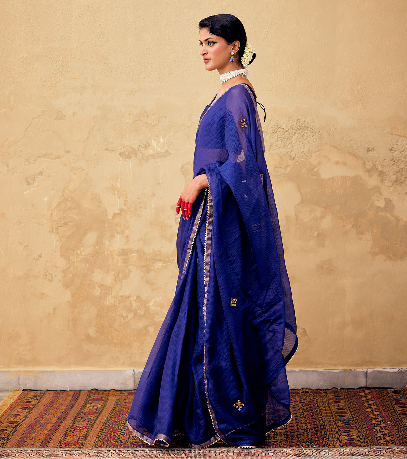 A Royal blue embroidered Kota doriya silk saree , featuring bijiya gota detail at the hem. Includes a classic v neck blouse in Chanderi with back tie up and hook & eye fastening.