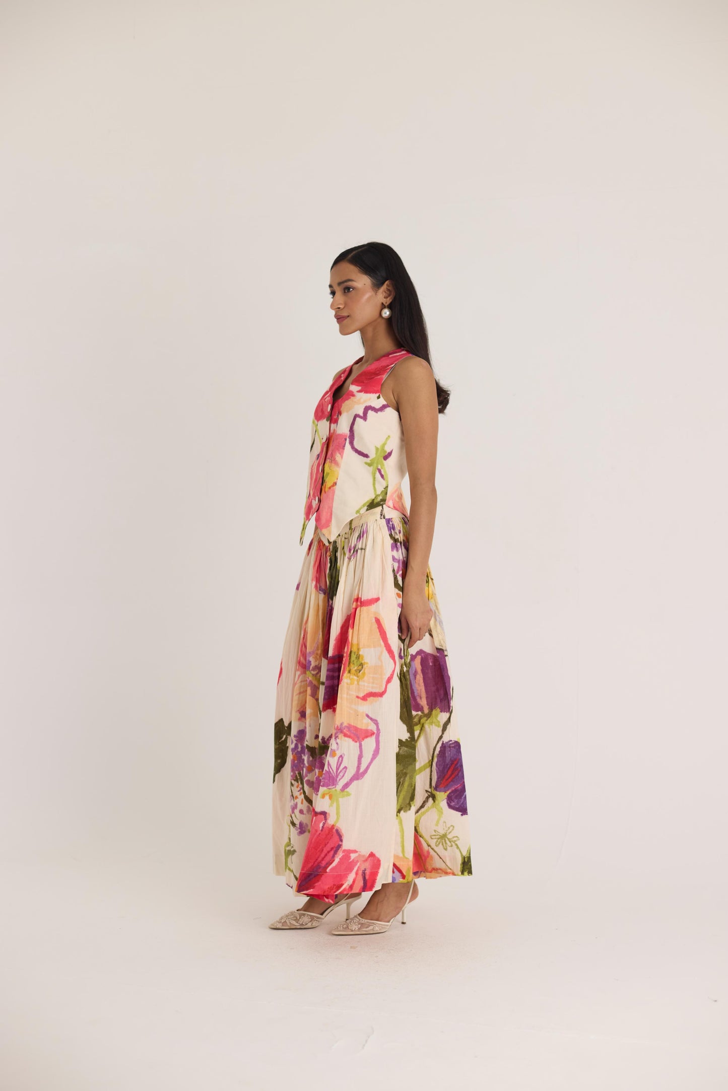 Make a bold statement with this floral waistcoat and skirt set, designed to bring artistic elegance to your wardrobe. The structured waistcoat features a sharp, pointed hem and a tailored fit, creating a striking silhouette. Paired with the matching high-waisted skirt, this co-ord set showcases a stunning watercolor-inspired floral print in vibrant shades of red, pink, green, and purple. Crafted from lightweight fabric, it offers both style and comfort.