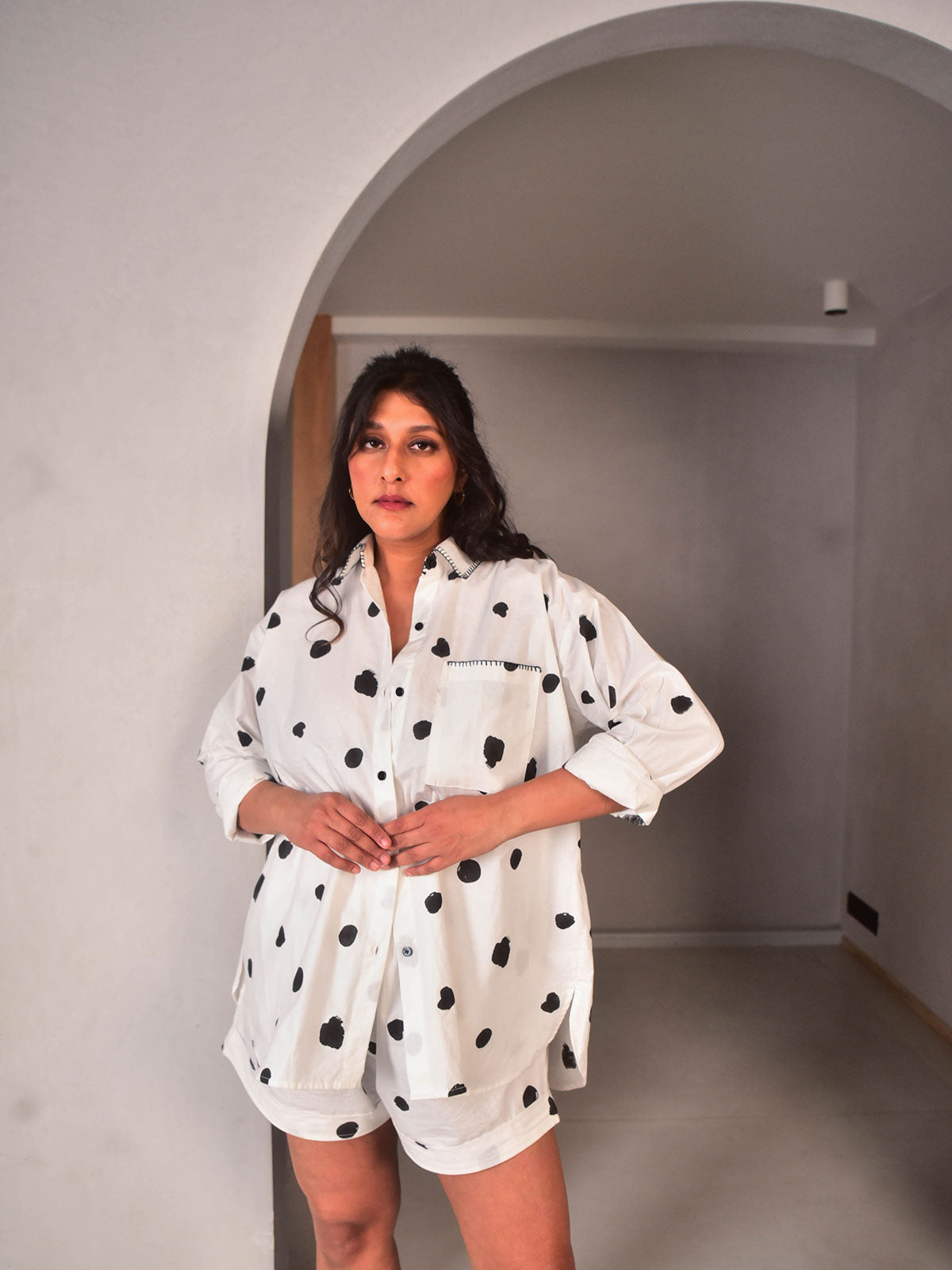 Laid-back shorts for easy styling of staples. Cut in our exclusive black and white polka hand-block printed cotton, these loose, flared shorts come with inseam pockets.