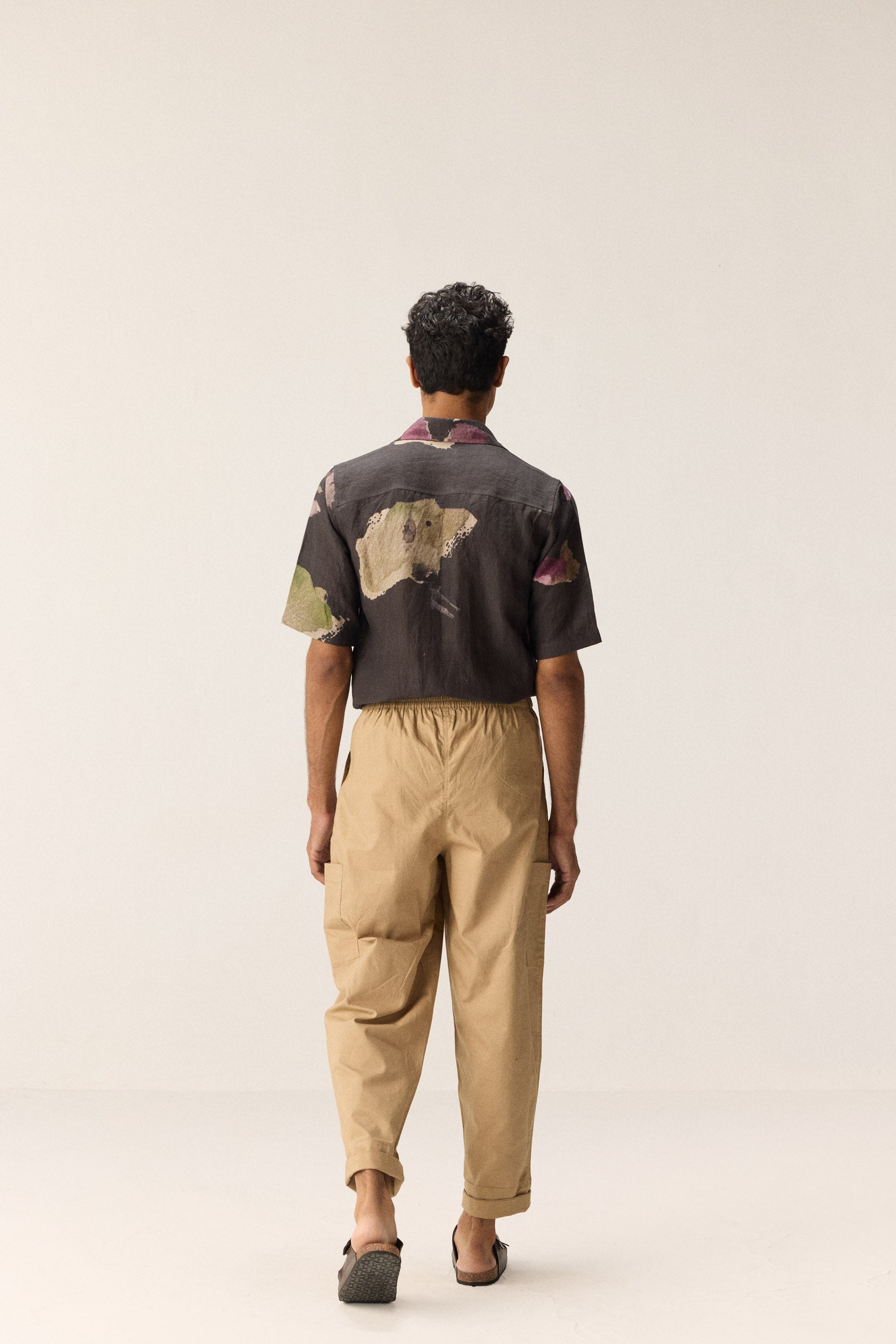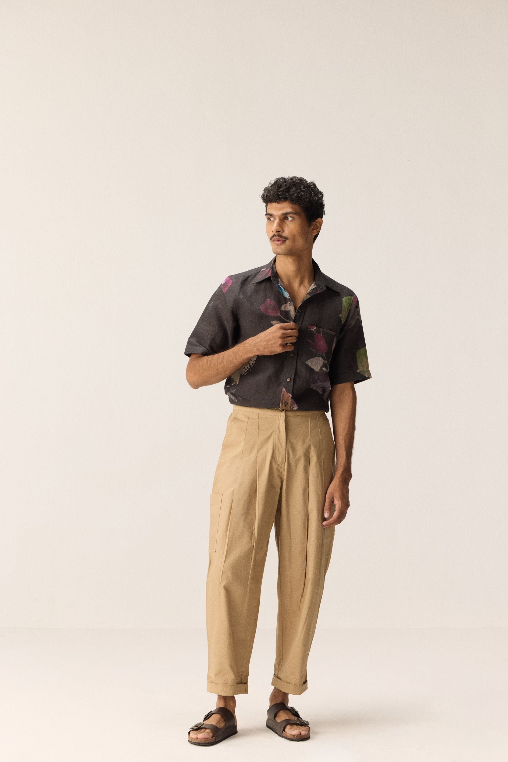 Unisex beige straight-fit pants crafted in sturdy cotton Oxford fabric. Designed with two side pockets, two side patch pockets, and an elasticated back waistband for added comfort. It is Finished with a front button-and-zipper closure
