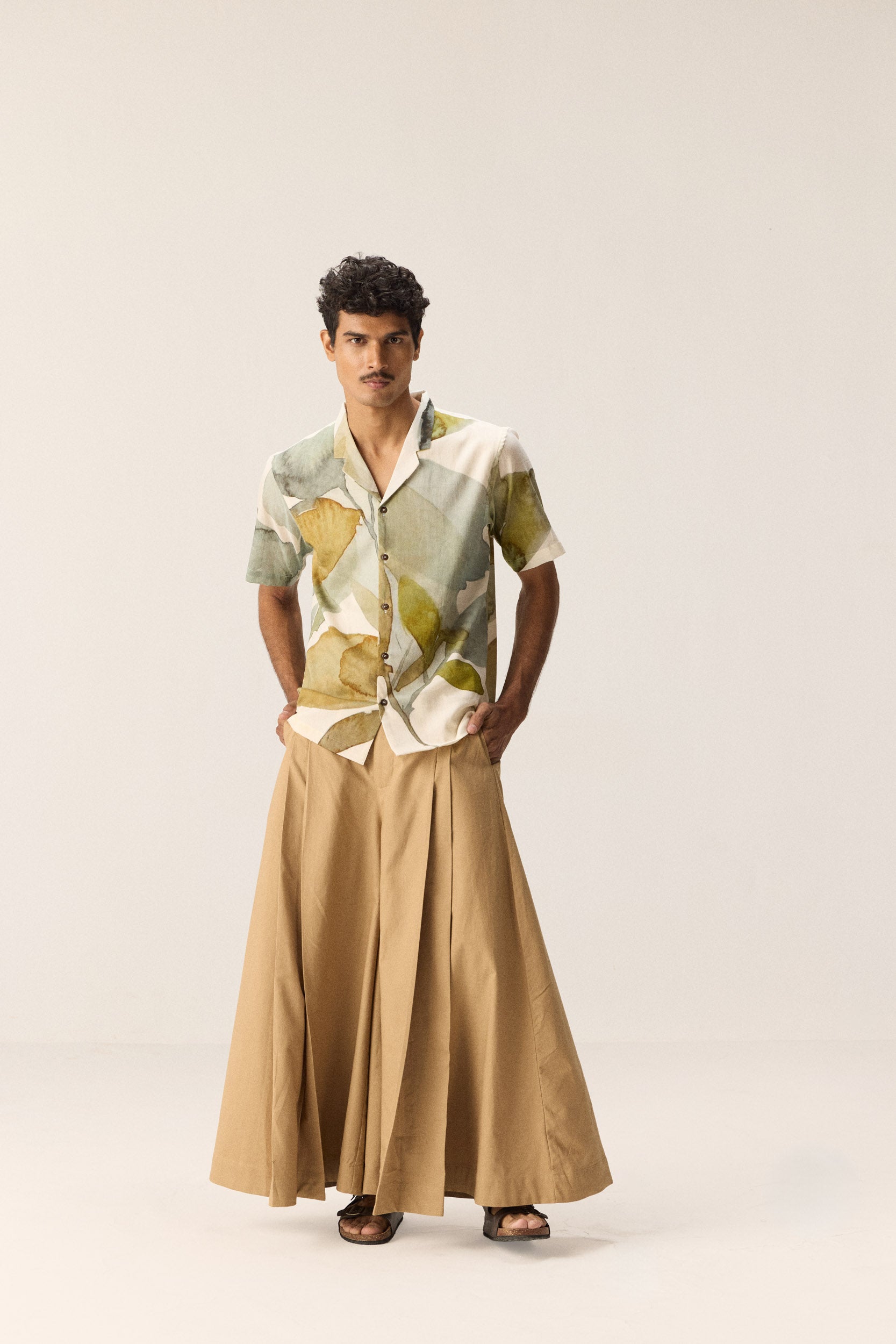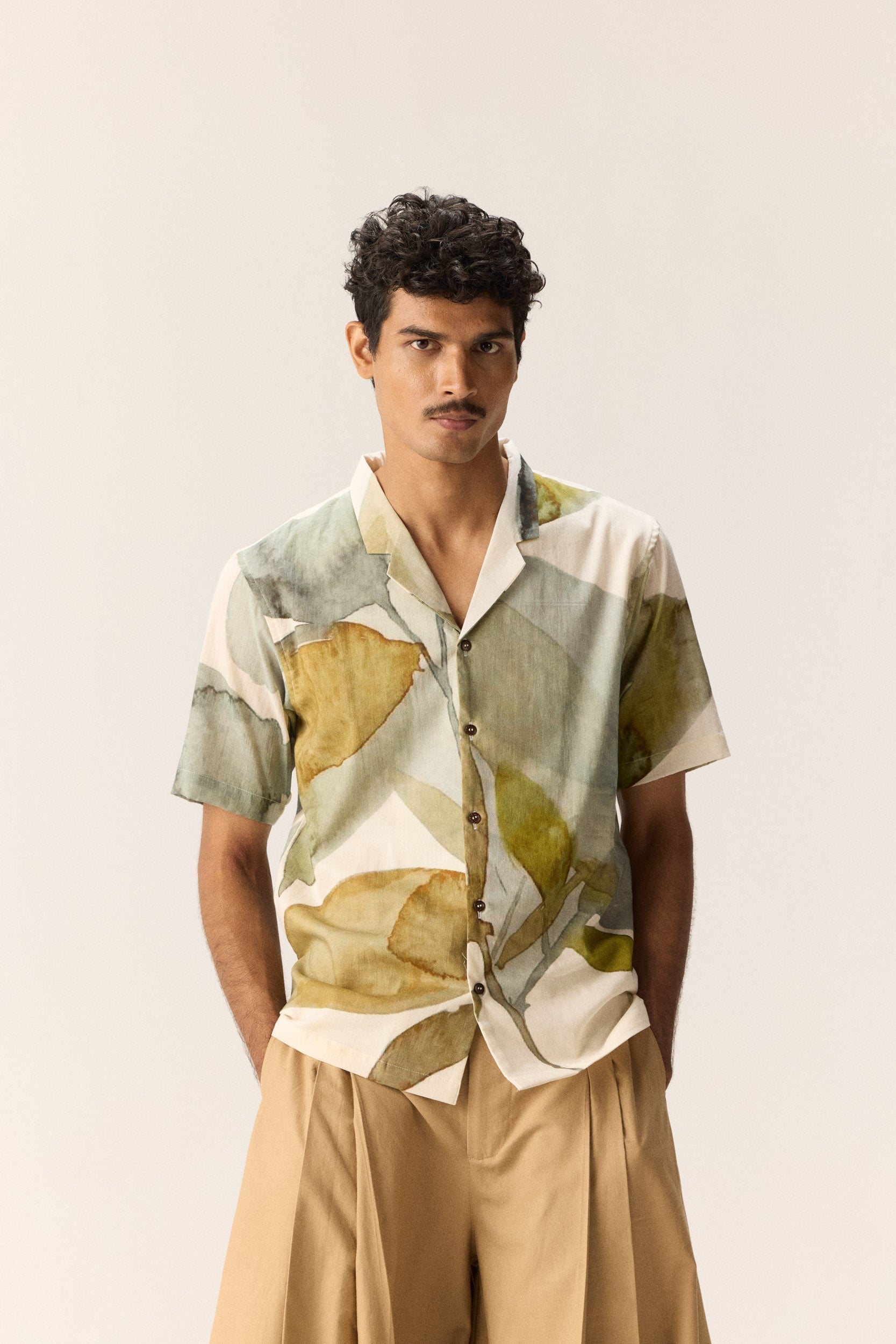 A fresh white cotton mul shirt adorned with earthy green and brown floral prints, featuring a single front pocket for understated utility. Lightweight and breathable, it’s a perfect balance of natural tones and relaxed style for effortless daywear.