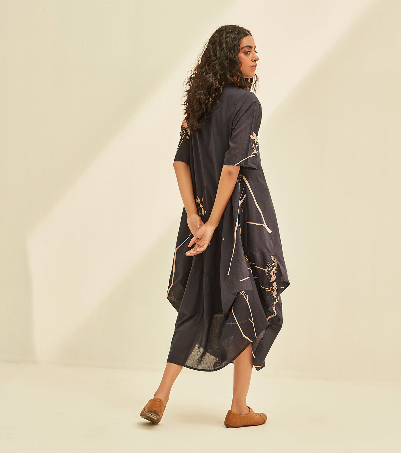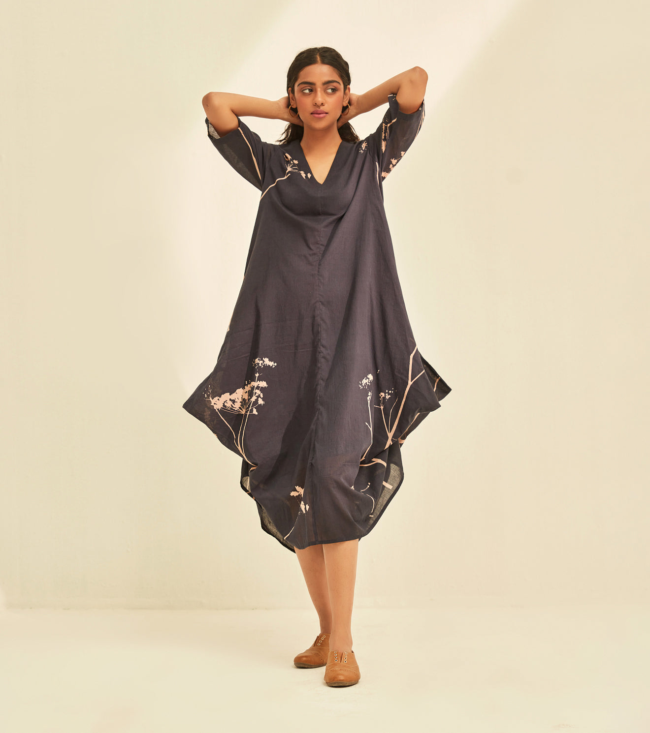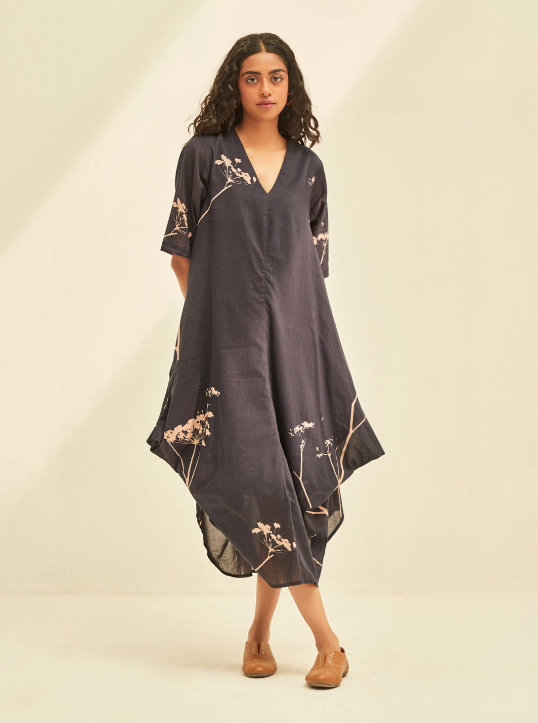Eclipse embraces the serenity of nature during summers. adorned with a delicate floral print, it features a v neckline and side cowls.Handcrafted in India. Side seam pockets. Fully lined.