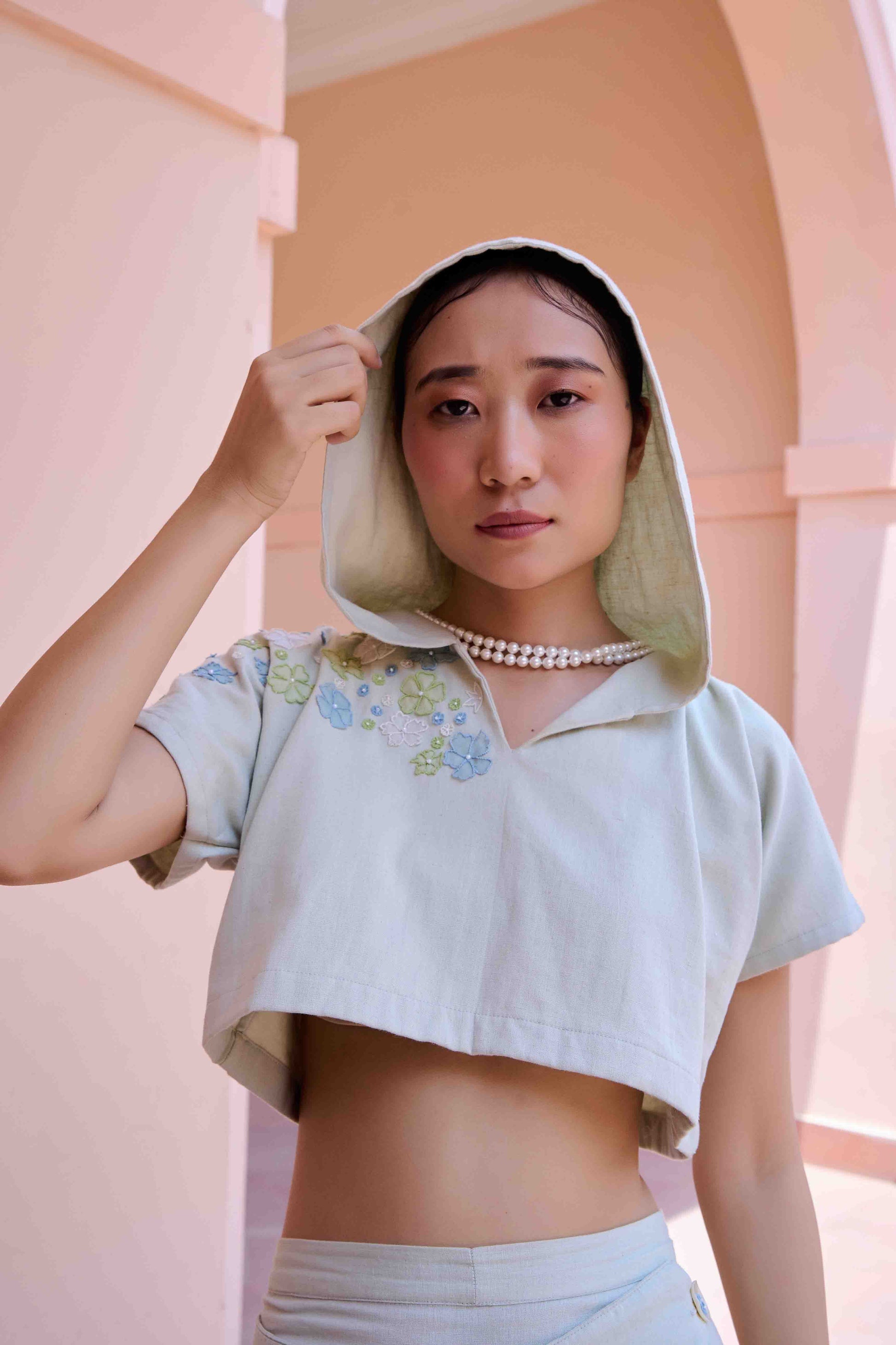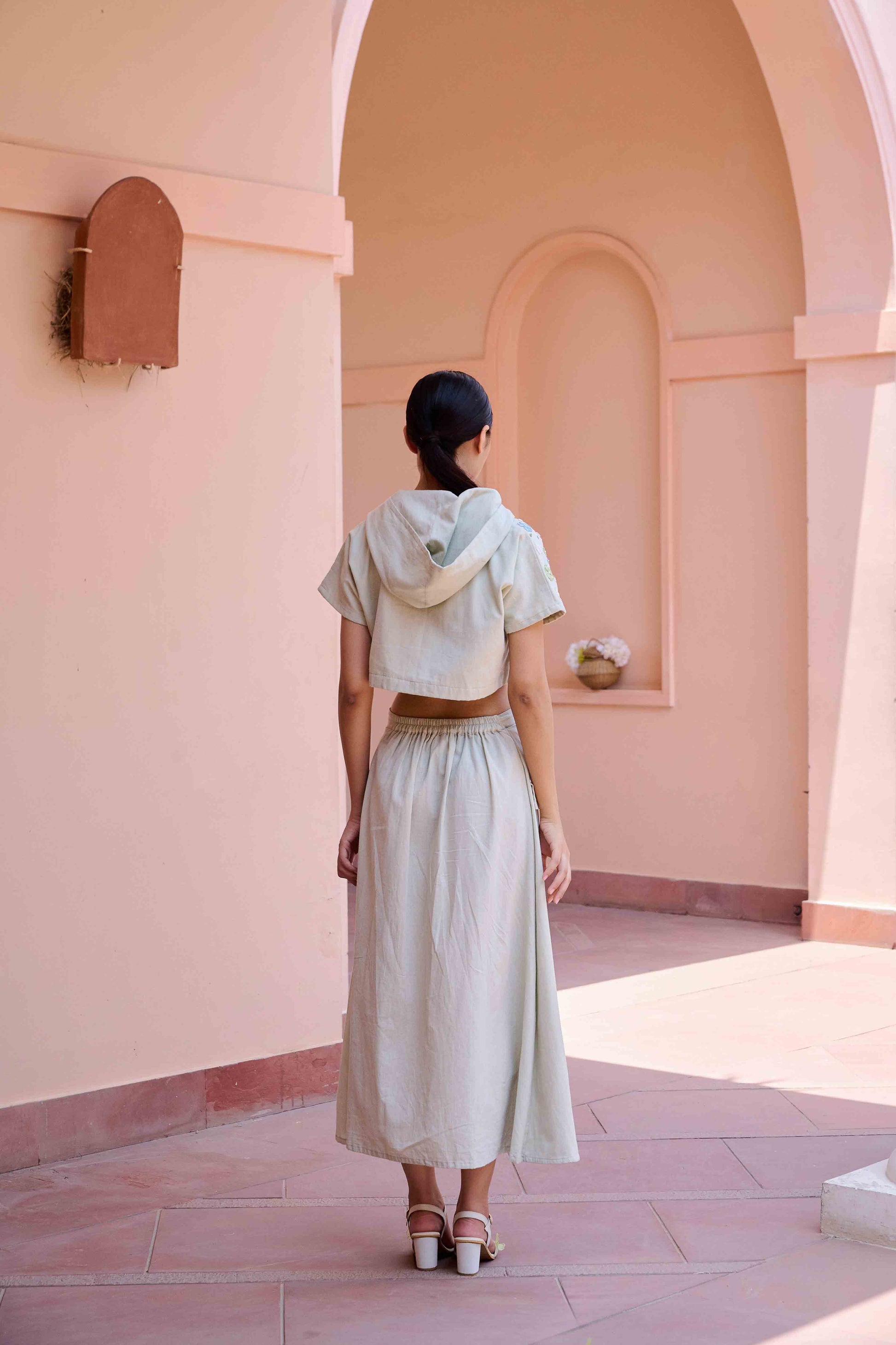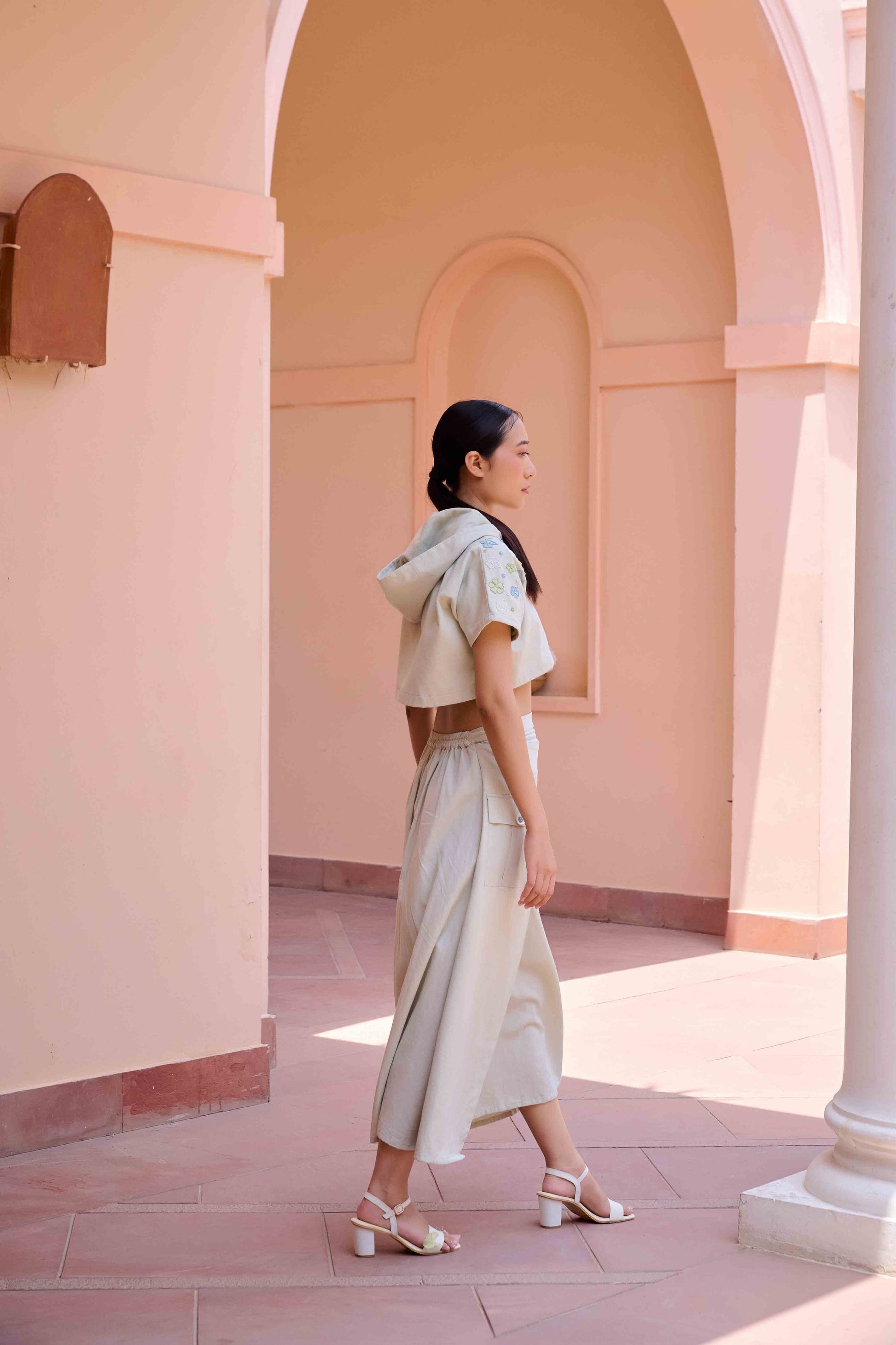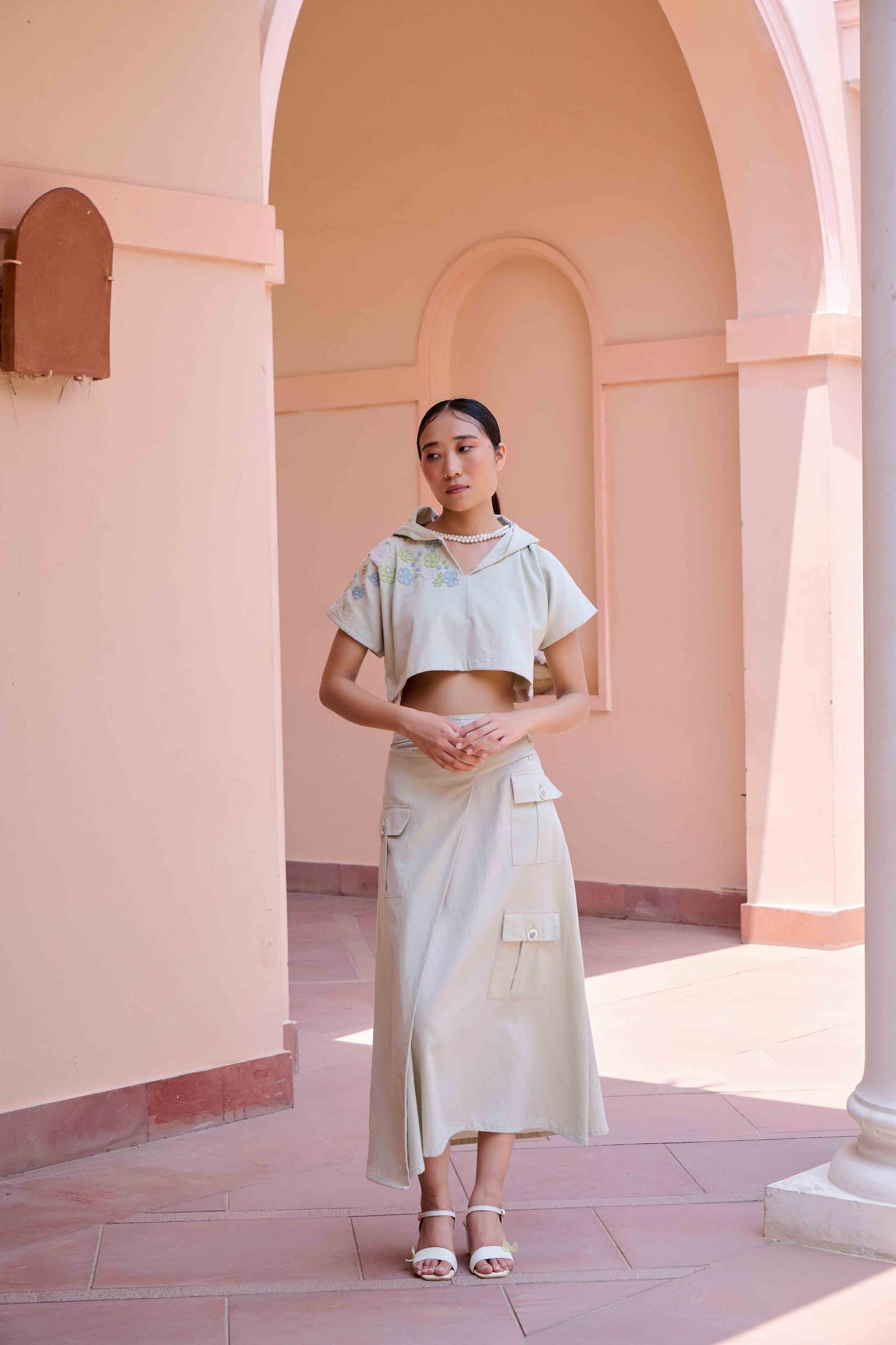 Introducing our Hooded crop Top adorned with beautiful organza flower details, a perfect blend of comfort and elegance. The hooded design adds a casual yet chic touch, while the intricate organza flowers elevate the top with a touch of sophistication and texture. Paired with our Multi-Pocket Wrap Skirt, this ensemble combines practicality with style. The wrap skirt features multiple pockets for added functionality and a contemporary flair, making it versatile for both casual outings and more polished occasions.