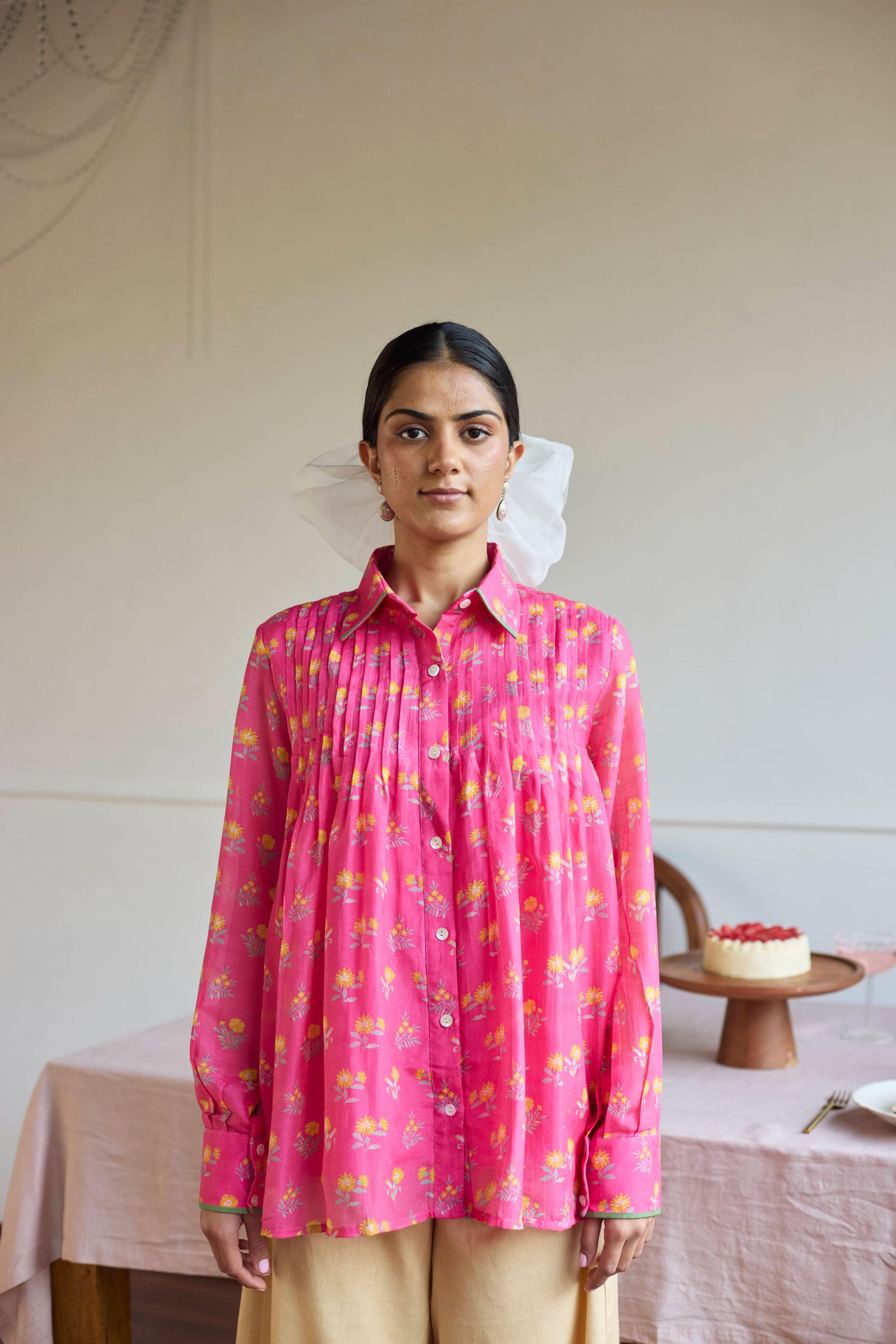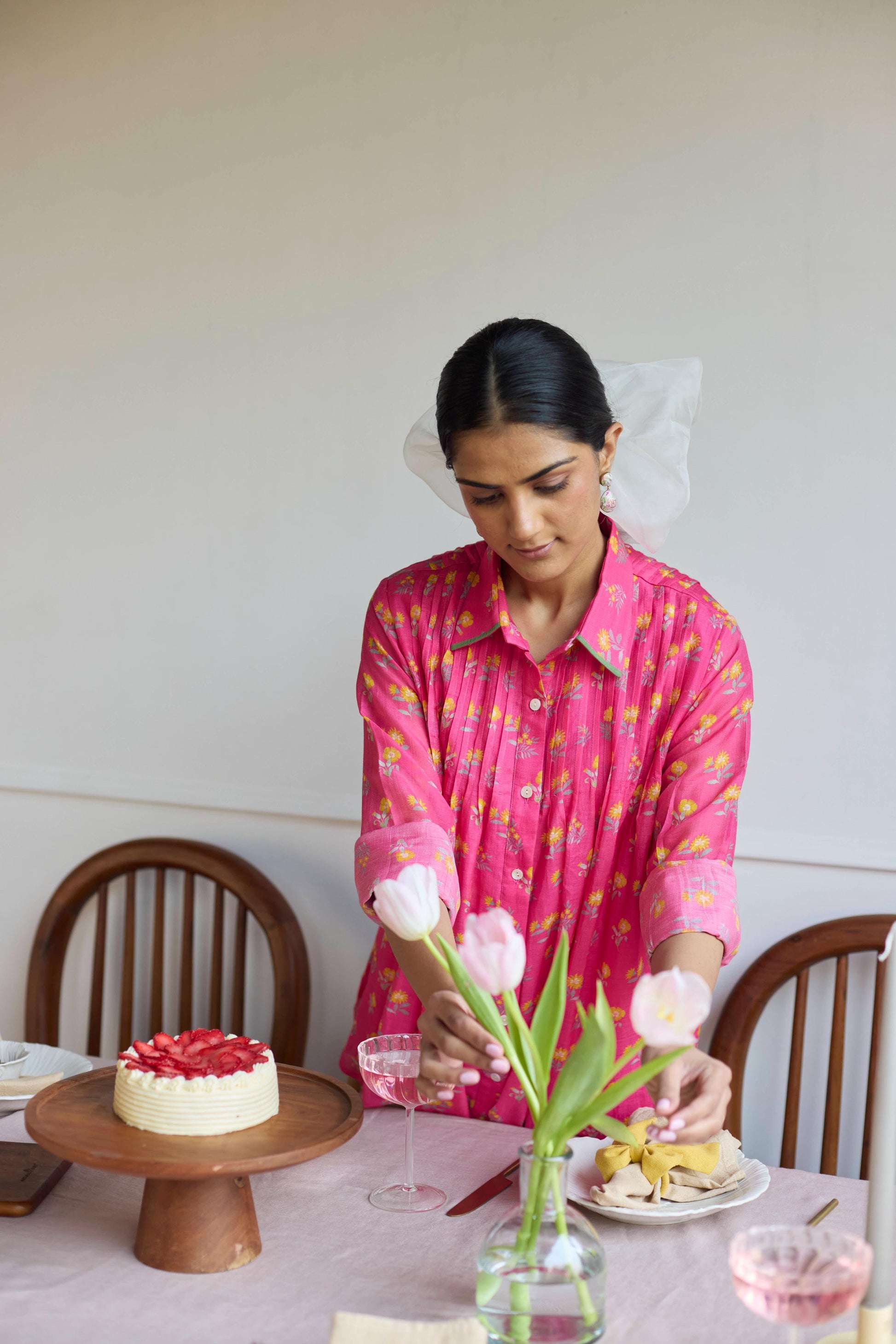 Introducing our handwoven Chanderi relaxed-fit shirt, Adorned with florette prints, soft and bright, A green border trims the collar and cuffs, A subtle touch, a nature's delight.