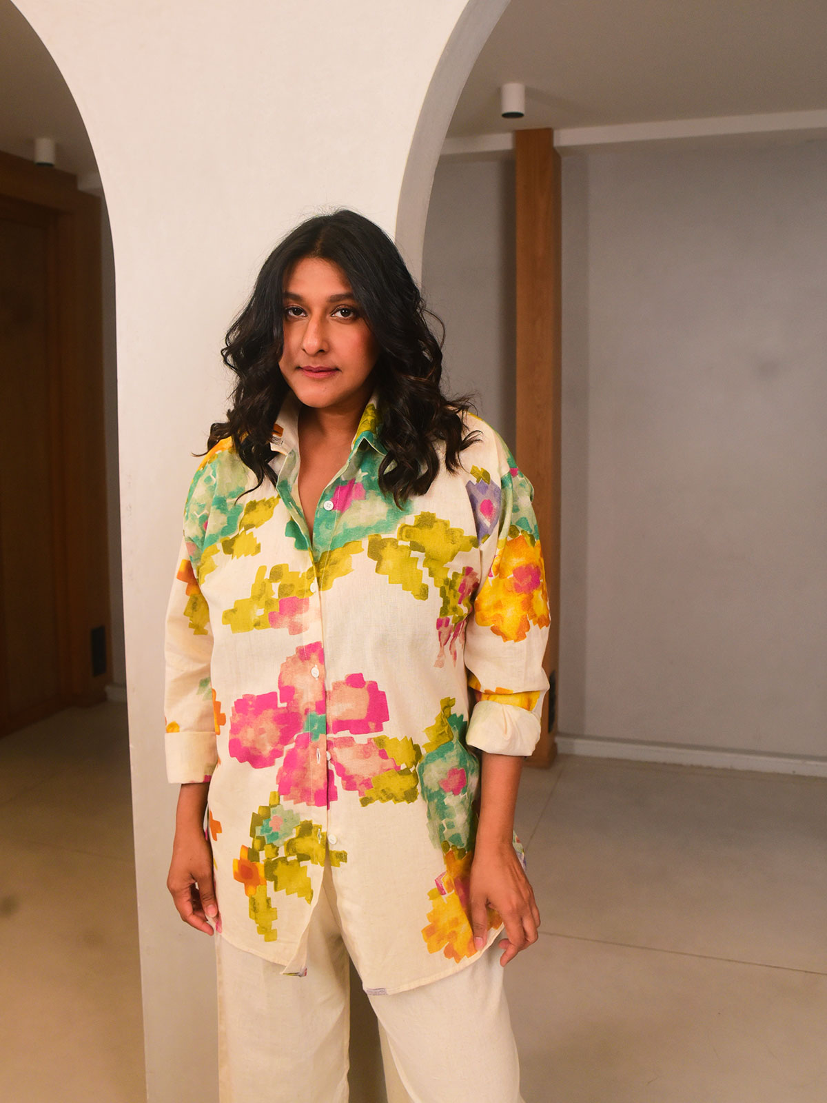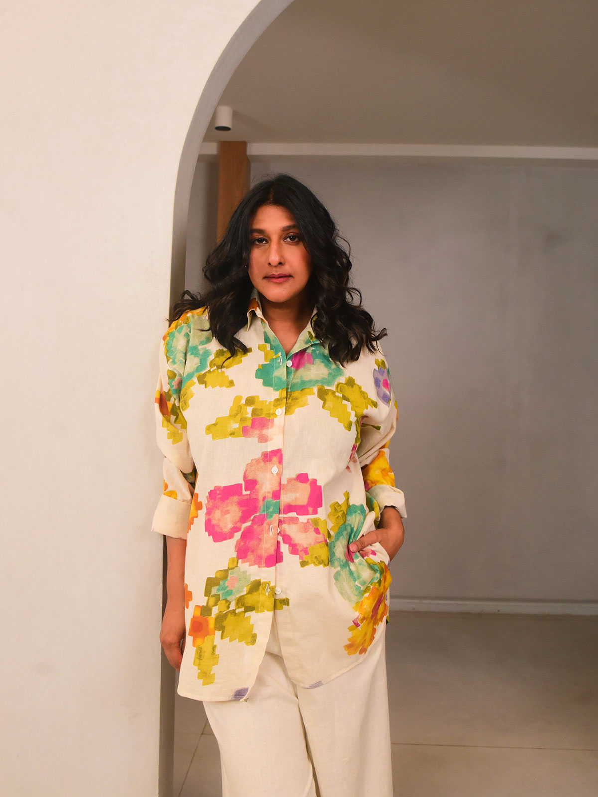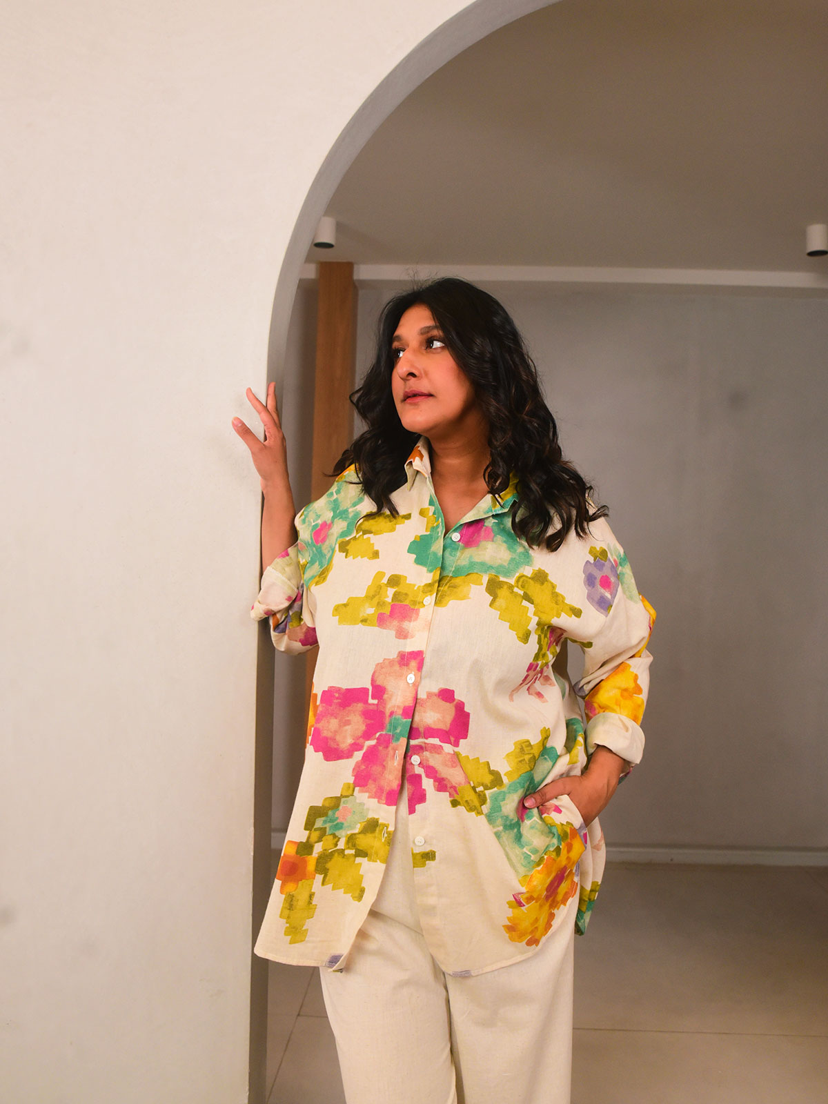 Effortlessly cool and ultra-comfy, this relaxed oversized shirt is made from our exclusive cream floral printed cotton. With a classic collar and button-down front, it's perfect for everyday wear. Pair it with matching shorts for a coordinated summer look or layer over a tank and jeans. The loose, airy fit keeps you stylish and at ease in warmer weather.