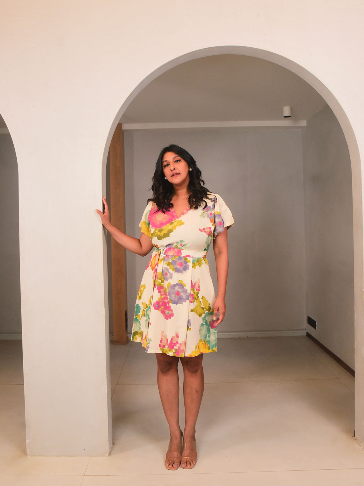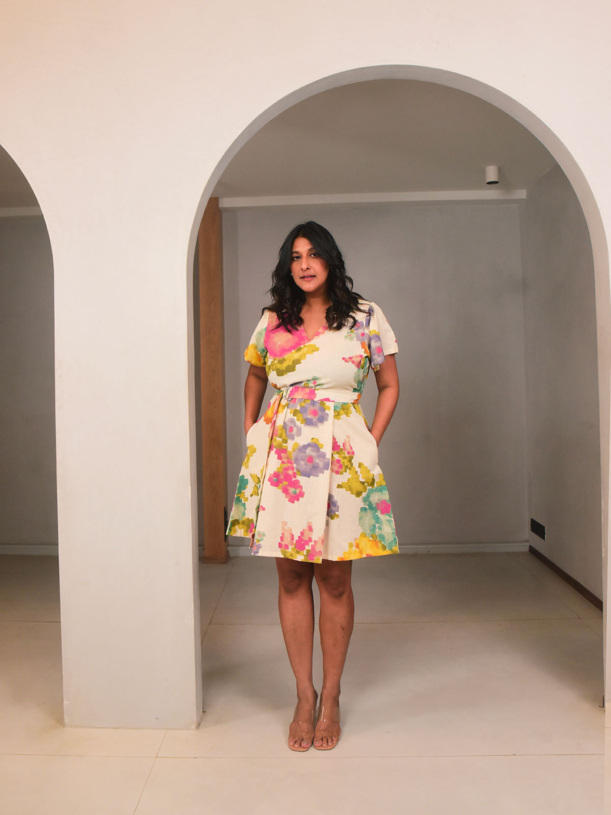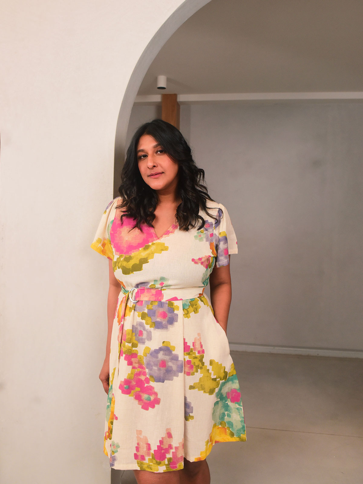 Chic and breezy, this short pleated dress is crafted in our exclusive cream floral printed cotton, ideal for sunny days. Featuring short sleeves, a flattering V-neckline, and box pleats below the yoke for added structure, it offers a relaxed yet polished look. The comfort fit and side pockets make it everyday-friendly, while the detachable belt lets you define the waist. Style with flats for a casual brunch or weekend stroll.