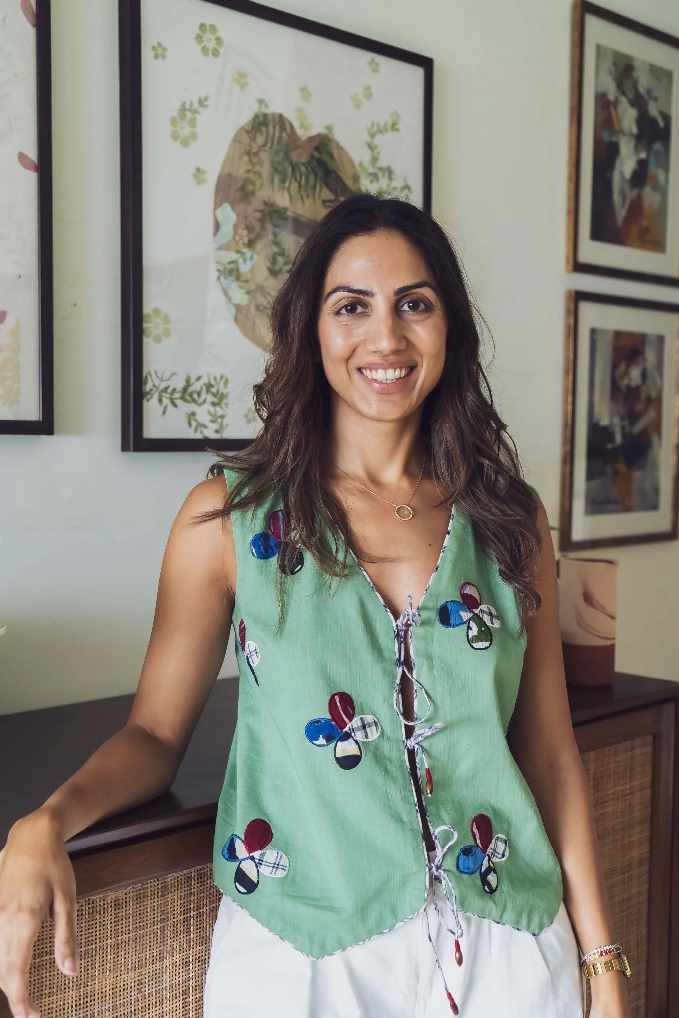 Crafted in breathable cotton and hand-dyed in seafoam green, this waistcoat features whimsical hand-cut appliqué floral motifs in bright pops of red, white, and blue—this piece is finished with a charming tie-up front and playful scalloped hem.