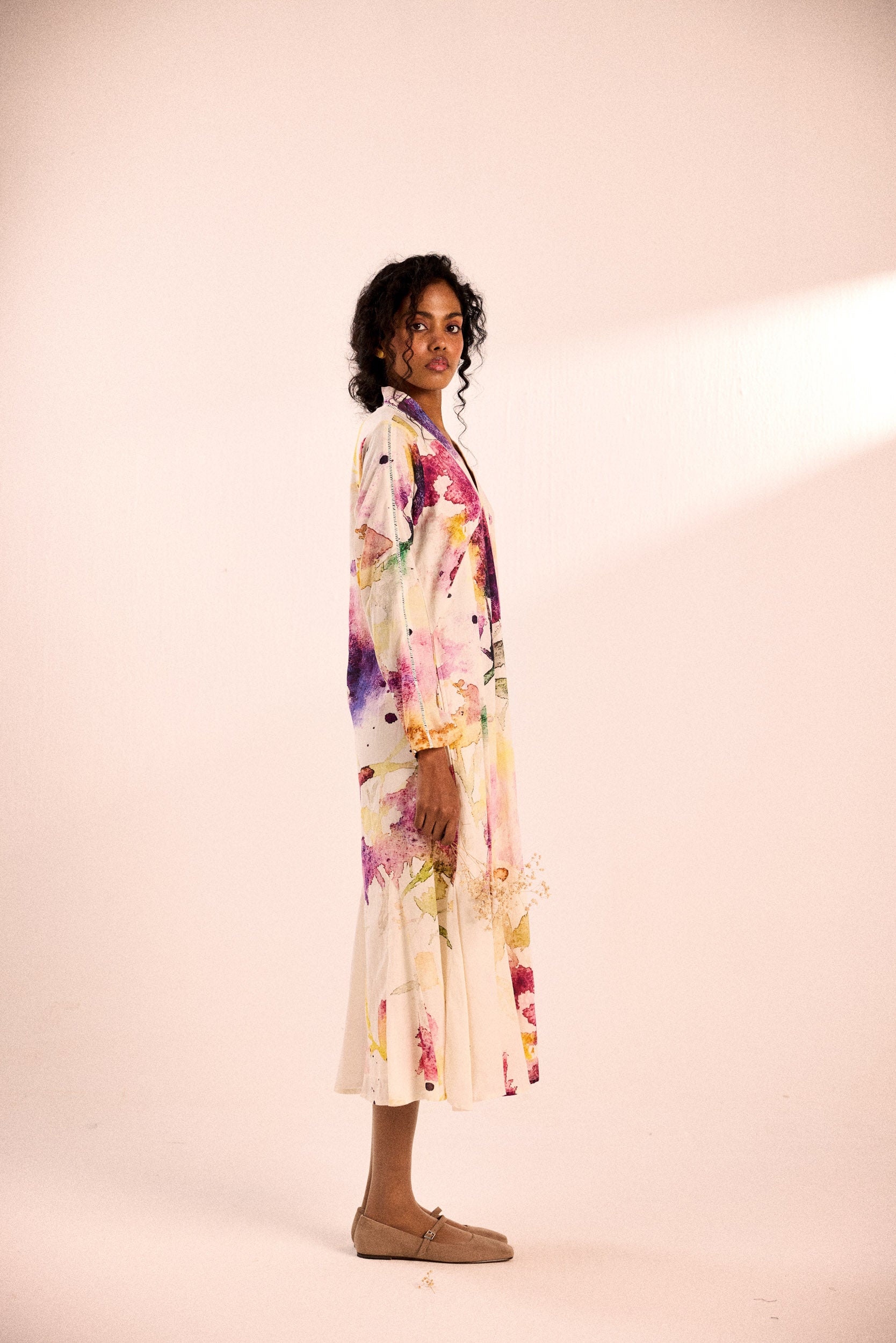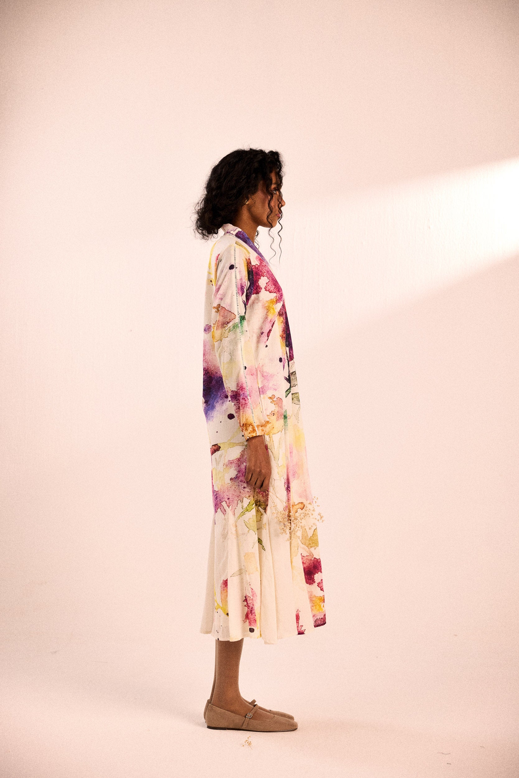 A midi dress on a white base , featuring a V-neckline, ladder lace detailing along the neckline and sleeves, and abstract watercolor-inspired prints. Designed for comfort with a flowy fit and functional pockets.