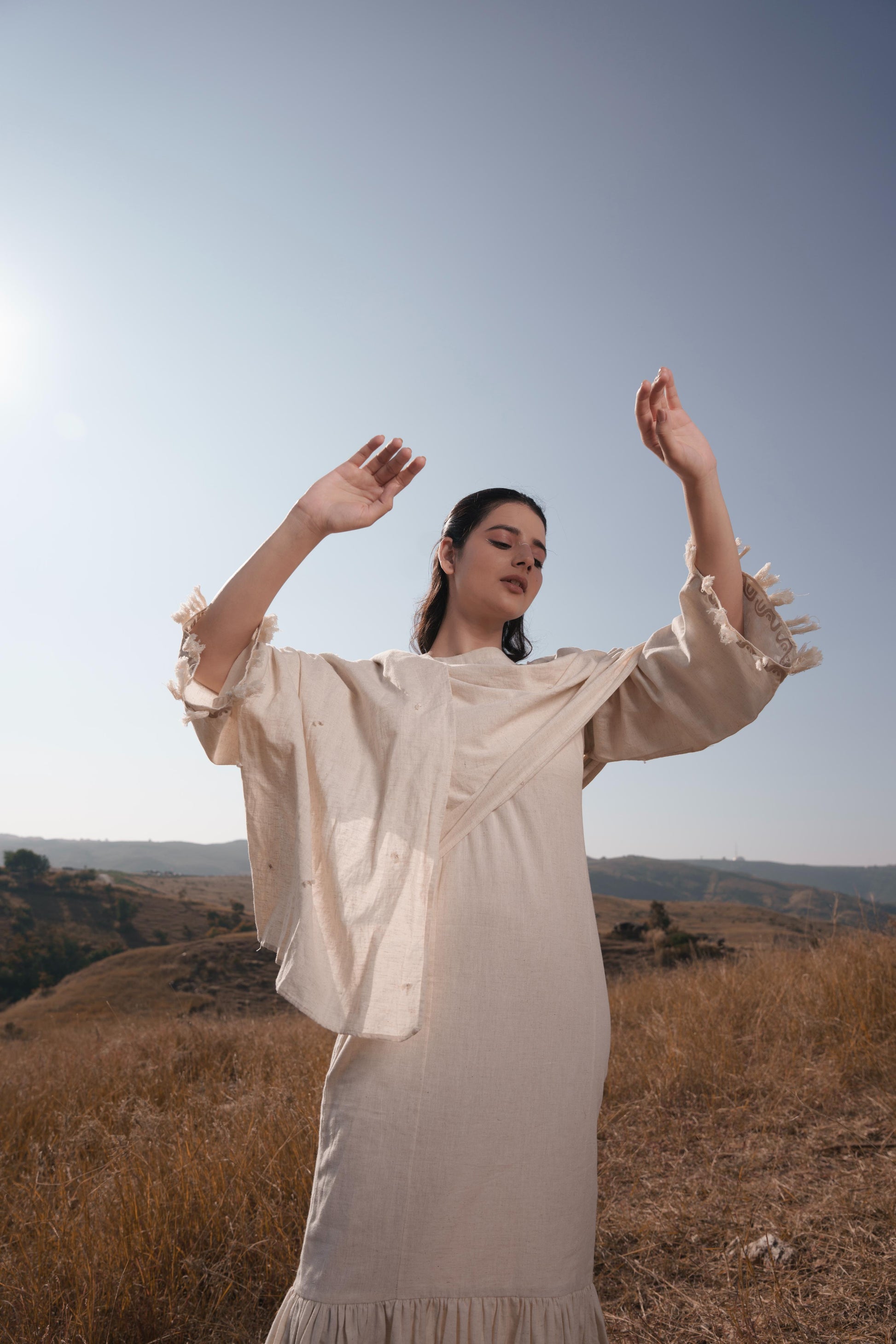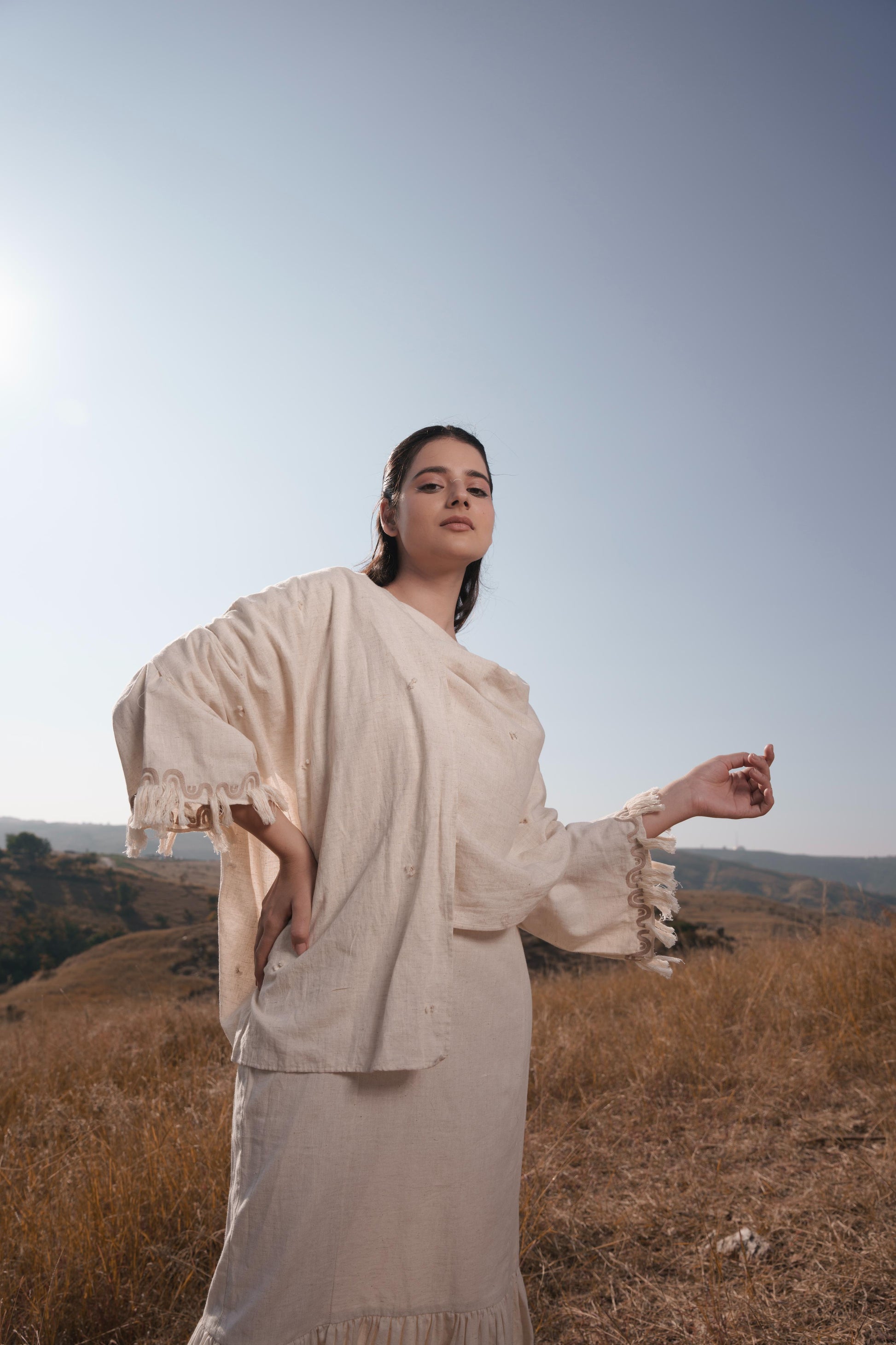 The embroidery detail on the yoke and puffed sleeves accentuates its feminine allure, while knots on the neckline and sleeves add a playful and stylish accent. A standout feature is the addition of tassels with crochet flower details, creating a whimsical and intricate focal point.