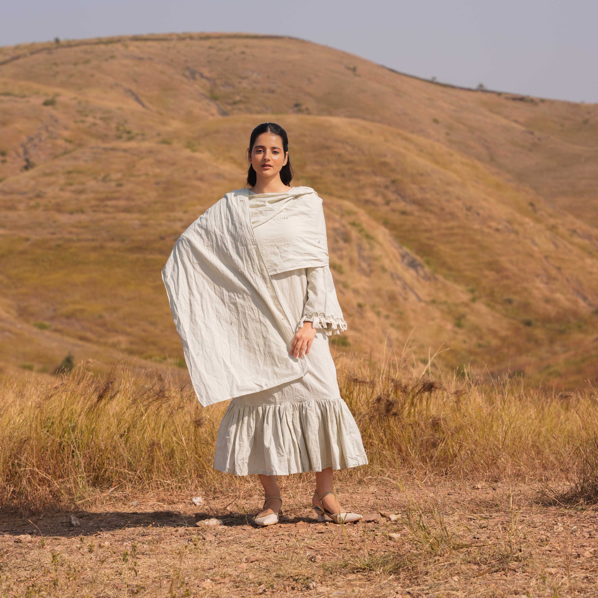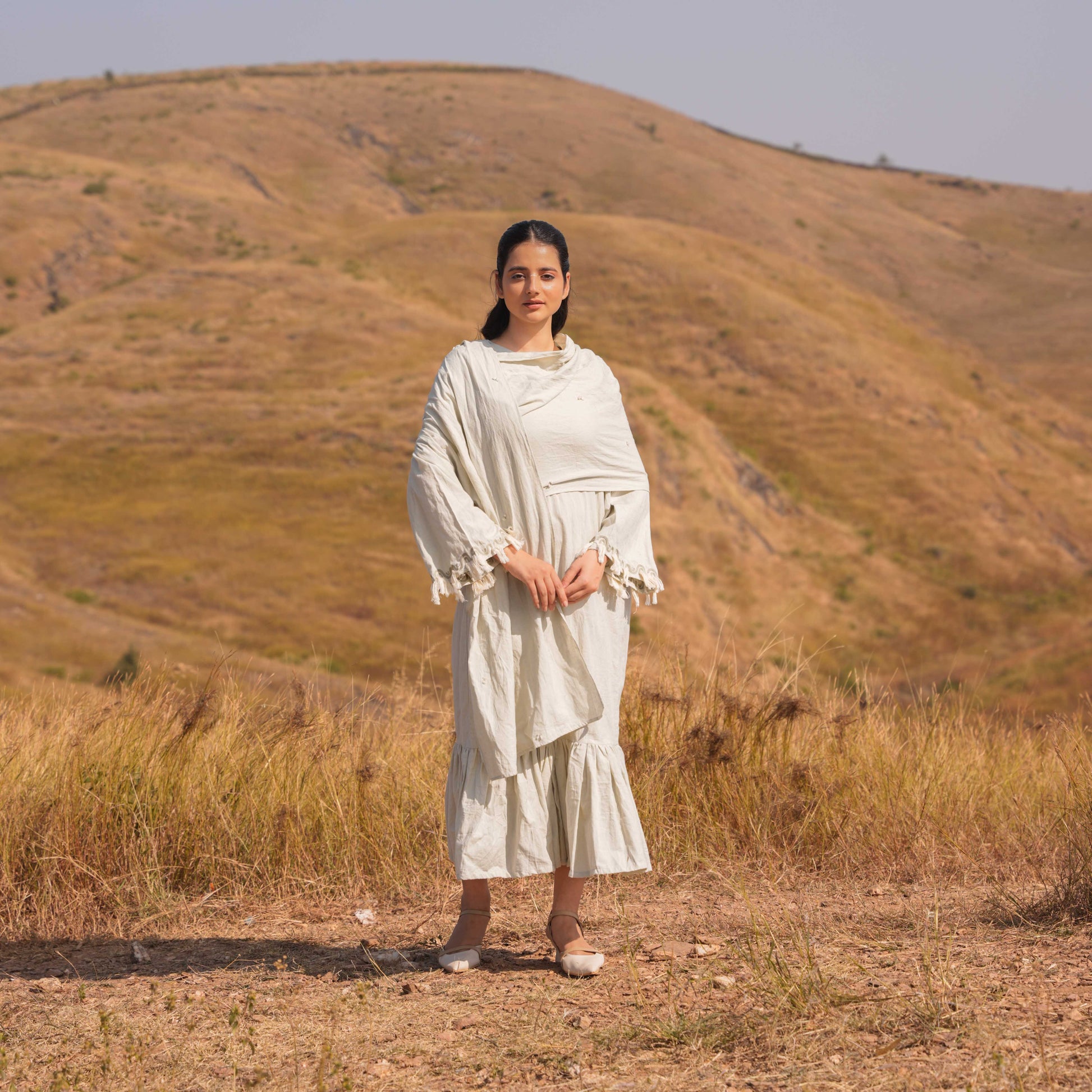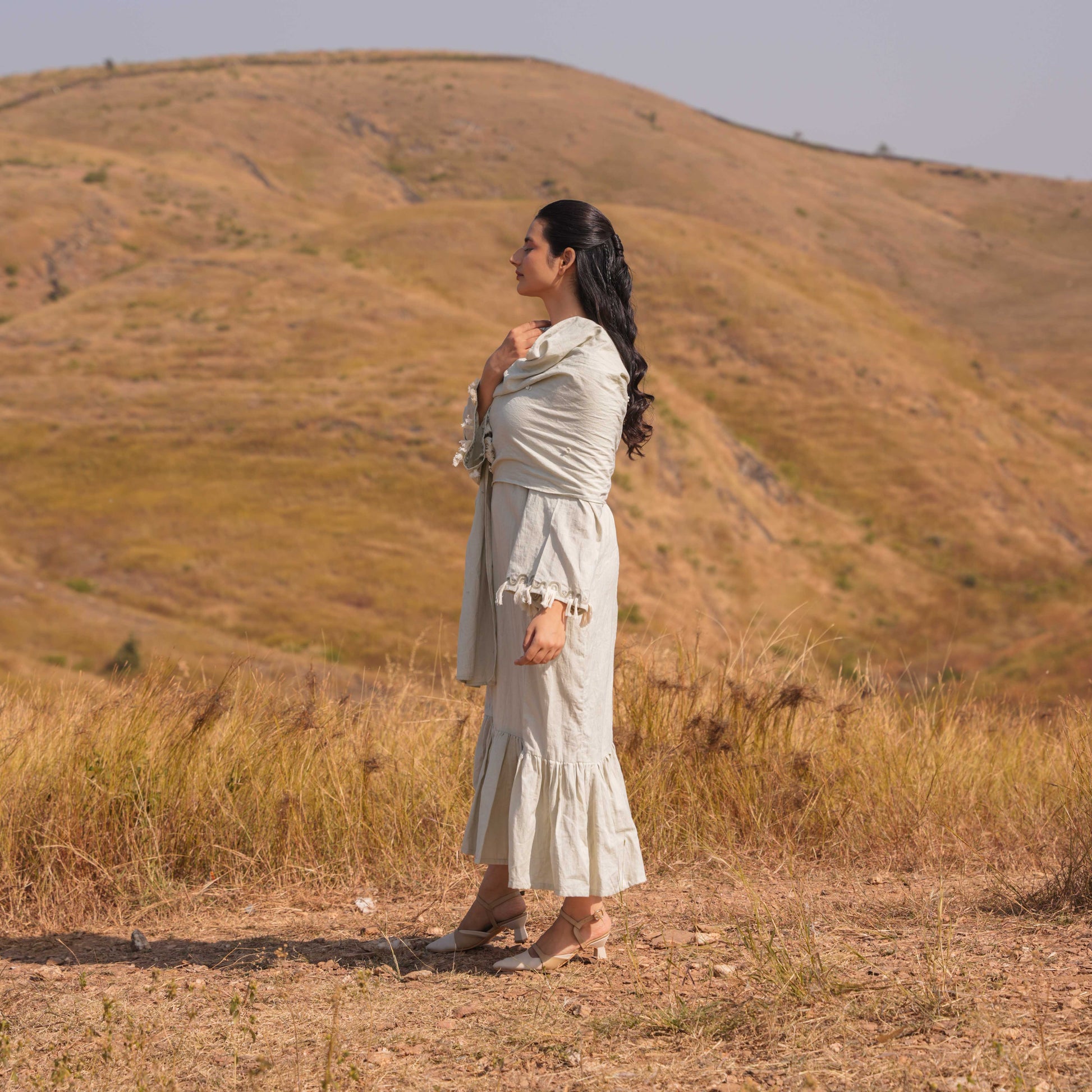 The embroidery detail on the yoke and puffed sleeves accentuates its feminine allure, while knots on the neckline and sleeves add a playful and stylish accent. A standout feature is the addition of tassels with crochet flower details, creating a whimsical and intricate focal point.