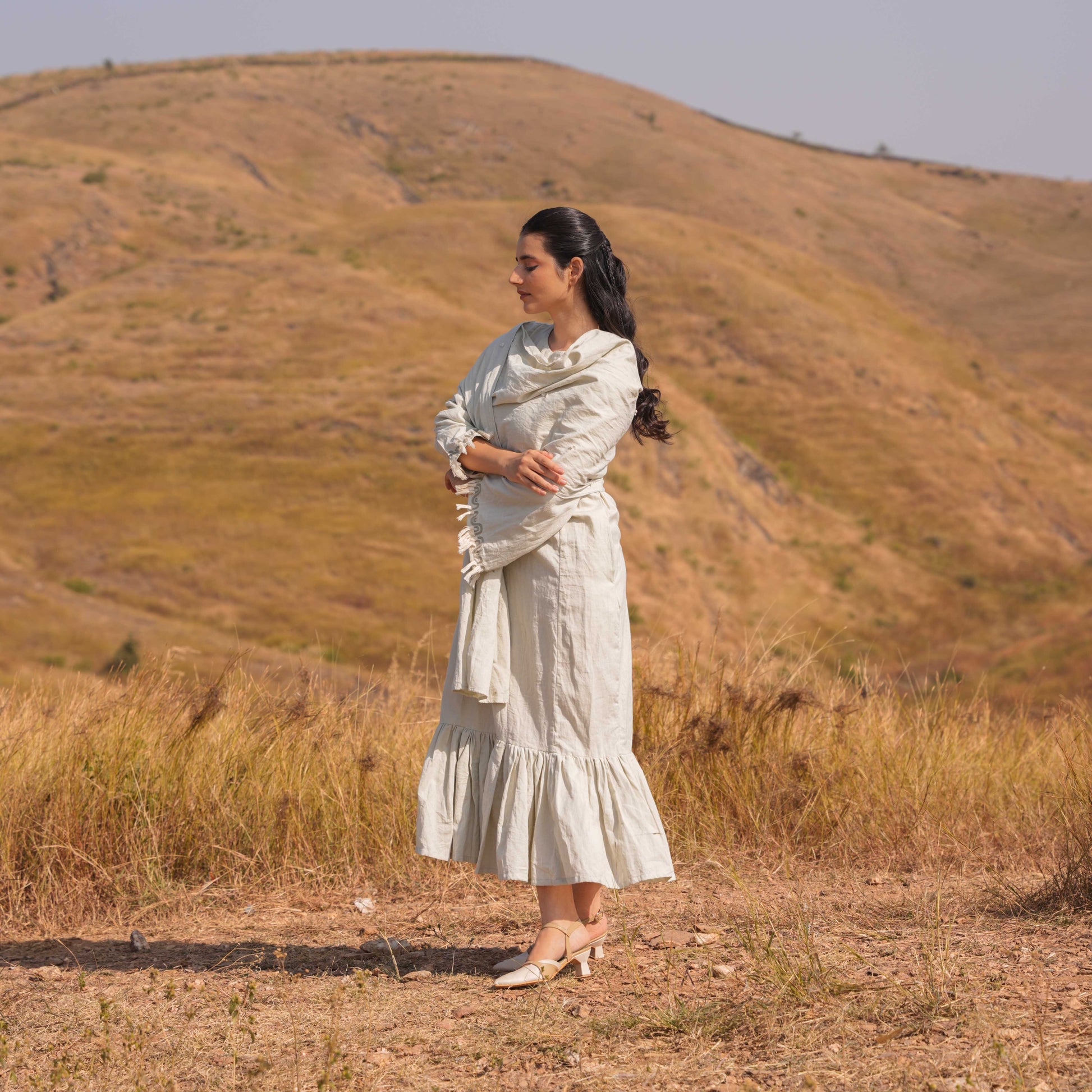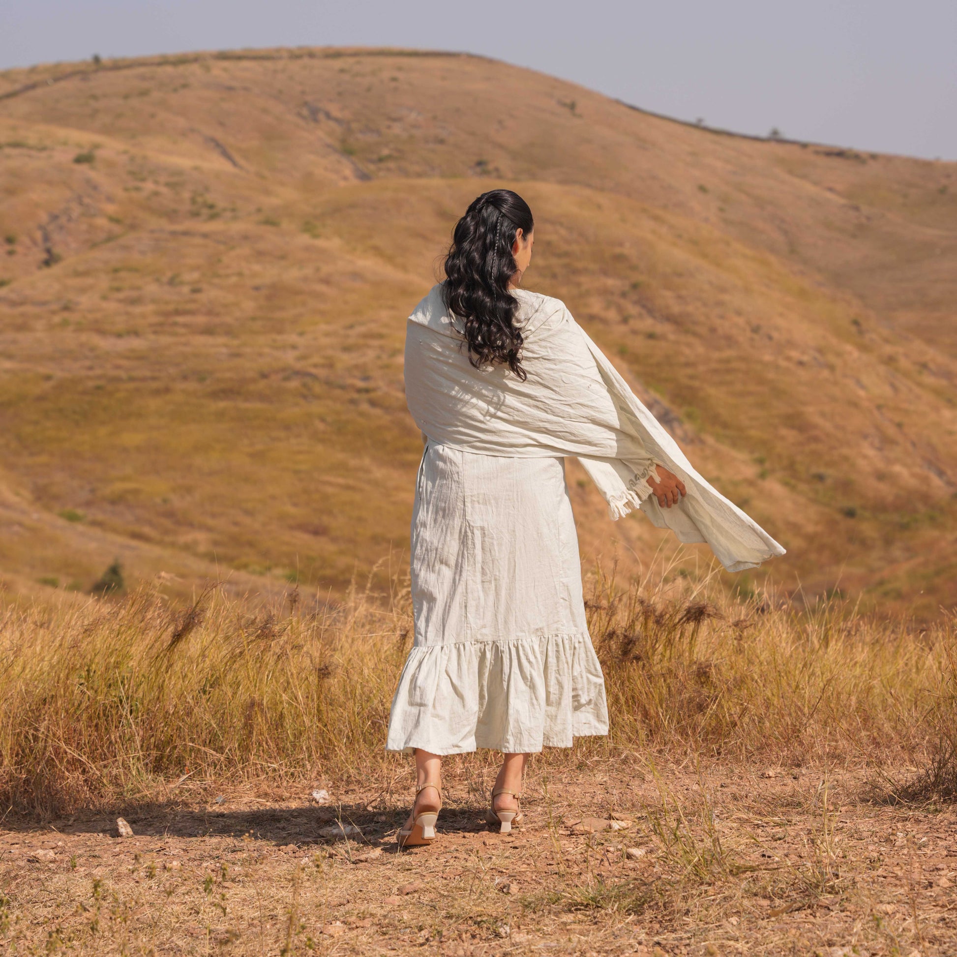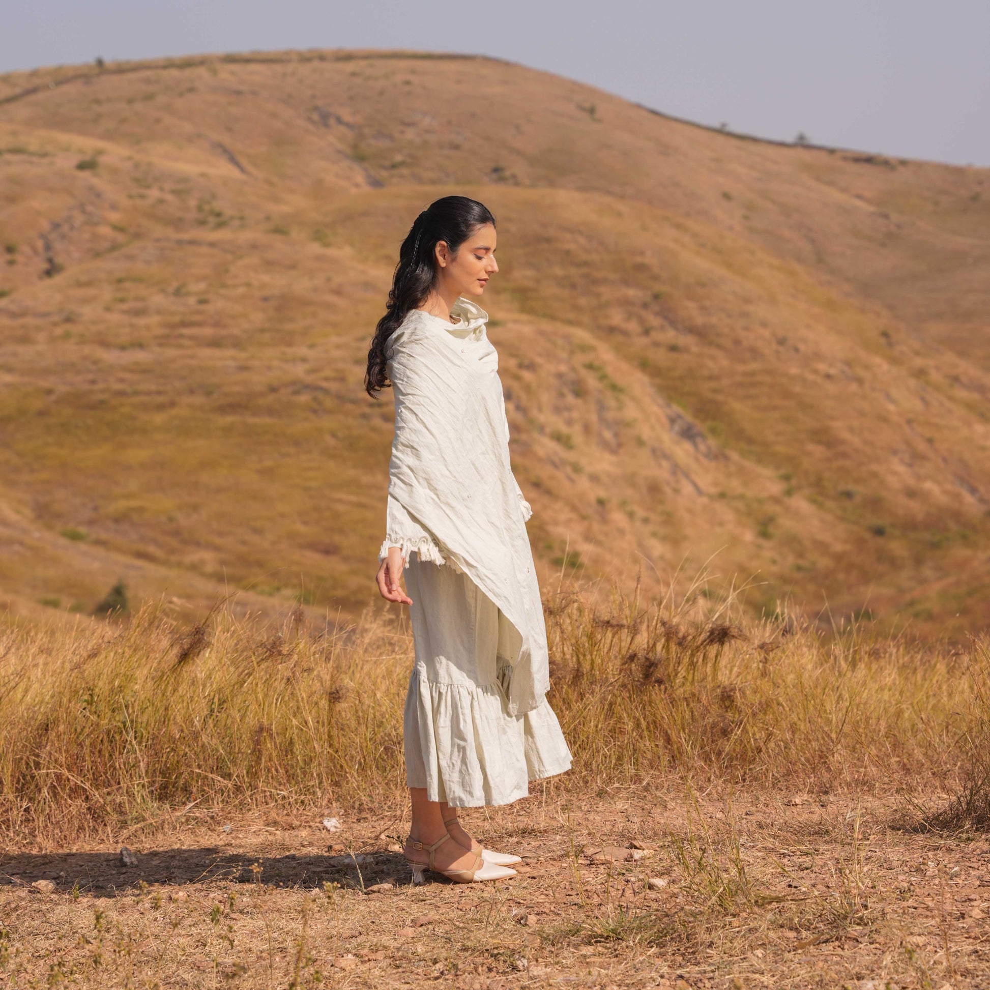 The embroidery detail on the yoke and puffed sleeves accentuates its feminine allure, while knots on the neckline and sleeves add a playful and stylish accent. A standout feature is the addition of tassels with crochet flower details, creating a whimsical and intricate focal point.