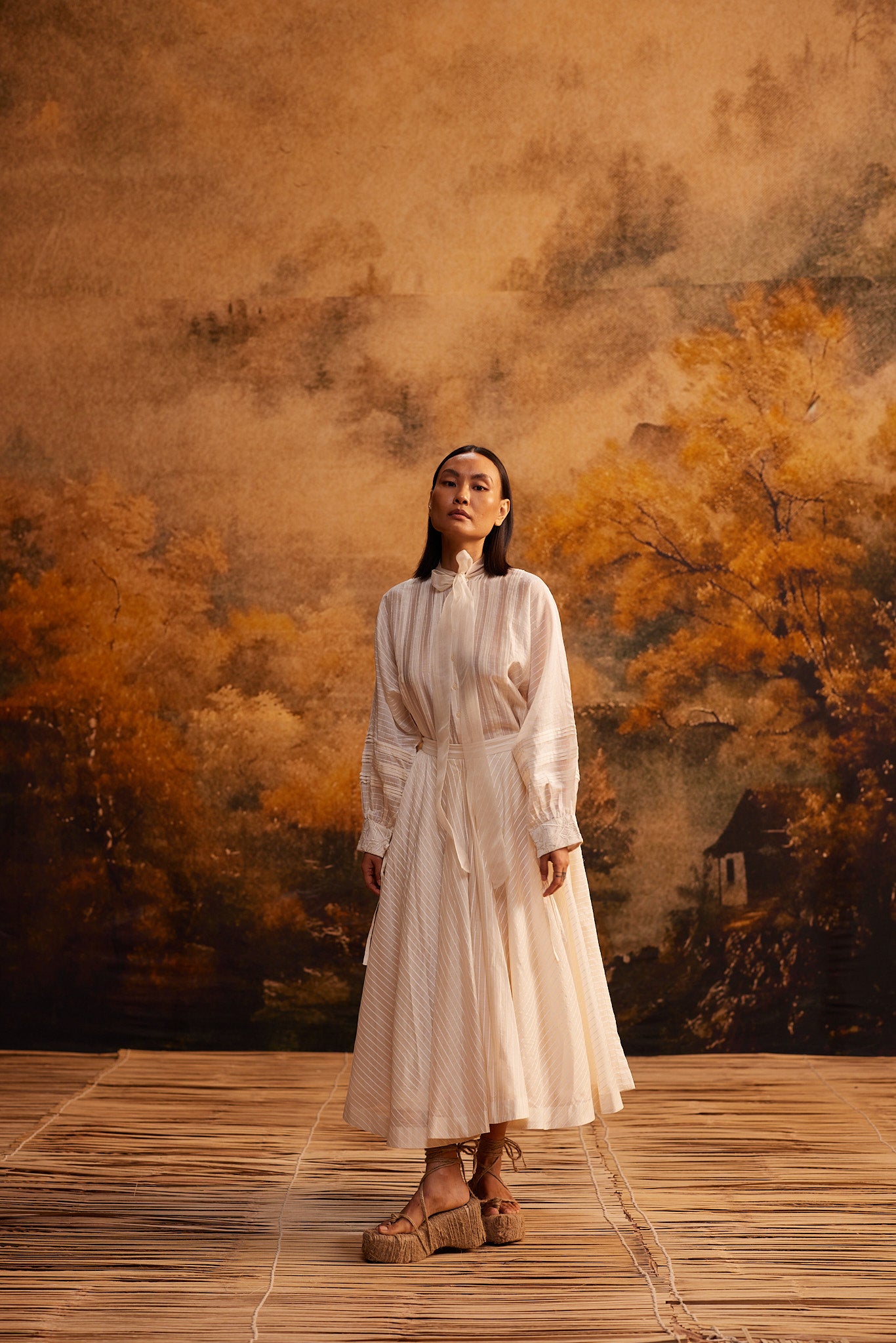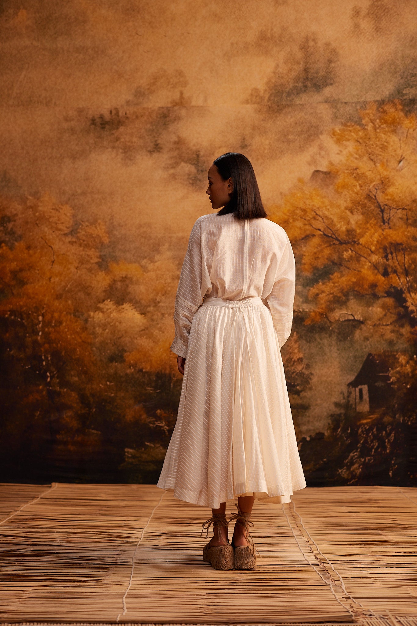 An embodiment of fluid elegance, the Enso Stripe Skirt is crafted from screen printed Chanderi, creating graceful movement with every step. The subtle stripes add a timeless sophistication, while the partially elasticated waistband ensures a comfortable, flattering fit. Designed for versatility, this skirt transitions seamlessly from day to evening—pair it with a tucked-in blouse for a polished look, or style it with a relaxed sweater for effortless charm.
