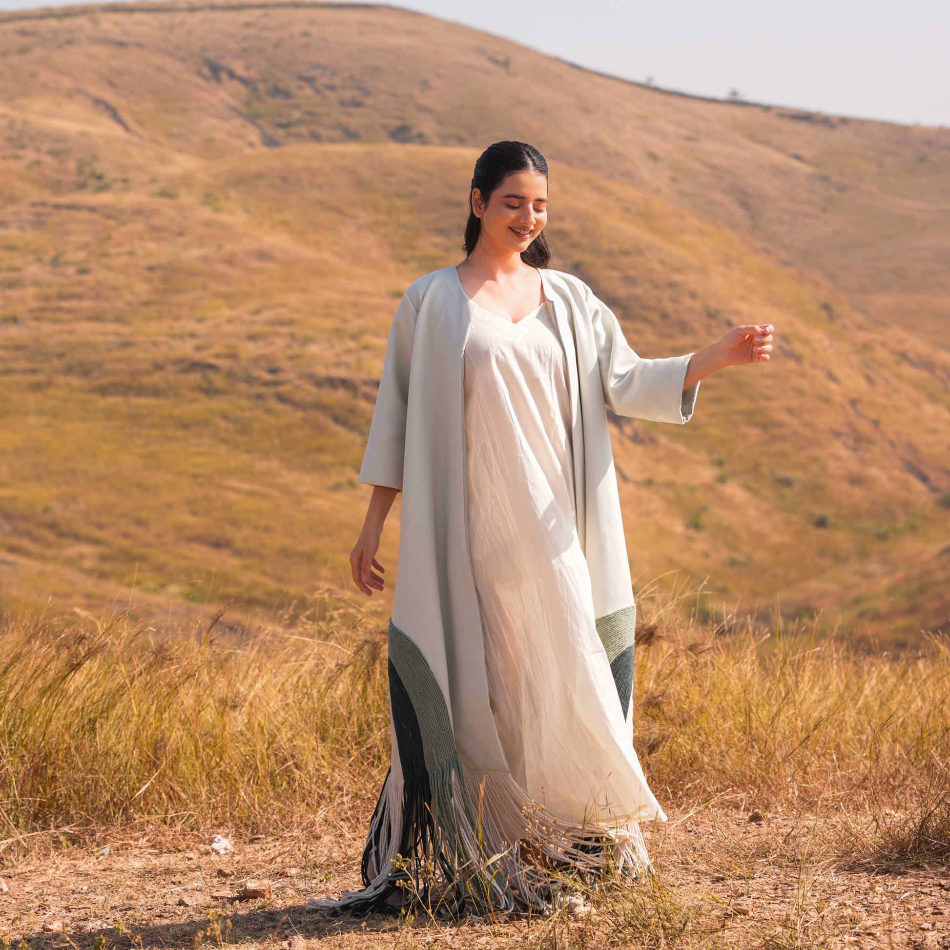 Intricate shoulder-to-sleeve lace detailing adds a touch of femininity and grace, while embroidered buttons along the neckline offer a polished finish. A standout feature of this dress is the tassel detailing on the back yoke line, adding whimsical charm and a unique focal point to the ensemble