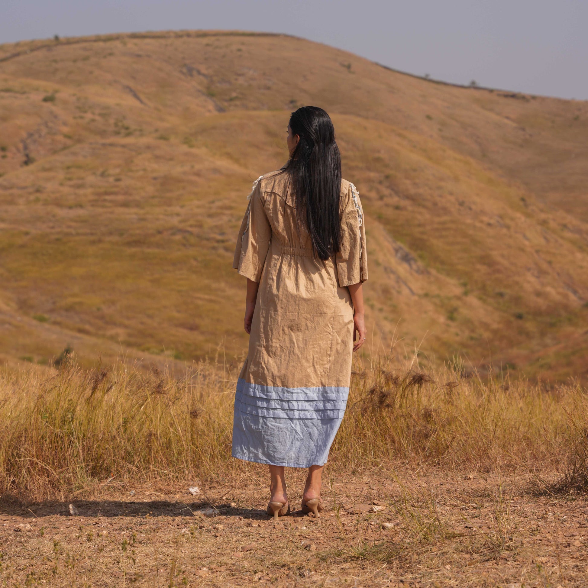 Intricate shoulder-to-sleeve lace detailing adds a touch of femininity and grace, while embroidered buttons along the neckline offer a polished finish. A standout feature of this dress is the tassel detailing on the back yoke line, adding whimsical charm and a unique focal point to the ensemble
