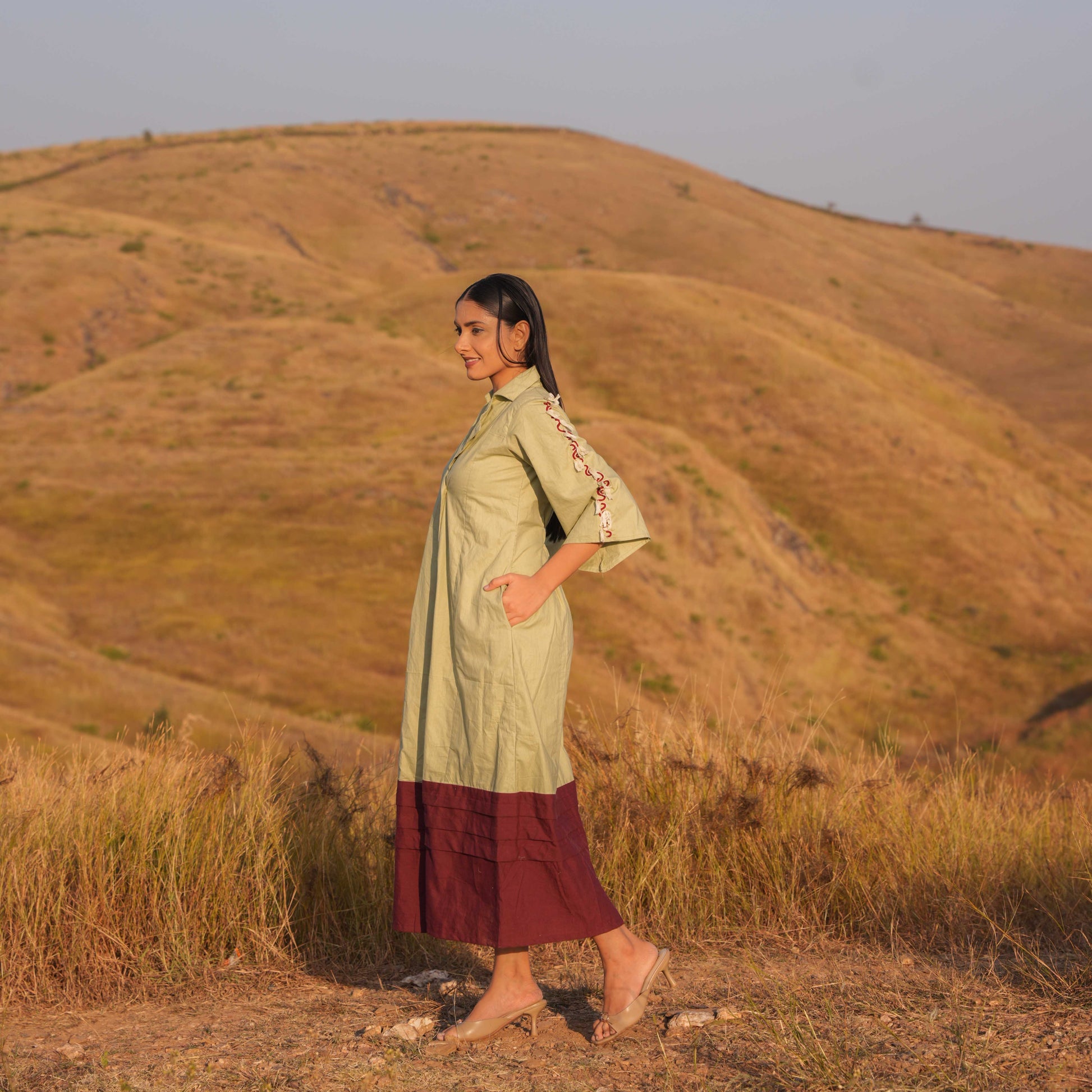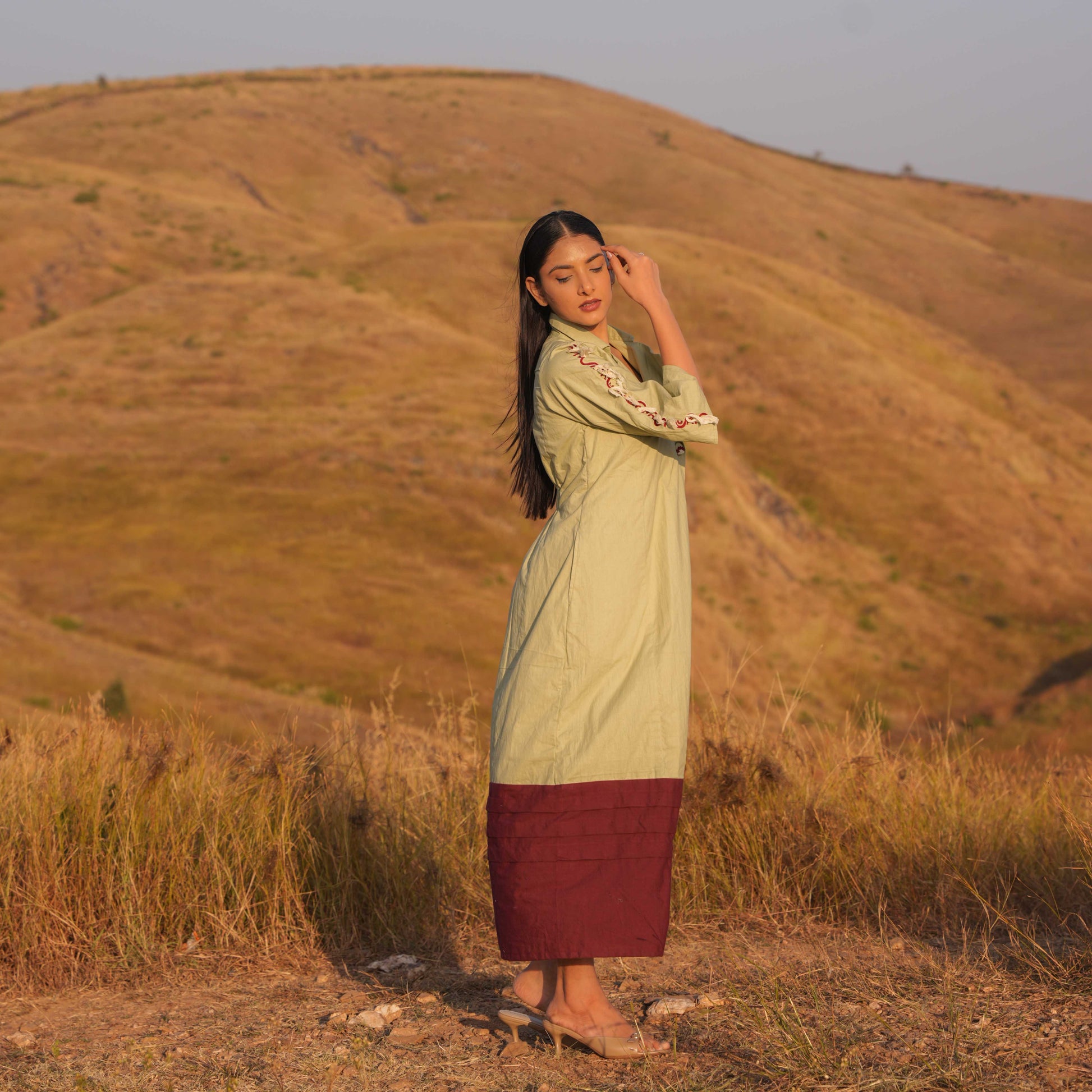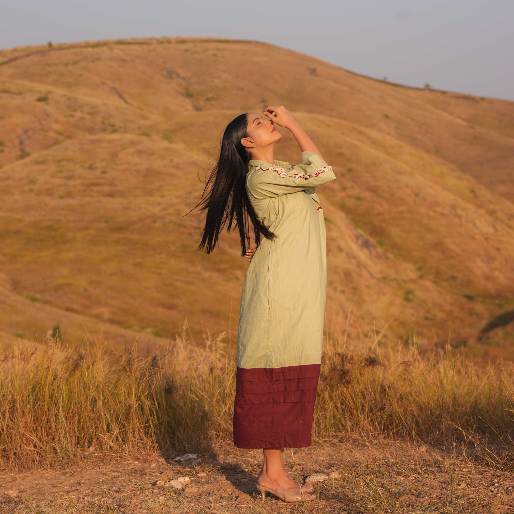 Intricate shoulder-to-sleeve lace detailing adds a touch of femininity and grace, while embroidered buttons along the neckline offer a polished finish. A standout feature of this dress is the tassel detailing on the back yoke line, adding whimsical charm and a unique focal point to the ensemble