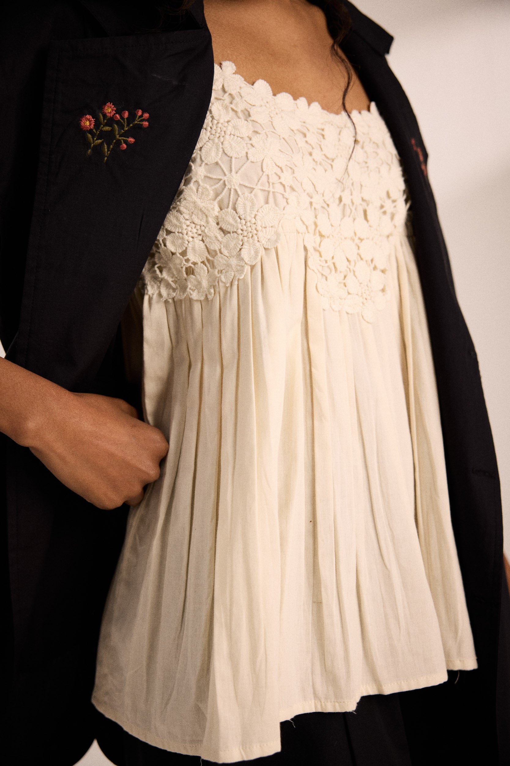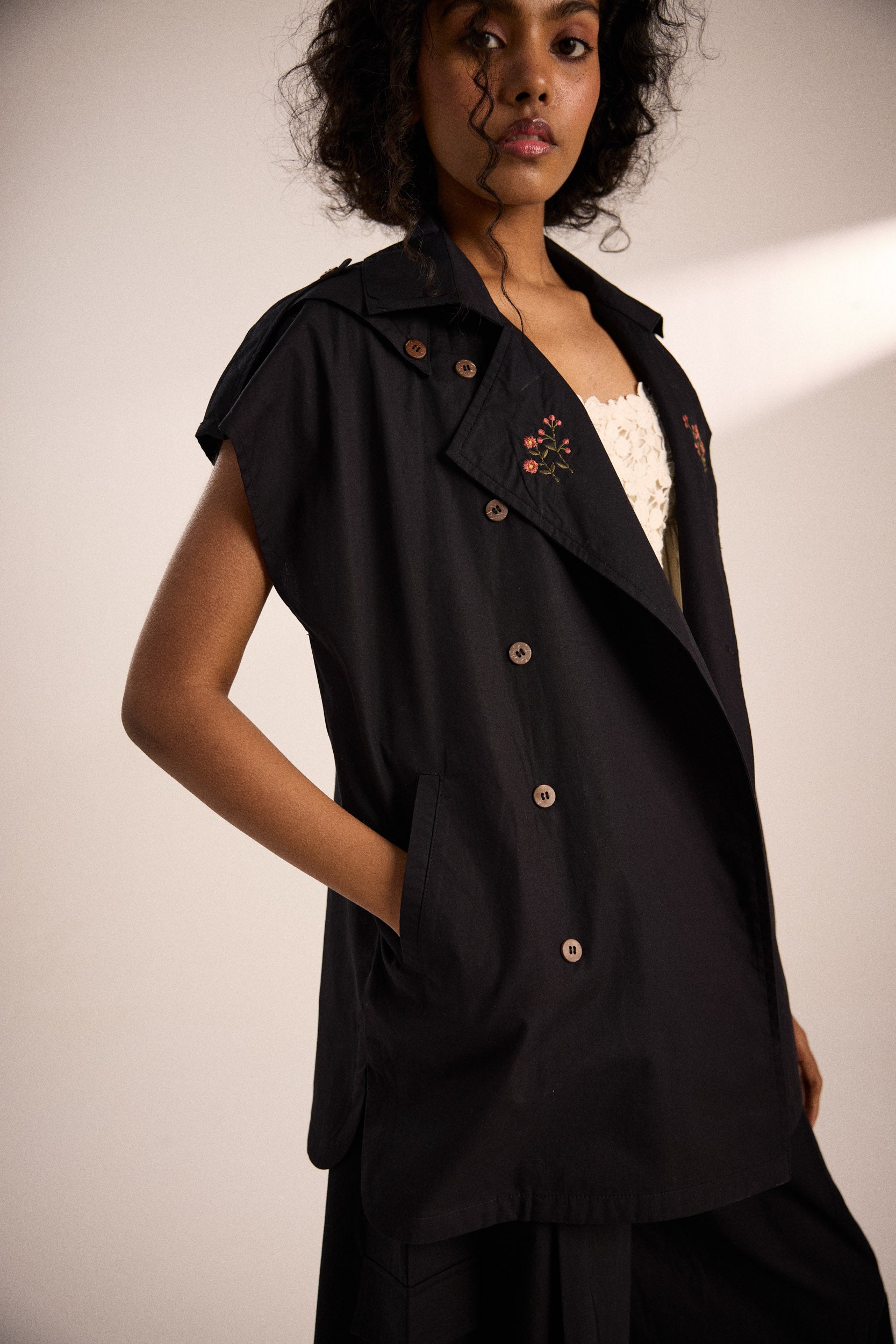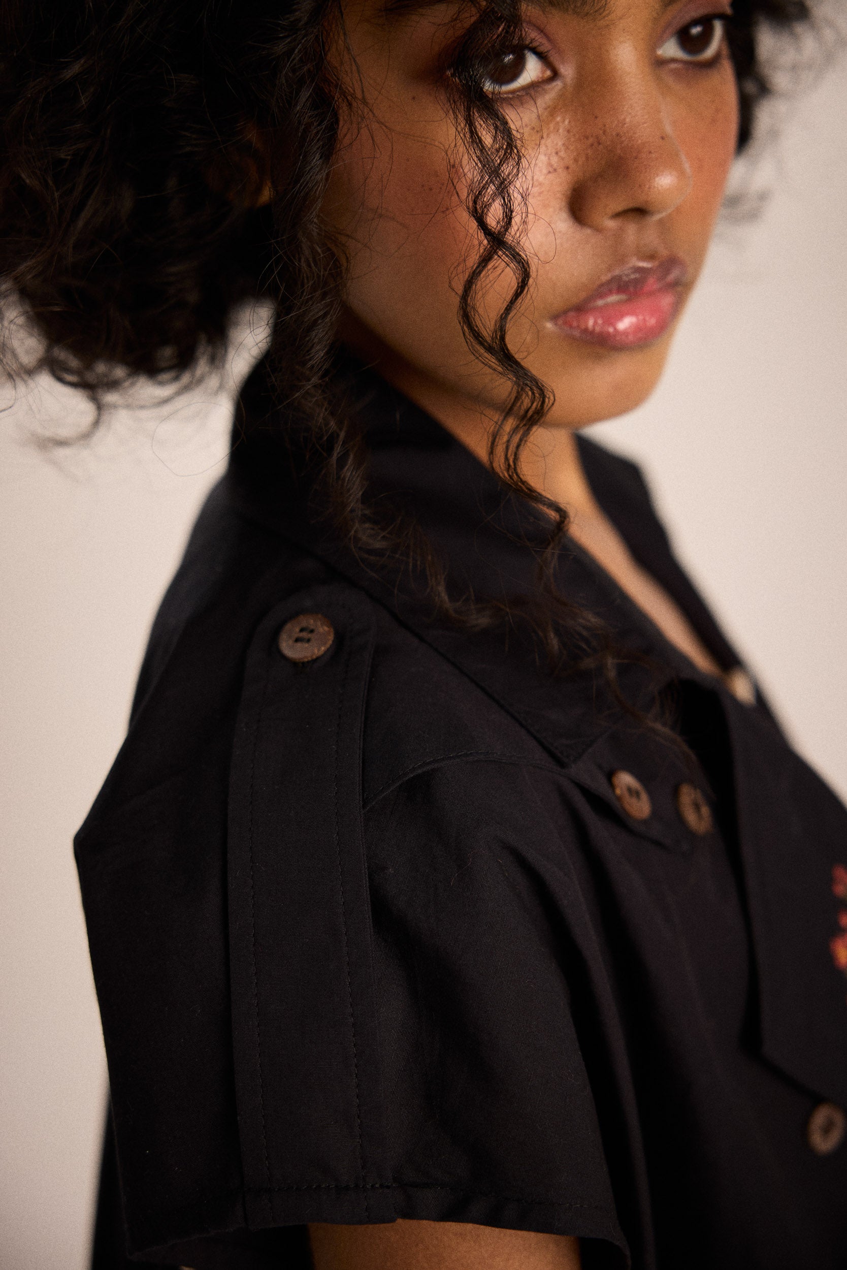 An all-black poplin co-ord set featuring a tunic with a notch lapel, delicate embroidery, and front button opening, along with pockets. The flared pants include flap pockets for added style and functionality.