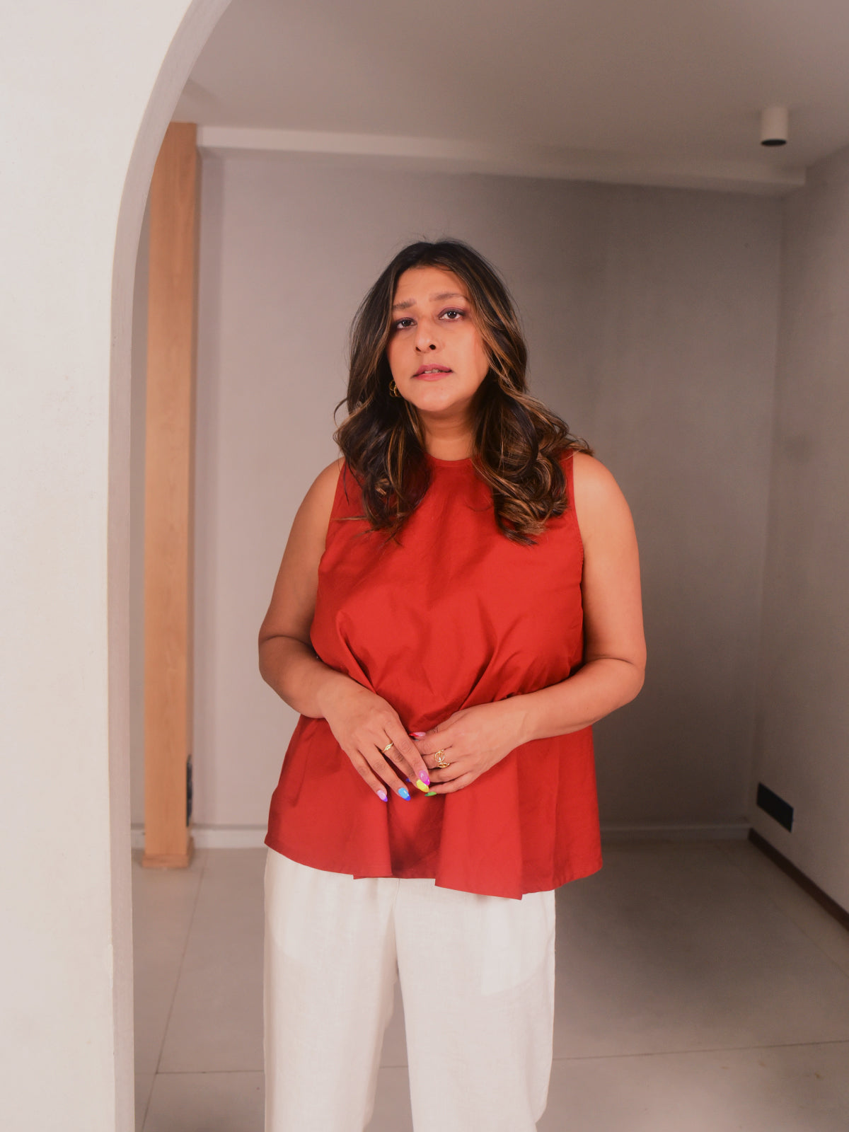 Made in our vibrant brick red-dyed cotton, this Everyday Top brings a pop of earthy color to your professional wardrobe. Its breezy flare and minimal detailing make it a comfortable go-to that still feels polished. Style with beige or off-white trousers and leather sandals for a warm, grounded look. Great for team lunches, open office days, or after-work catch-ups.