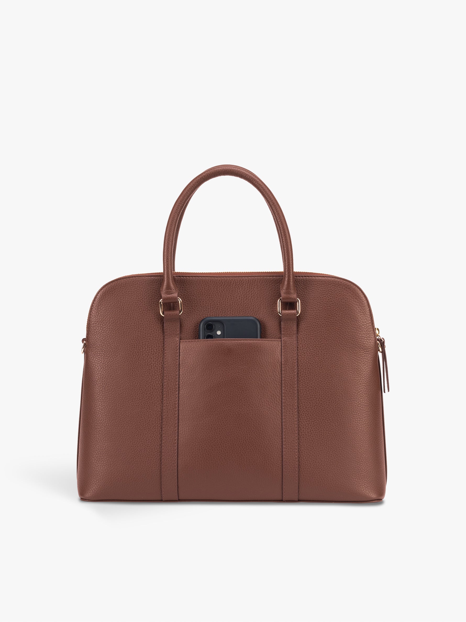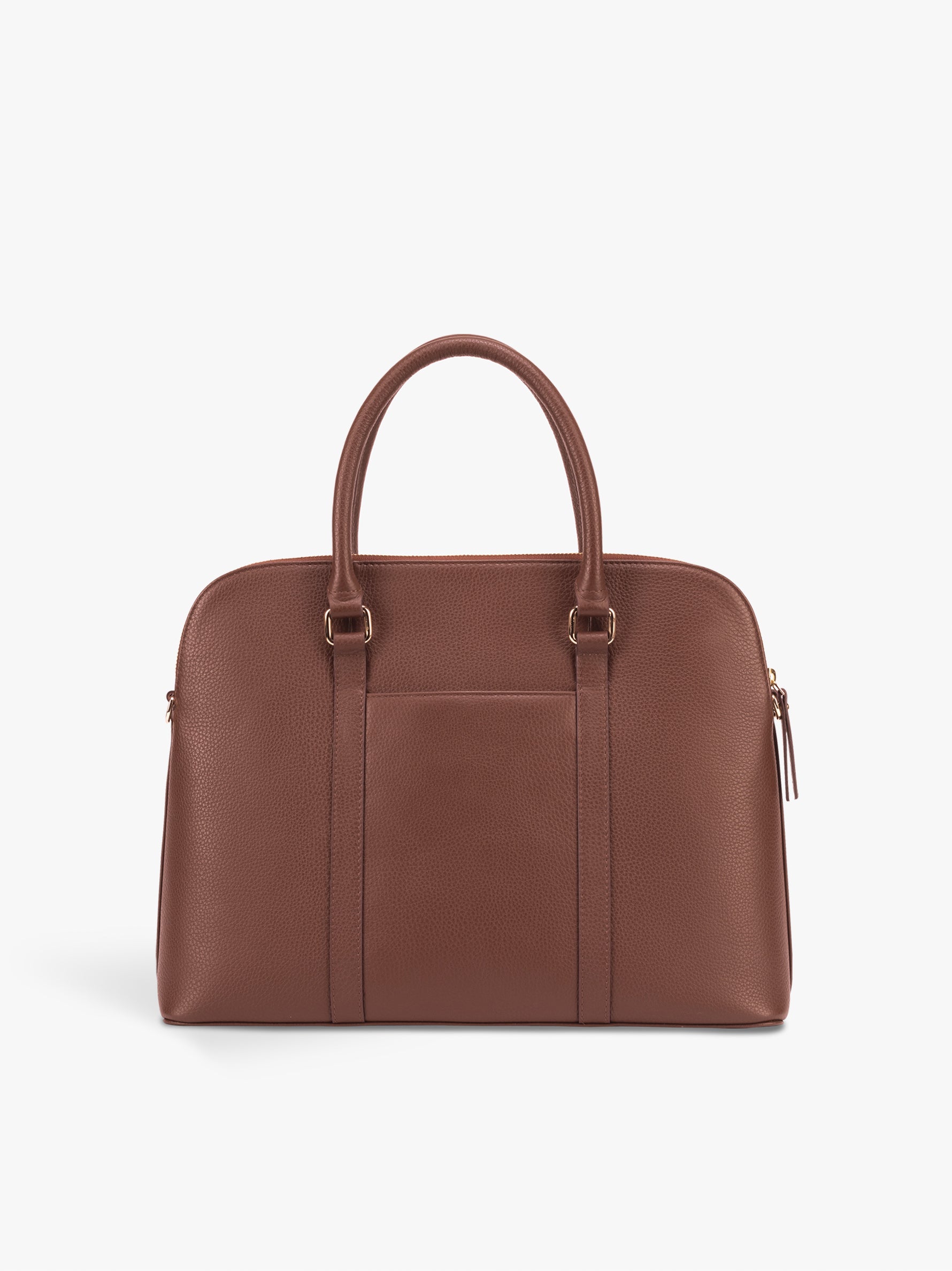 An elegant way to carry your laptop. Inside its sleek & feminine silhouette, the Executive Laptop Bag boasts ample room for your laptop, chargers & other work essentials. The bag comes with a cushioned laptop compartment to keep your laptop secure while on the move. It also features an external phone pocket to allow easy access to your mobile phone at any time. Fits: up to 14” laptops Slots & Features : 1 main compartment with a zipper closure, 1 cushioned laptop compartment for 14" laptops, 1 interior zipper pocket, 1 back phone pocket with a magnet closure, light gold fittings , YKK nylon zipper & OOK metal zipper, jacquard branded lining