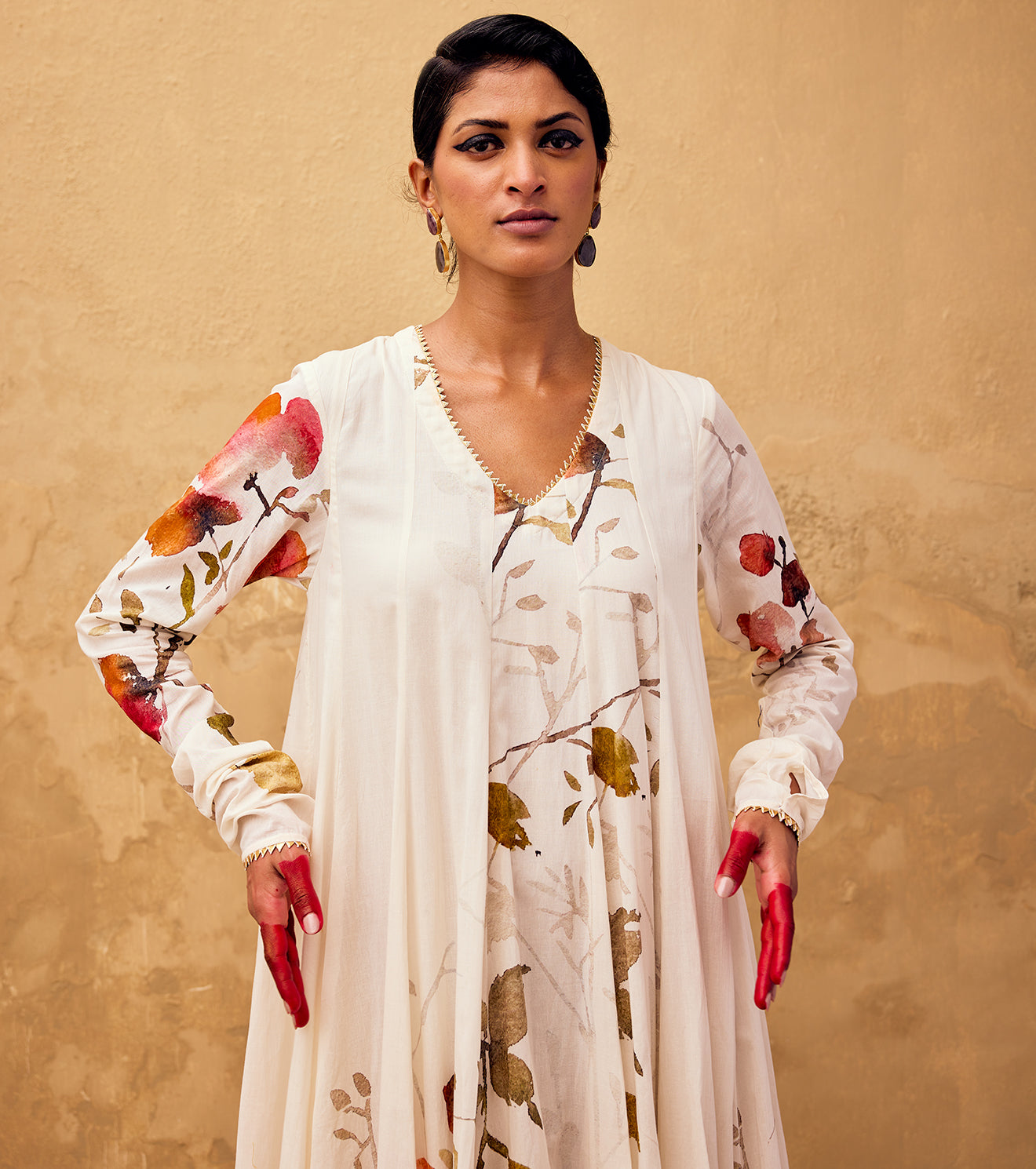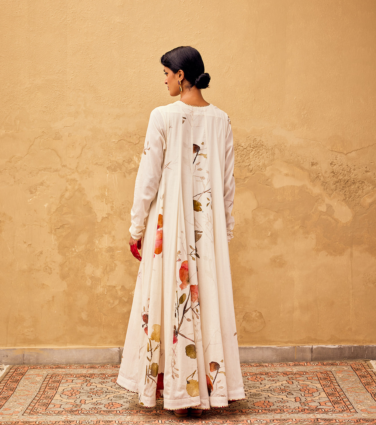 A voluminous floral printed maxi dress with bijiya gota detailing in the neckline , hemline and cuffs crafted from breathable soft cotton mul fabric.