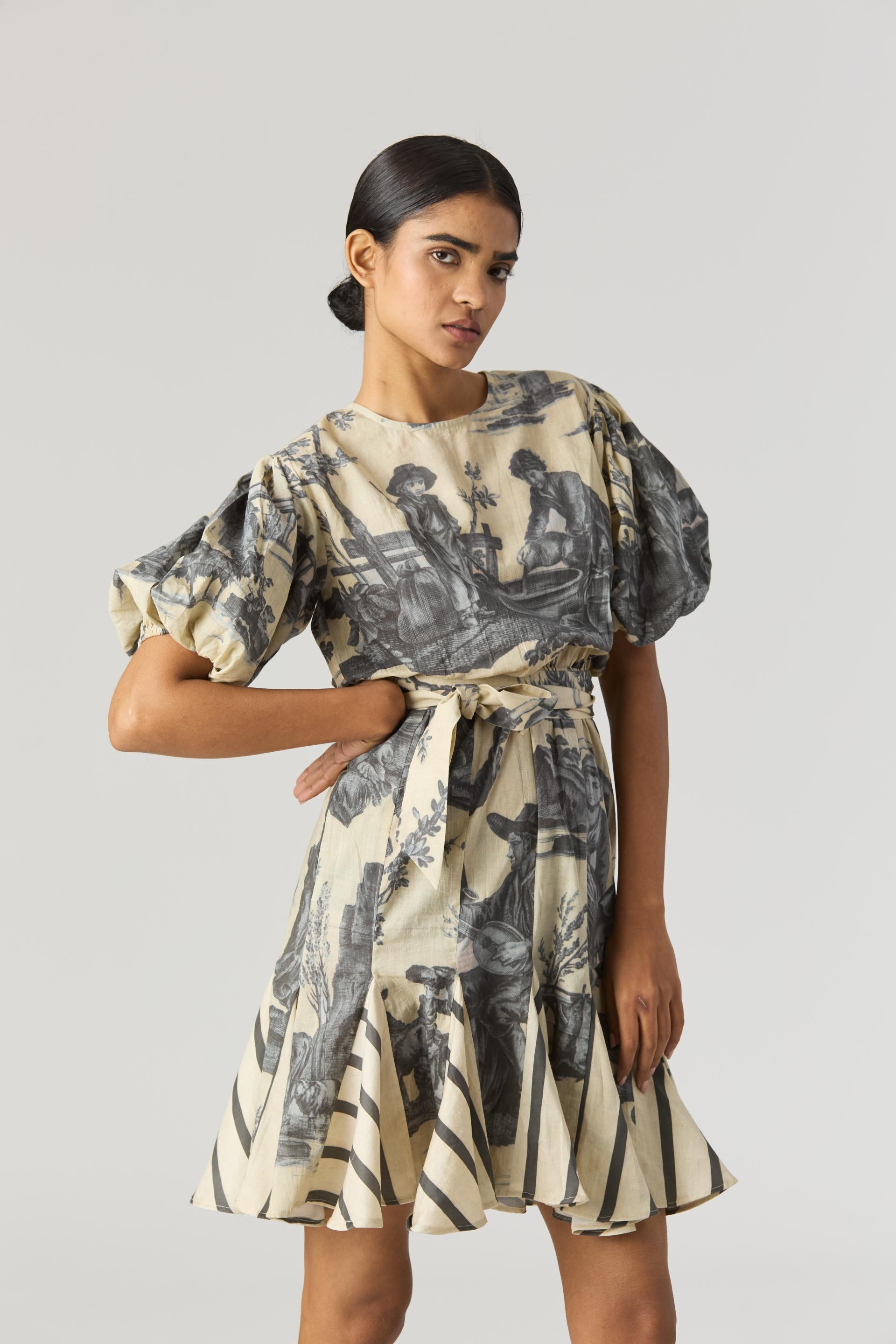 Featuring airy gathered sleeves, a full fluttery hem, and cut loose for a universally flattering fit, the Fiesta dress is a wardrobe staple. It is crafted in a print inspired by Toile de Jouy design depicting Roman monuments , also with figures dancing and gathered around a shrine. The godet in the skirt are in stripes complimenting the main print. The dress can be worn with or without our cinching hand-braided waist tie.