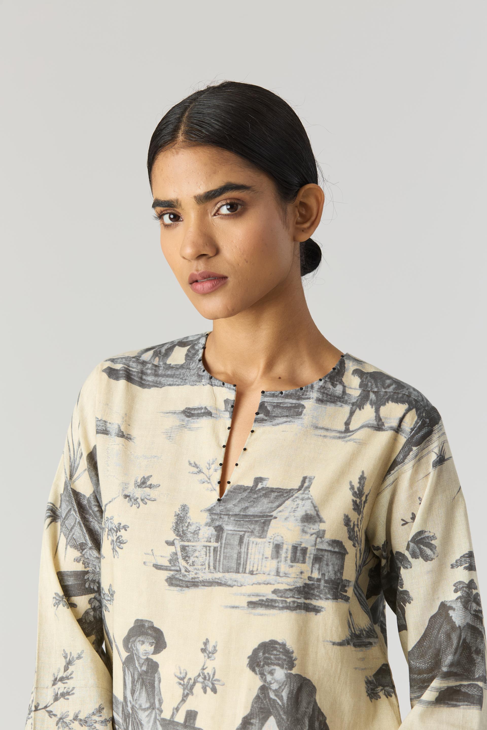 A slim short cotton kurta with a slight V neckline and three-quarter sleeves. It is crafted in a print inspired by Toile de Jouy design depicting Roman monuments , also with figures dancing and gathered around a shrine. The kurta has threadwork on the neckline and sleeve edges.