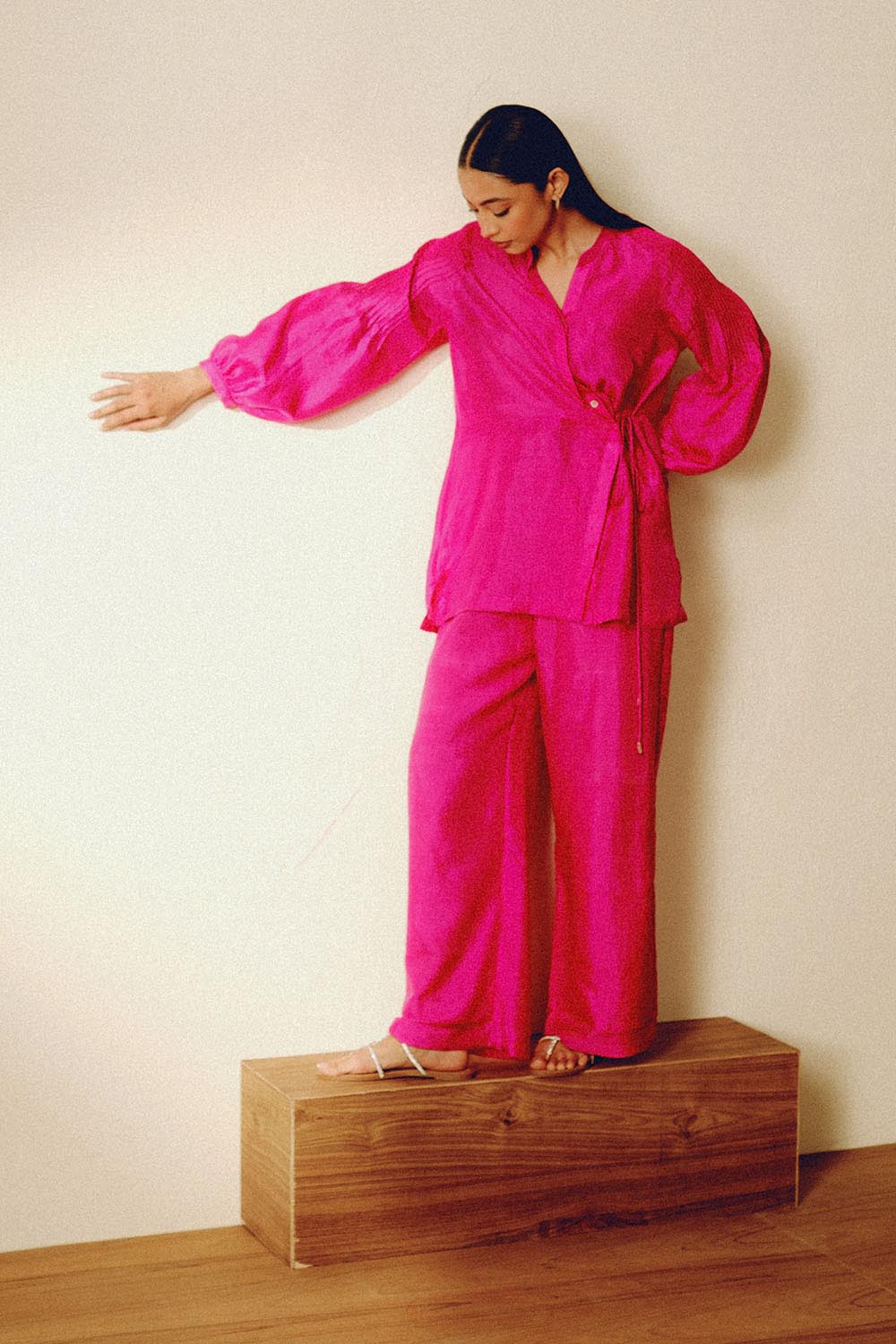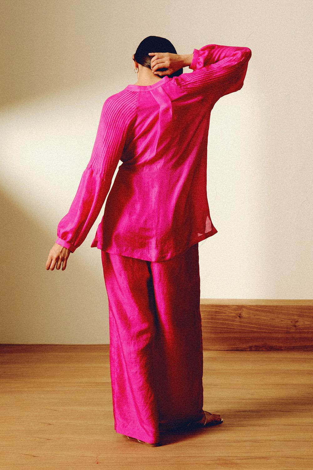 Handwoven mulberry silk raglan cut shirt with pintucks on the shoulders and an off-centre tie-up cord detail. The shirt is styled with solid pink high waisted relaxed trousers.