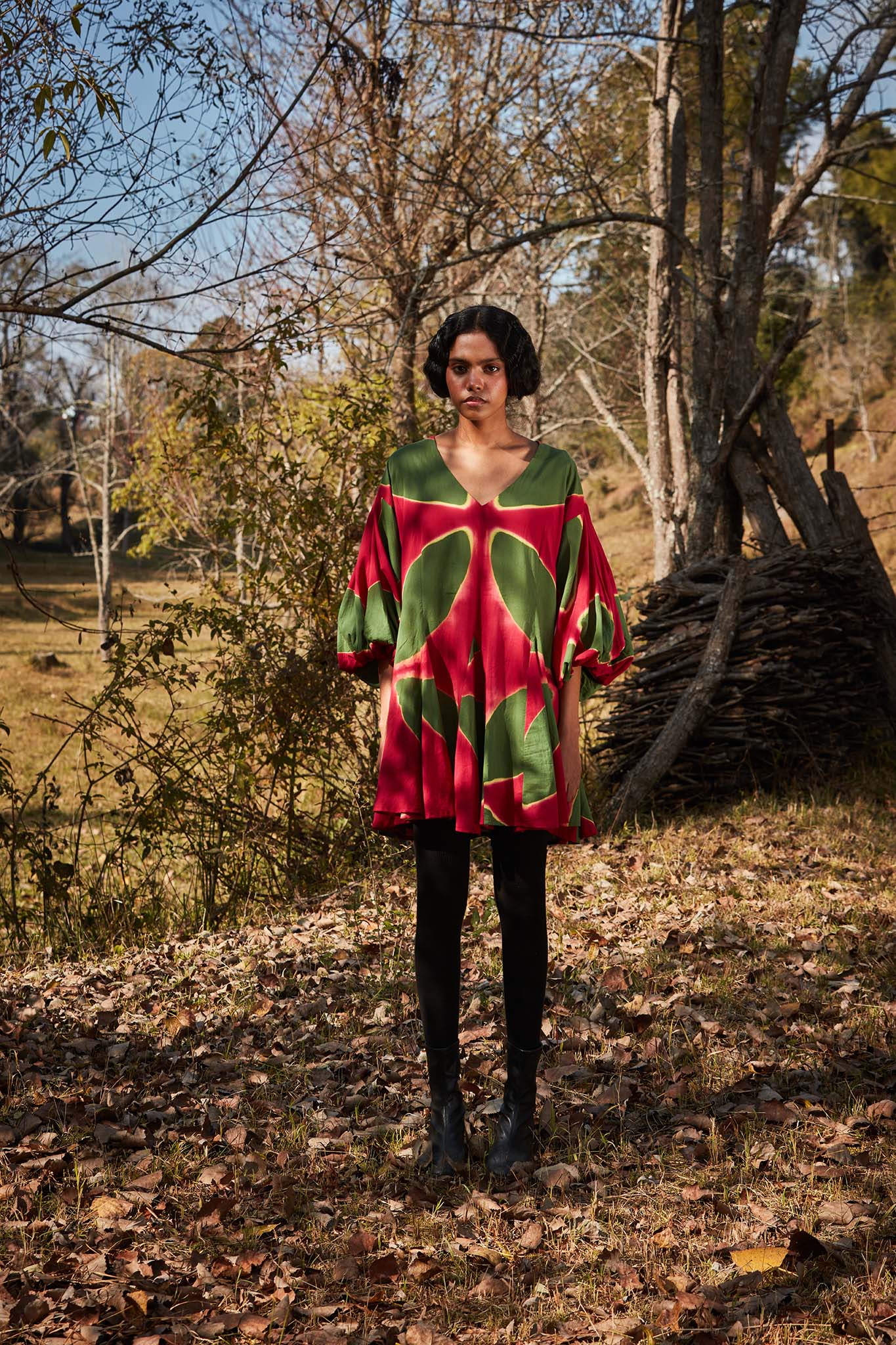 A one-of-a-kind vibrant cotton Shibori dress, dyed in pink and green, featuring puffy elasticated sleeves and a flattering V-neckline for a bold, distinctive look.