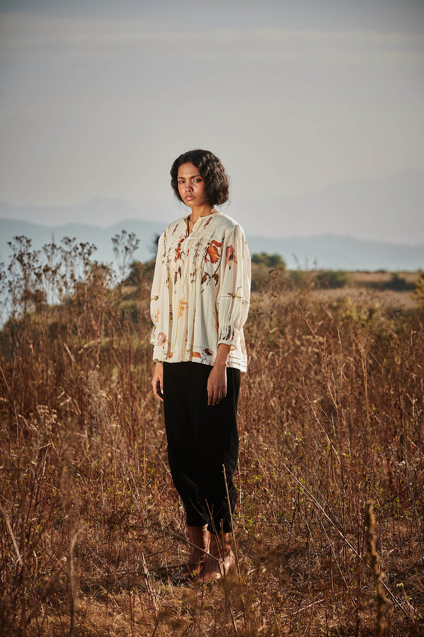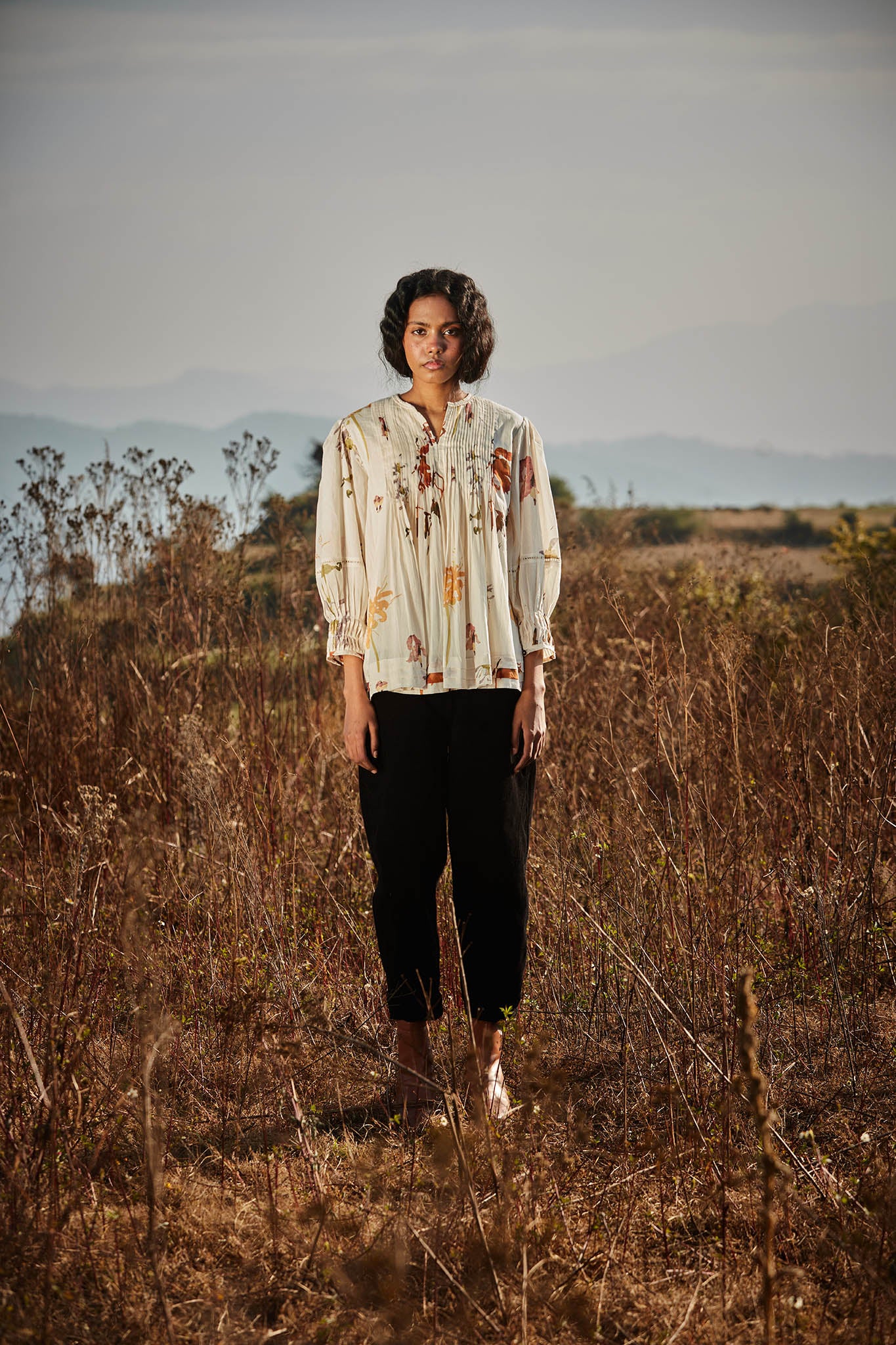 An off-white top with a delicate floral print that evokes the image of flowers scattered across snow. It features pin tuck detailing on the front, back and sleeves, adding subtle texture and elegance.