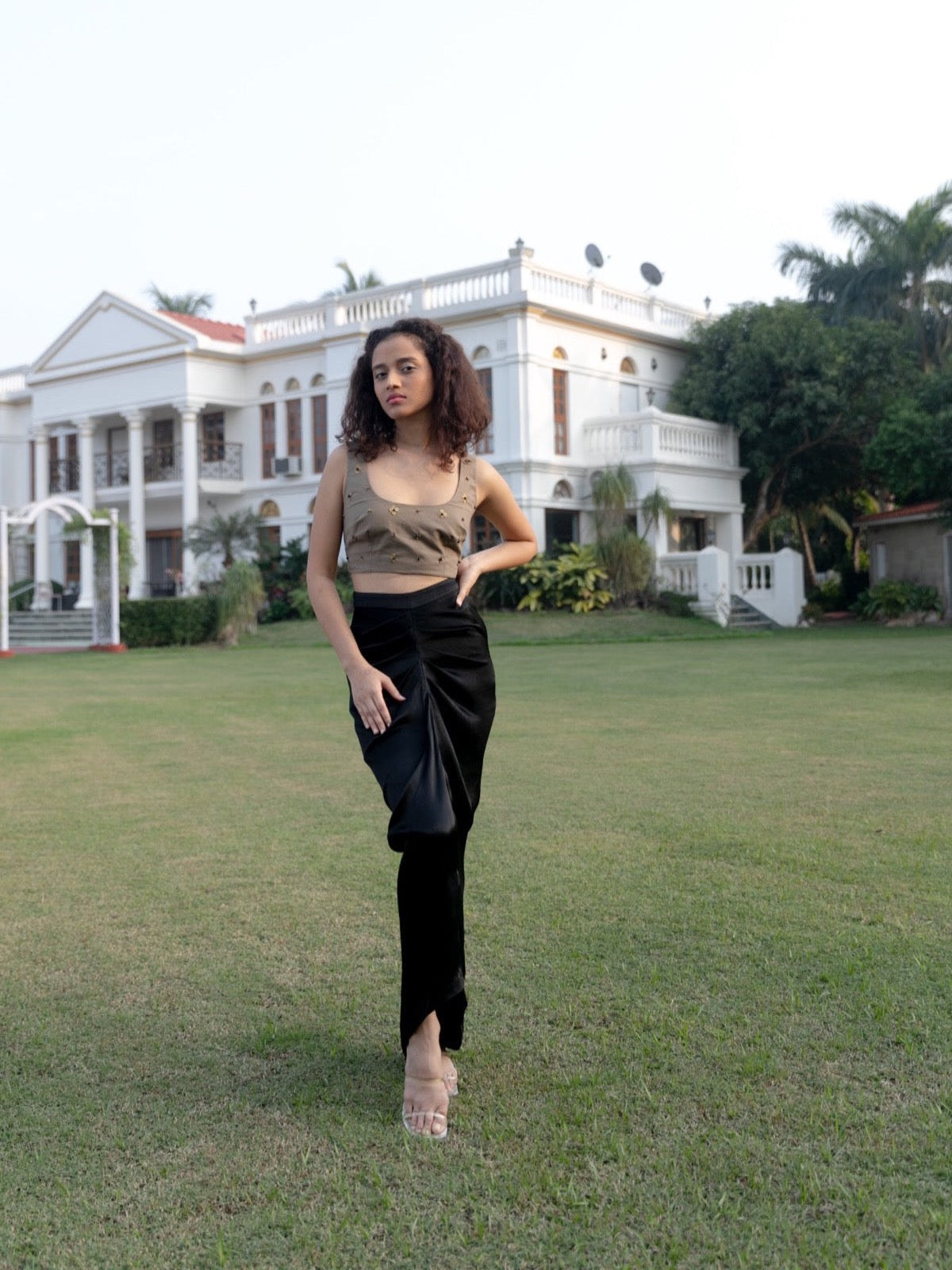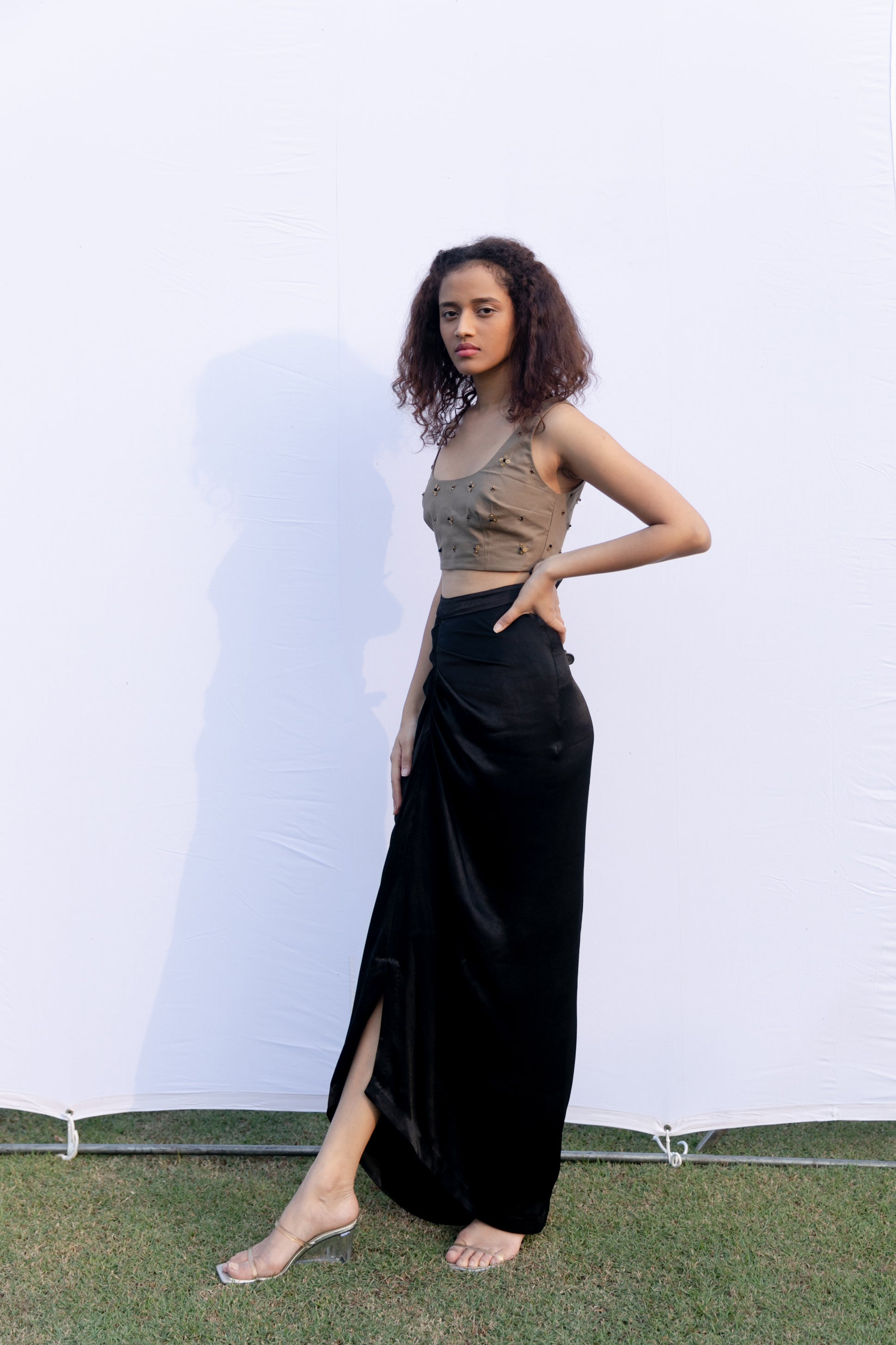 Hand embroidered metal bead cotton crop top with an